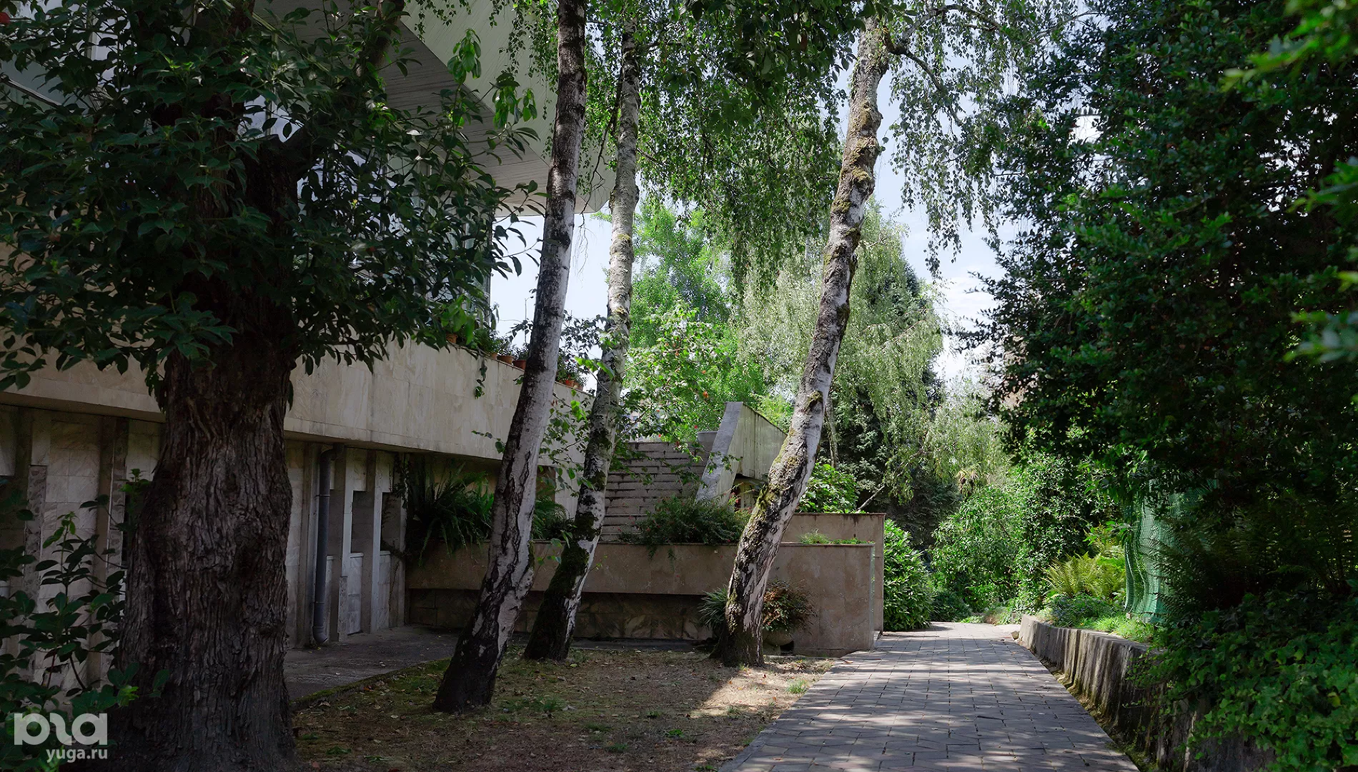 Войти в музей можно с улицы, поднявшись на второй этаж по наружной лестнице. Возле нее растут несколько берез, выглядящих экзотично на фоне субтропической растительности.