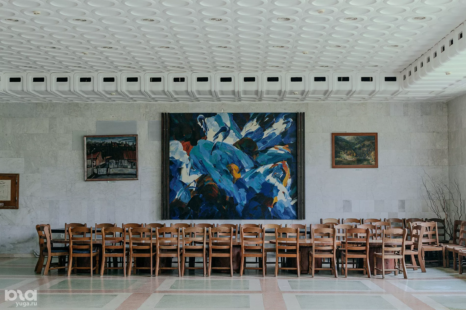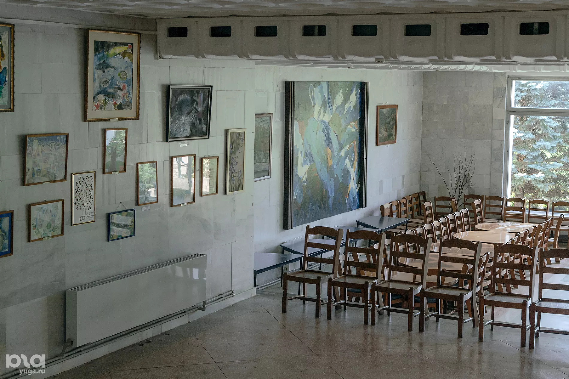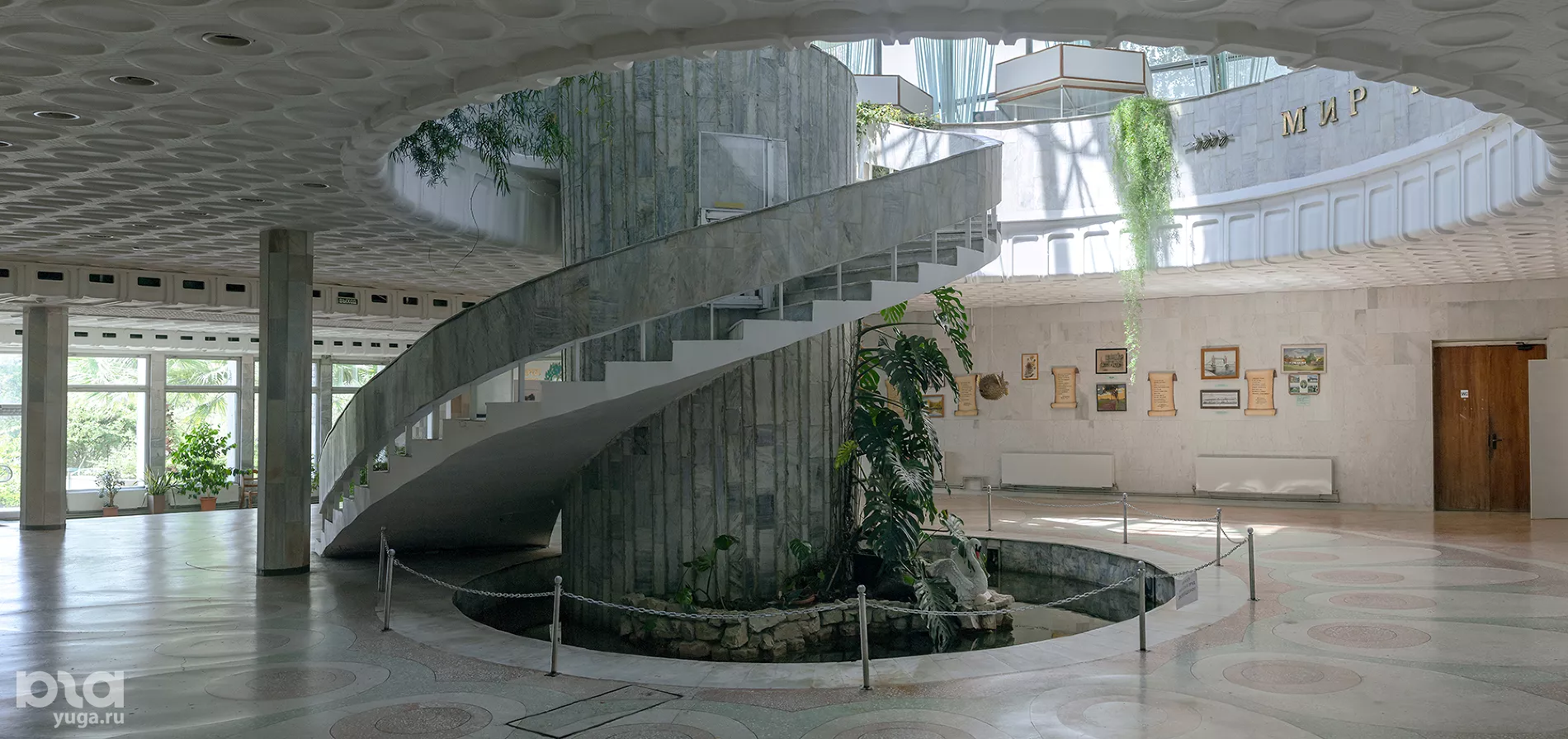 Несколько стен первого этажа павильона украшают копии архивных фотографий, на которых известные люди делают прививки к Дереву Дружбы. На остальных — полученные в дар картины и художественные панно.