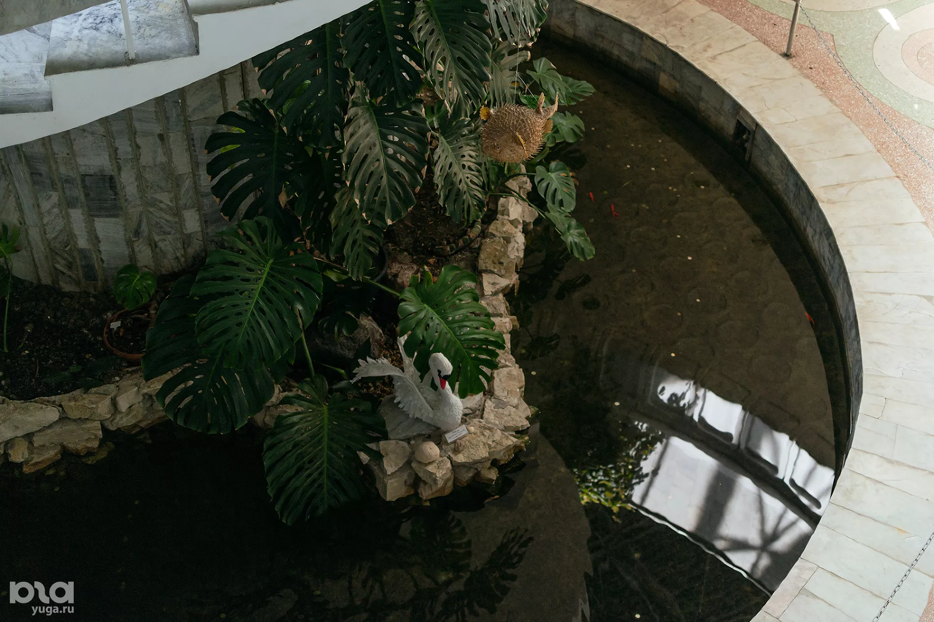 Первый и второй этаж соединяет изящная винтовая лестница. У ее основания — пруд с карпами кои и золотыми рыбками. Судя по монеткам на дне, туристы не против вернуться сюда еще раз.