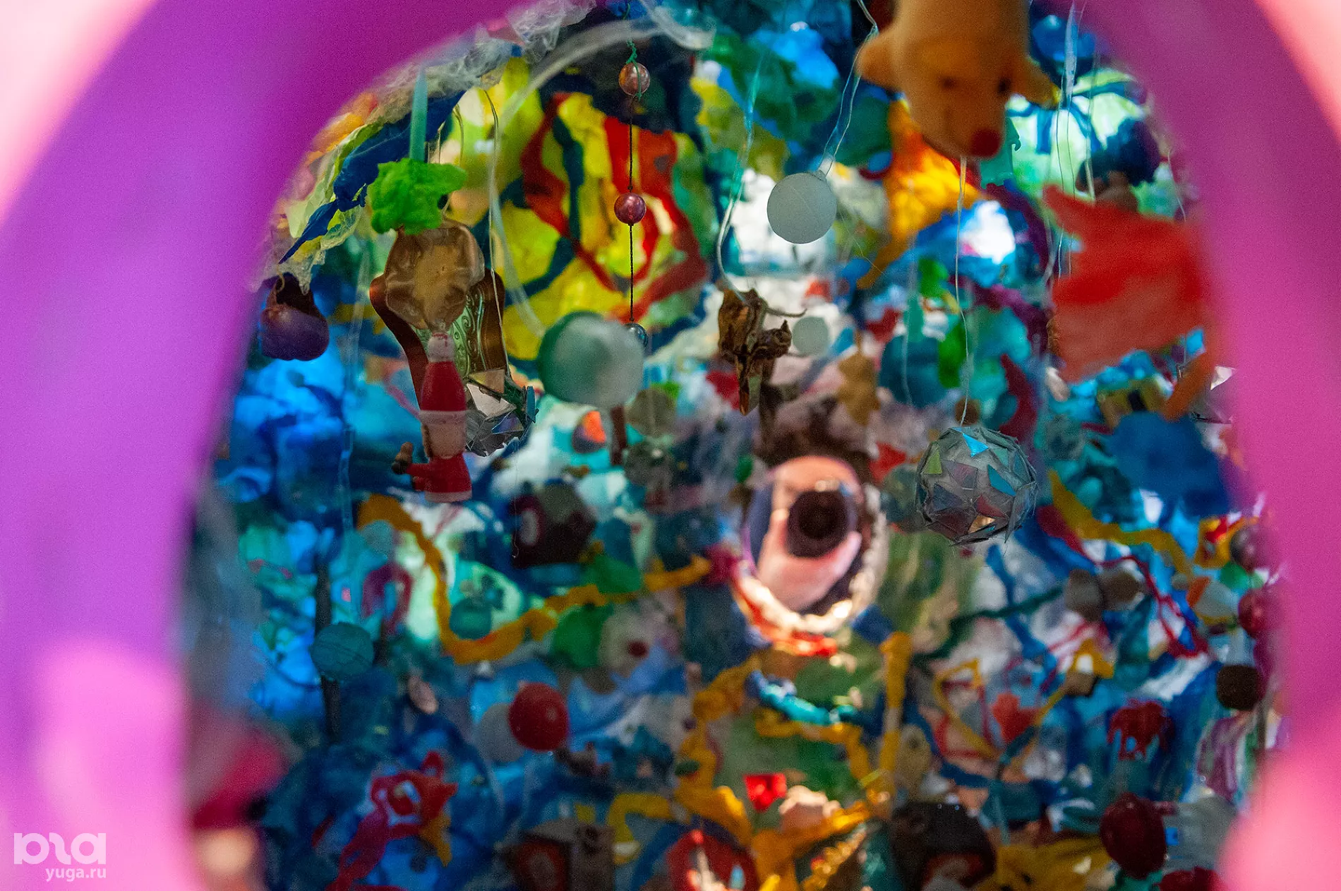 И дети прекрасные работы сделали, почему я и задумала продолжить «Жеребенок» и в последующие годы. У нас были выносные проекты — вот эти пирамида и шар, наполненный пластиковыми бутылками. Он был цветущей планетой. А пирамида состоит из 64 детских работ, победивших в конкурсе. Со всей России нам прислали 800 работ.