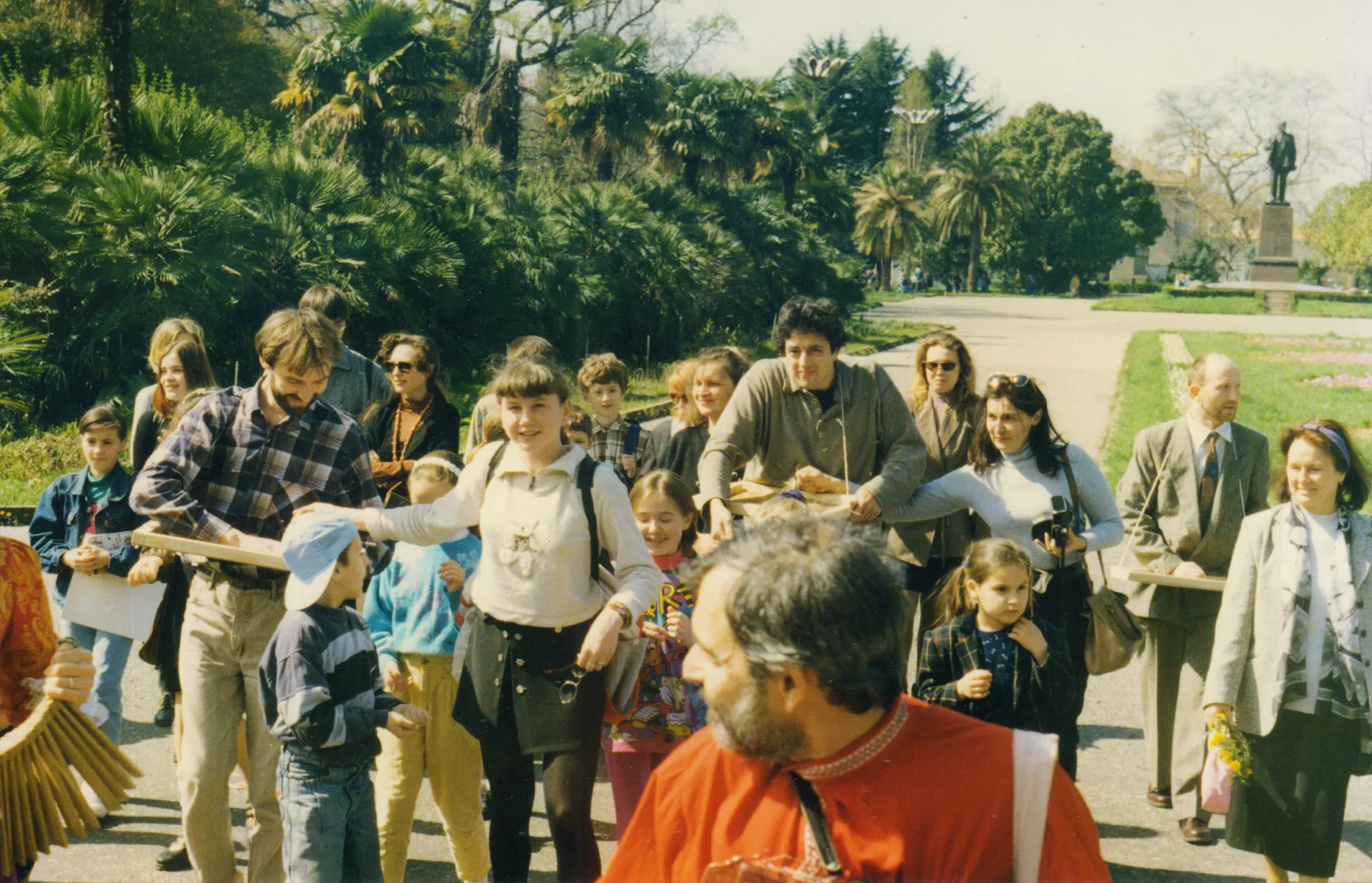 У подножия памятника развернулось многоплановое действо: ученики адлерской балетной школы исполняли танцевальные номера, воспитанники Детской художественной школы №1 (где преподавали Галина Поплавская и другие участники «Гильдии») рисовали мелками на асфальте «космические» сюжеты и копии шедевров мировой живописи, включая «Джоконду» Леонардо да Винчи. Одновременно активисты движения «Гринпис»* проводили сбор подписей в защиту экологии Черного моря. Художники запустили в небо гелиевый шар с призывом «за чистоту Черного моря», а Олег Корчагин и Даниил Да исполнили популярную советскую песню «Я — Земля, я своих провожаю питомцев».