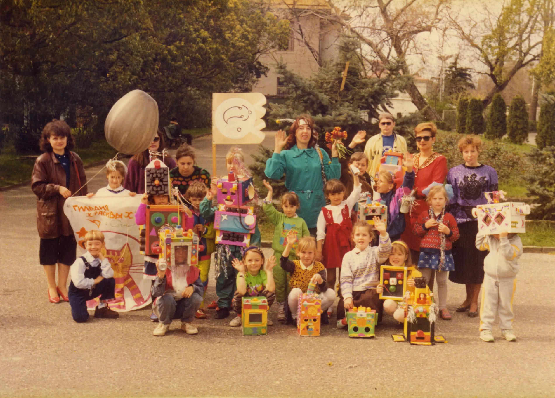 Гильдийцы часто устраивали шествия по городу, приглашали прохожих на выставки, любили появляться в центре Сочи в тантамаресках [стенд для фотосъемки с отверстием для лица — Прим. Юга.ру] с комичными сюжетами, развешивали огромные сердца и губы из папье-маше в электричке Сочи–Туапсе, не чурались сплясать на новогоднем капустнике в Зимнем театре с ряженой Бабой-ягой. Одновременно они разрабатывали сложные концептуальные проекты: закрывали картины шторами в музее, создавали провокационные работы в жанре ню для выставки к 8 марта (к примеру, художник Игорь Евсеев в совместной с Игорем Максименко фотоработе зашифровал на языке жестов фразу «Женщина как квинтэссенция времени»), сооружали тотемный столб из обуви. На протяжении всех лет «Гильдия красивых» вторгалась в пространства города и музея, утверждая, что весь мир может быть площадкой для художественного высказывания, и стирая грань между искусством в специально отведенных для него местах и повседневной средой.