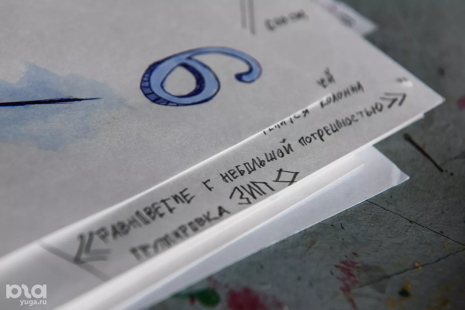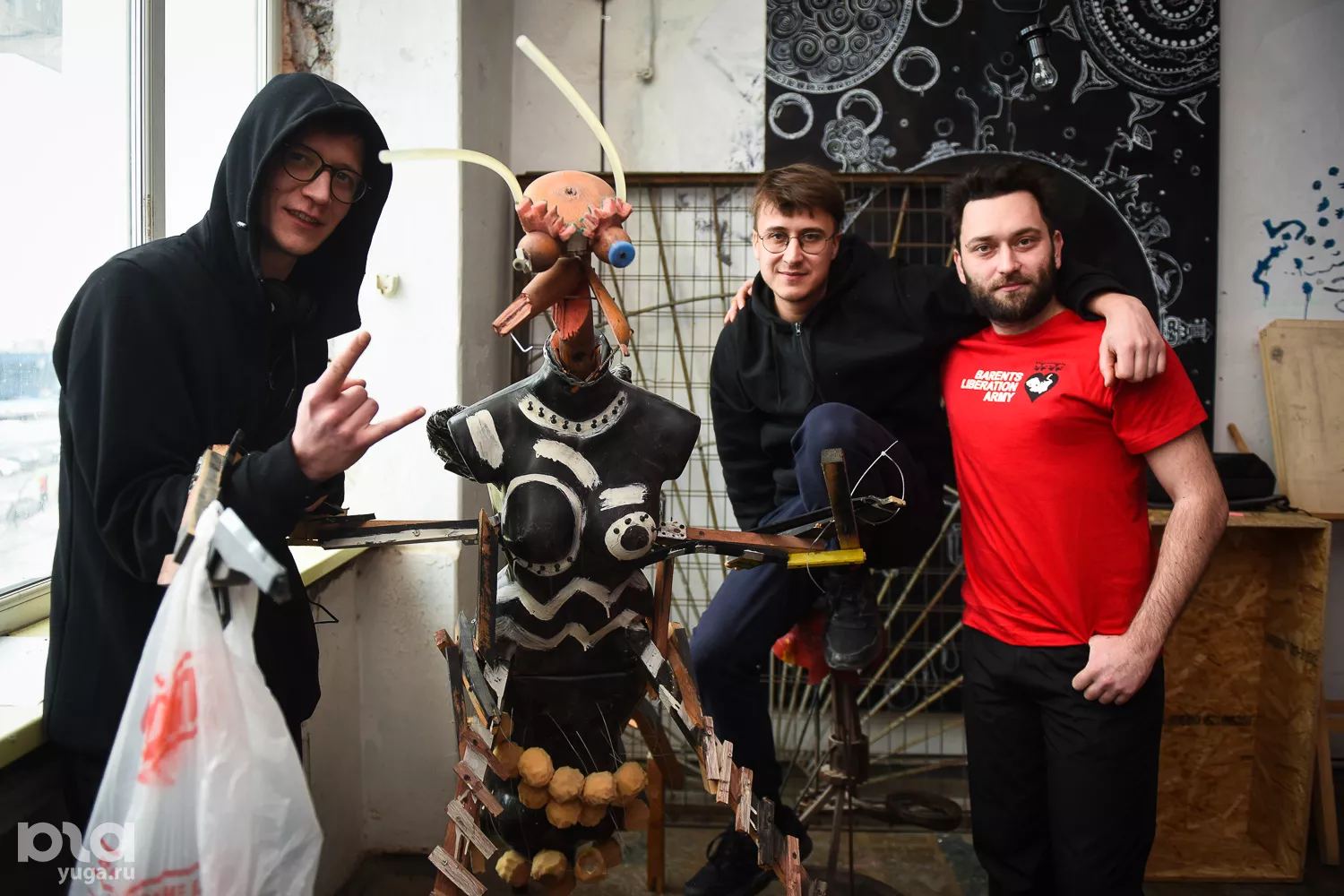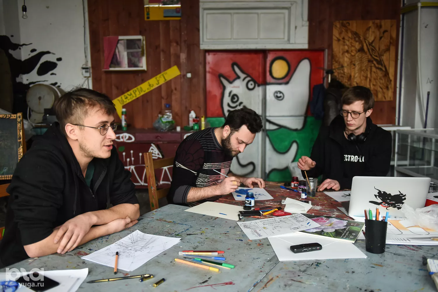 Степан: Мы рисуем эскизы для «Баренц-Спектакль» [международный арт-фестиваль — прим. Юга.ру] в городе Киркенесе в Норвегии. Премьера запланирована на февраль. Вася рисует логотип — это скрещенный оленебык. Я рисую, как будет выглядеть пространство, а Жека рисует для другого проекта игральные карты.