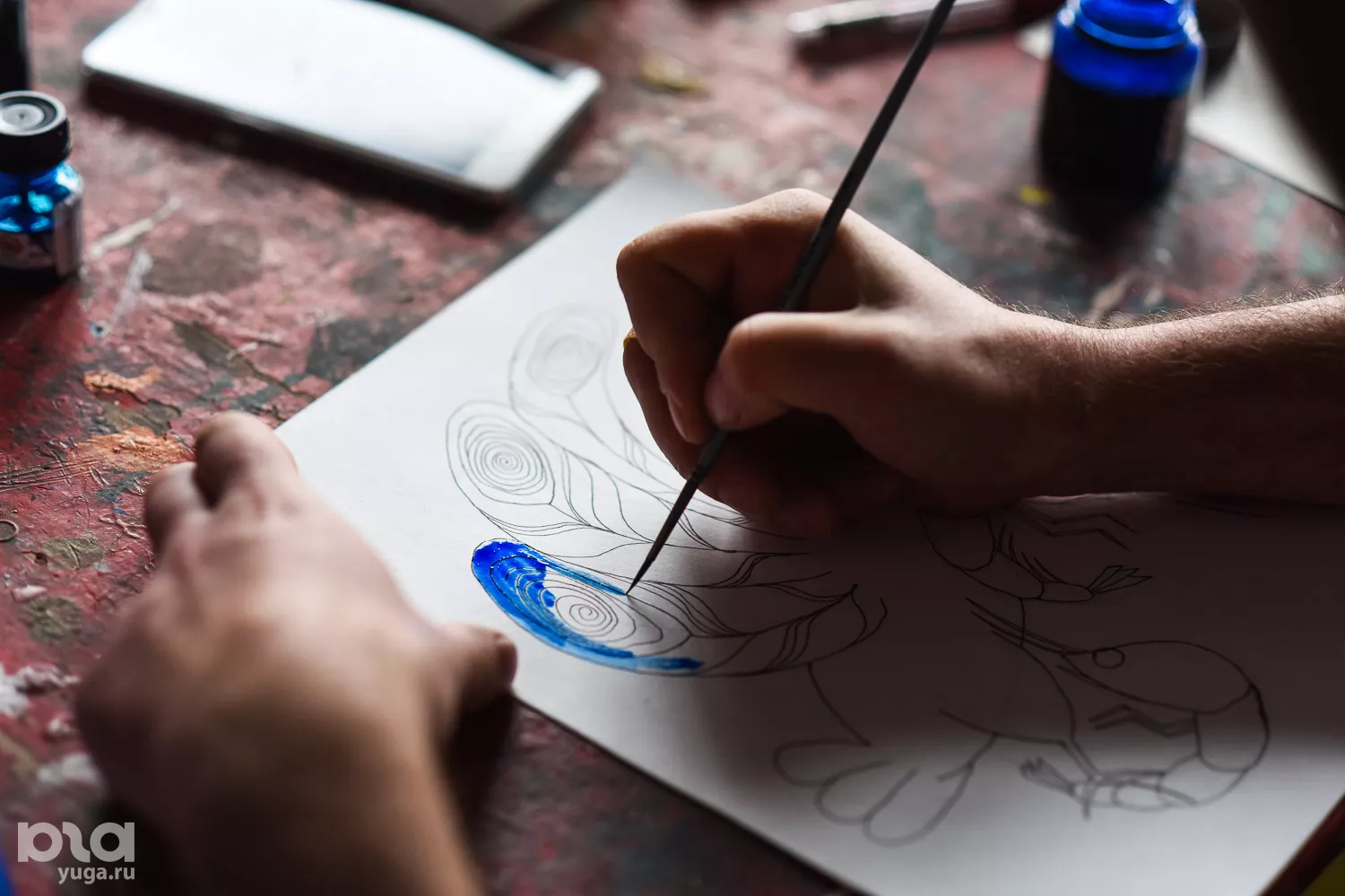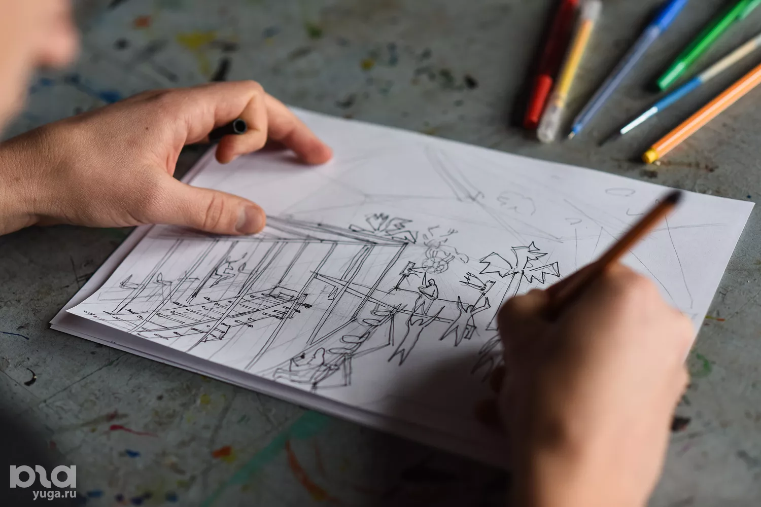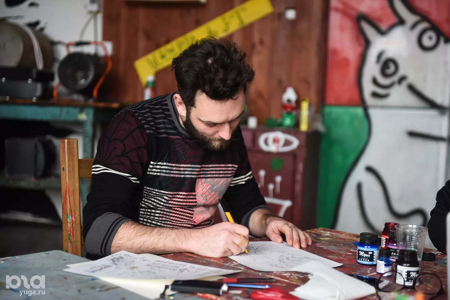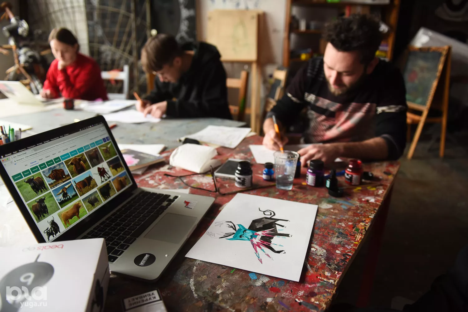 Степан: Мы рисуем эскизы для «Баренц-Спектакль» [международный арт-фестиваль — прим. Юга.ру] в городе Киркенесе в Норвегии. Премьера запланирована на февраль. Вася рисует логотип — это скрещенный оленебык. Я рисую, как будет выглядеть пространство, а Жека рисует для другого проекта игральные карты.