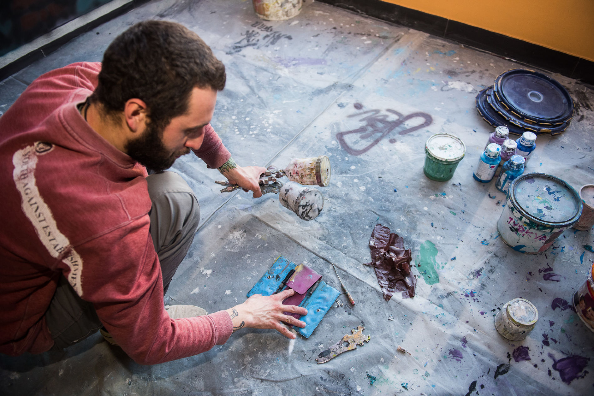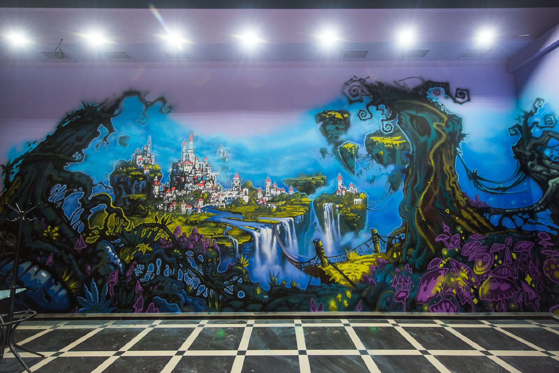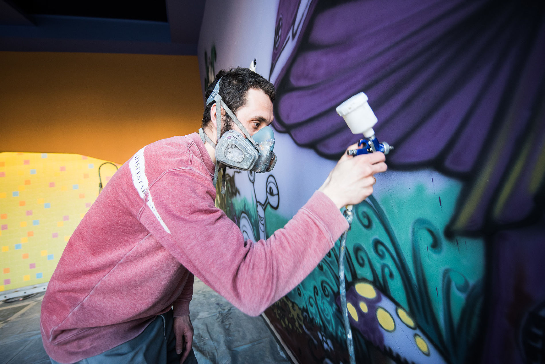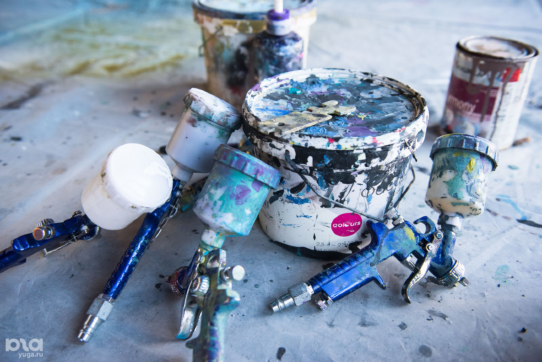 Классическая аэрография напрямую связана с росписью автомобилей. У людей очень четкая ассоциация с этой техникой росписи — это, мол, про машины история. Также аэрография применяется для росписи ноутбуков, небольших работ формата А4. А я делаю очень масштабные работы, большие объемы, это нетипично для аэрографии. Что важно, я работаю не аэрографом, а мини-краскопультом HVLP-системы. Использую в работе дисперсионные или водоэмульсионные краски. Это самая обычная краска для ремонтов, Caparol или Tikkurilla. Она меньше воняет, чем автоэмали и нитрокраска. Но и результат разный. Водоэмульсионка дает пастельные тона, мягкие переходы. Эмаль и нитрокраска позволяют делать контрастные, насыщенные, яркие работы.