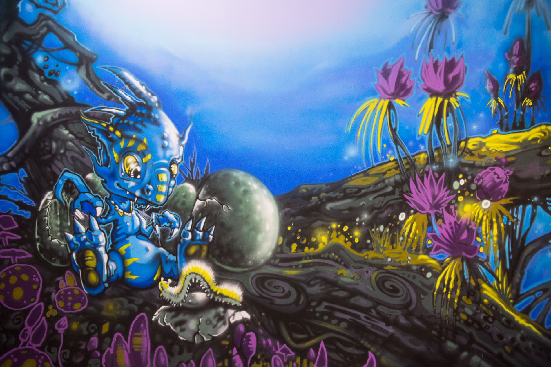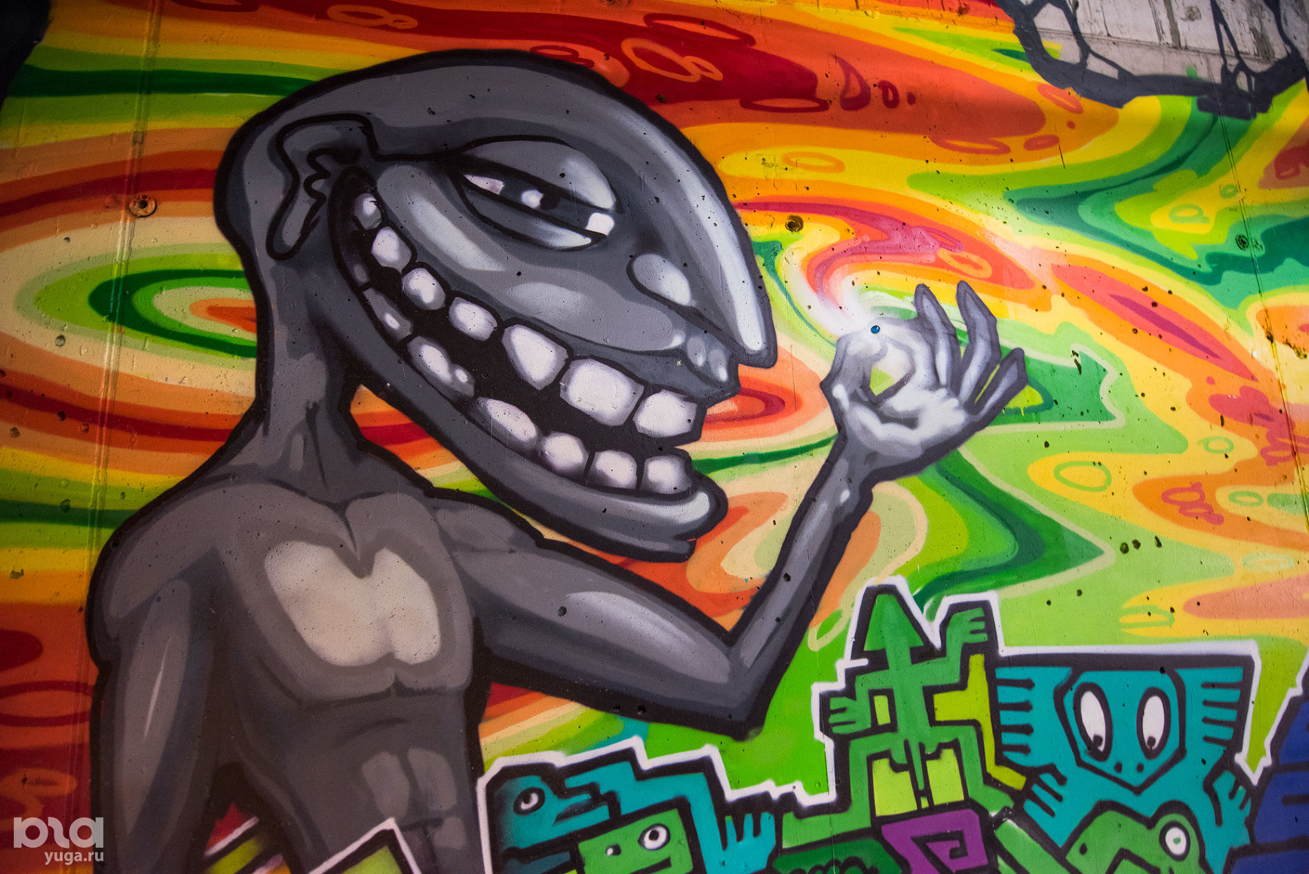 Куринов выбрал стиль, позволяющий максимально быстро понравиться публике. Своего рода поп-арт в граффити в своем стиле. К сожалению, это дорога не туда (для современного искусства, граффити, мурализма, стрит-арта — как хотите). Этот путь неплох для заработка, чтобы понравиться максимально большему количеству людей, по большей части не особо разбирающихся в данной сфере. Рисование фэнтези, особенно в его стиле, очень хорошо в это вписывается. Добавь много цвета, поиграй контрастами, сделай ставку на объемность. Что ни нарисуй в этом стиле — все зайдет массам на ура! Особенно в Краснодаре, где для нас это в диковинку.