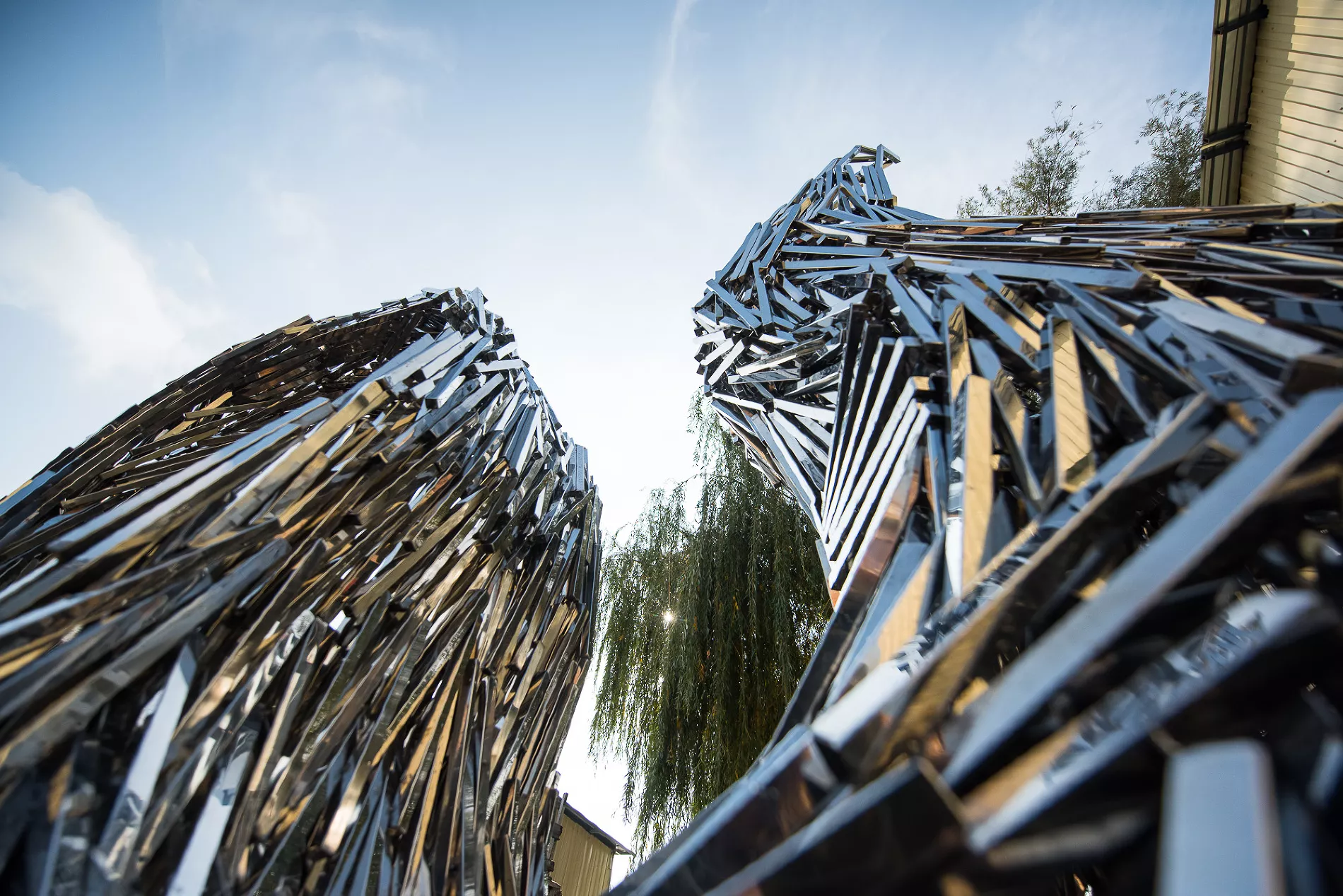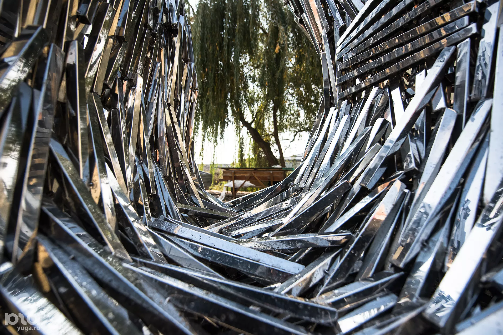 Скульптура сделана из нержавеющей стали, это отсылка ко всей истории паблик-арта. Многие знаковые художники, в том числе Дэмьен Хёрст, Аниш Кашпур, использовали именно нержавейку, это функциональный и долговечный материал. Кроме того, есть отсылка к конструктивизму в визуальной перекличке Draped Data с Шуховской башней. Если все убрать и оставить только корпус скульптуры, это будет более заметно.