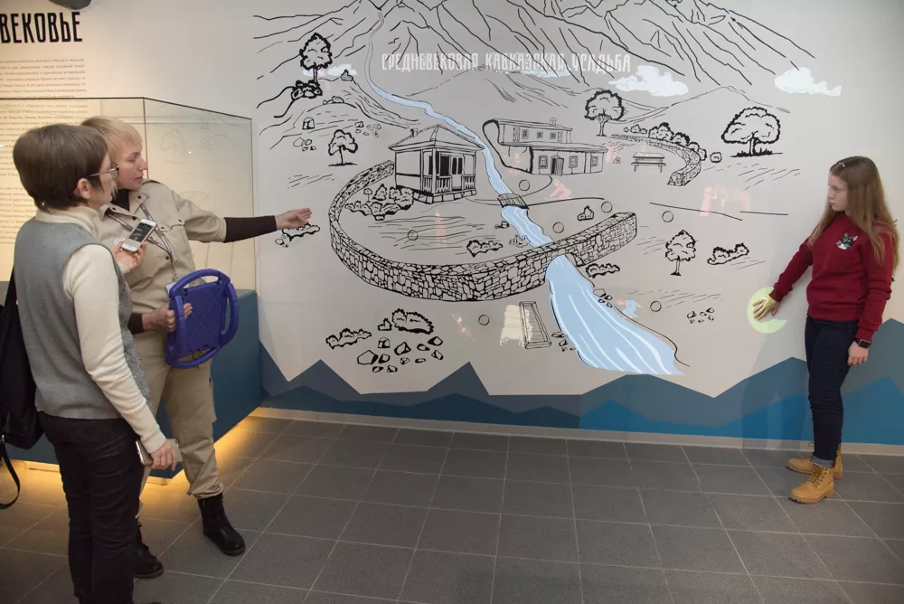 Мы перемещаемся в Средневековье. Главная особенность этой экспозиции — интерактивная стена «Средневековая кавказская усадьба». Она вызывает восторг у самых маленьких посетителей музея: нажмешь на кнопку — идет дождь, пастух ведет стадо овец горной дорогой, с помощью каменных жерновов девушка готовит муку, мужчины чинно сидят за столом.