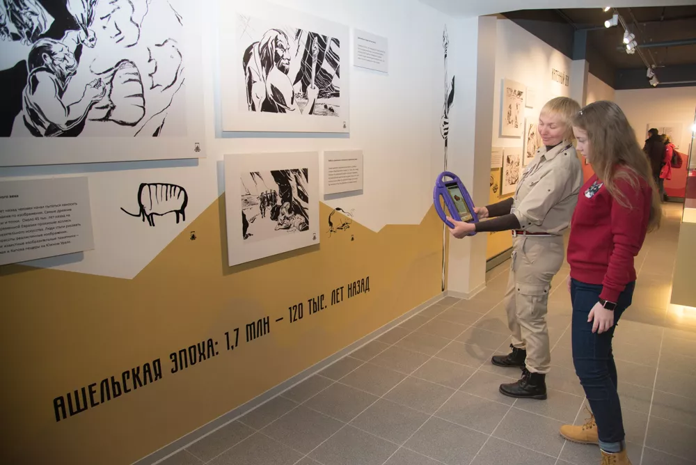 Аня наводит планшет на каменные орудия труда, чтобы познакомиться с процессом их производства. Например, здесь есть рубило, которому уже более 100 тыс. лет, оно было найдено на «Розе Хутор» в 2010 году. Но особое впечатление производят искусные наскальные рисунки.