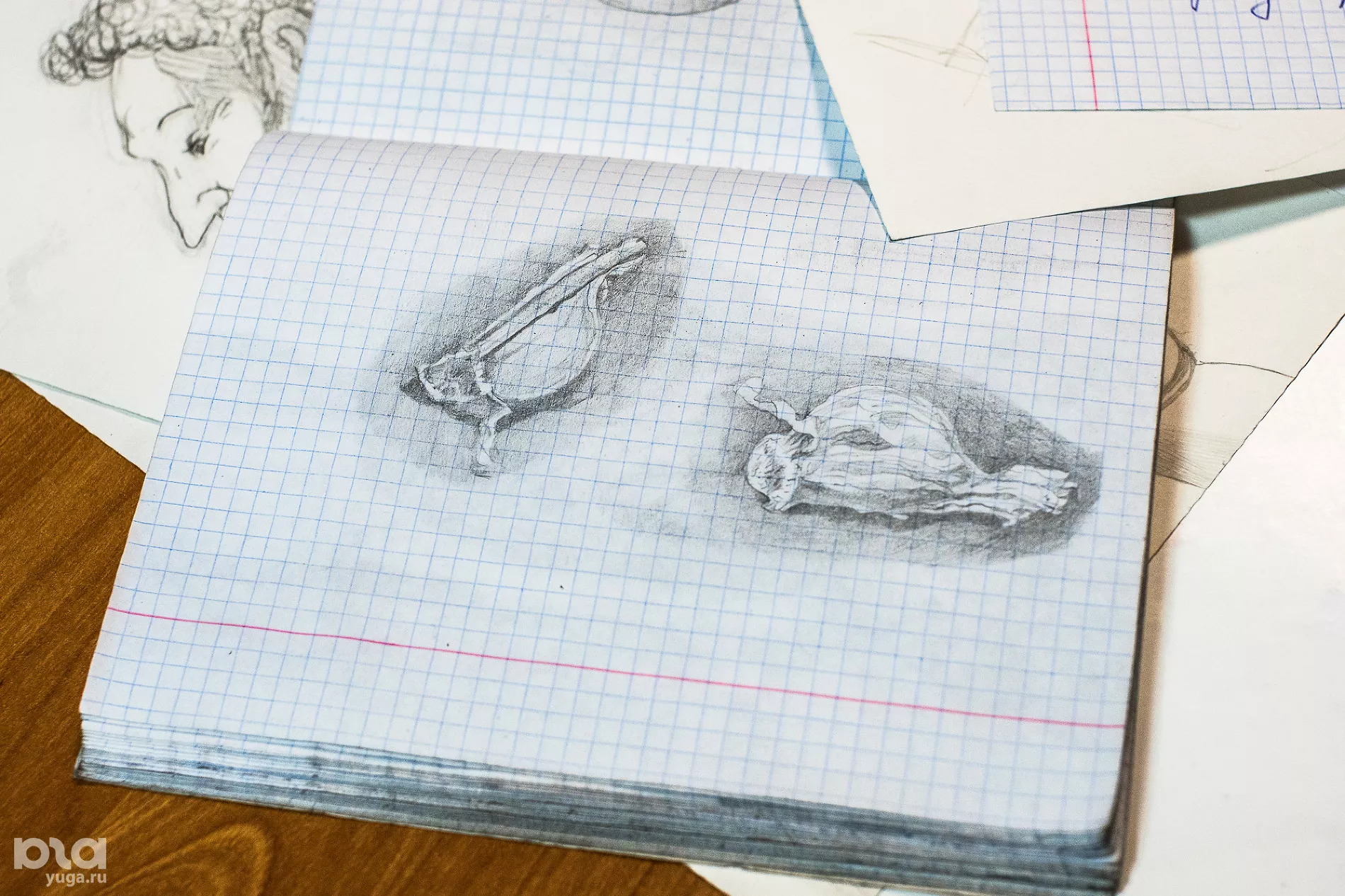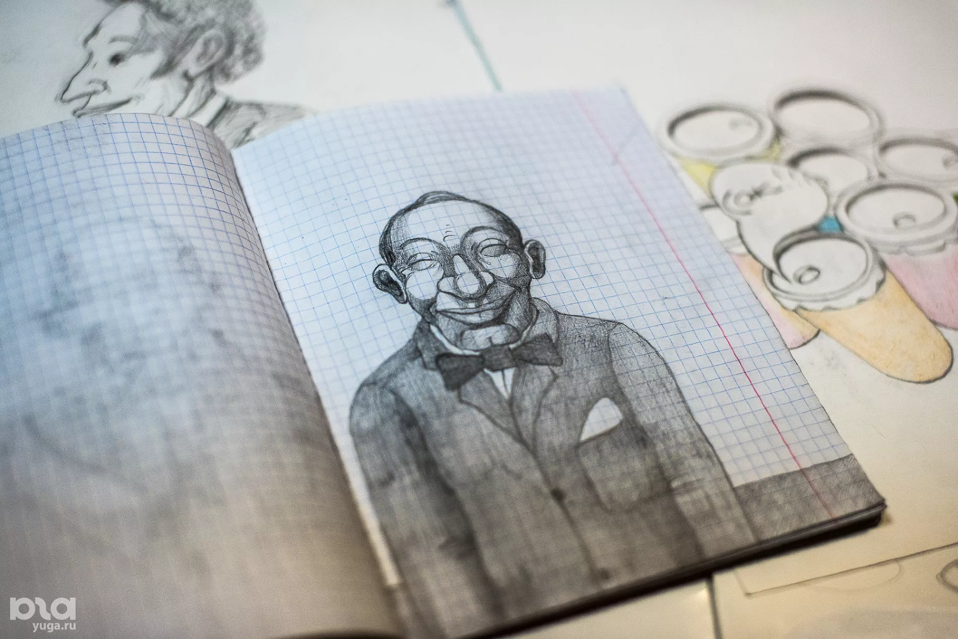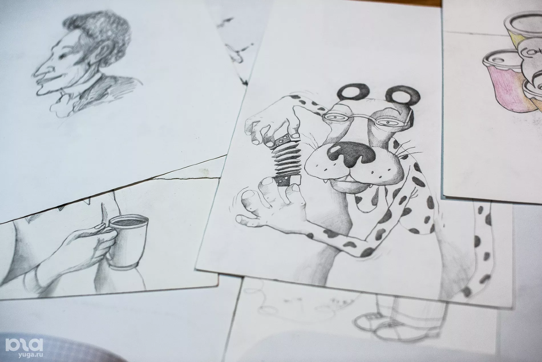 — Вообще люблю рисовать карикатуры, шаржи. Когда учился в университете, у меня был курс по кубанскому пейзажу. Сейчас портреты карандашами рисую, просто вымышленные, мультяшные персонажи. Или вот Пушкина по памяти. Сюжеты беру из воспоминаний в основном. Еще когда в школе учился, хотел на «Союзмультфильм» поступить художником. После университета два года в школе работал, и потом что-то не получилось с «Союзмультфильмом». Сейчас проще, можно через интернет какие-то ролики делать.
