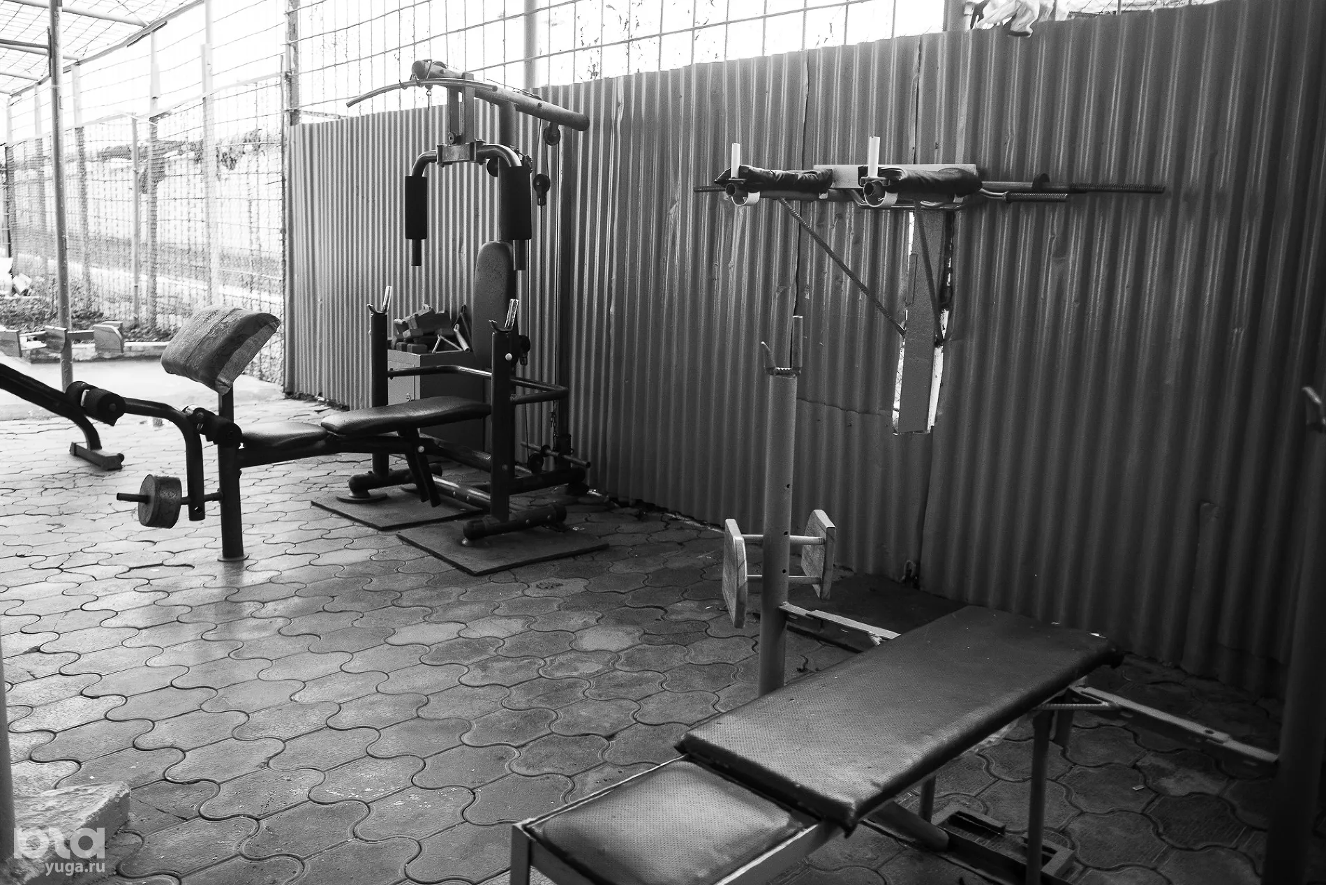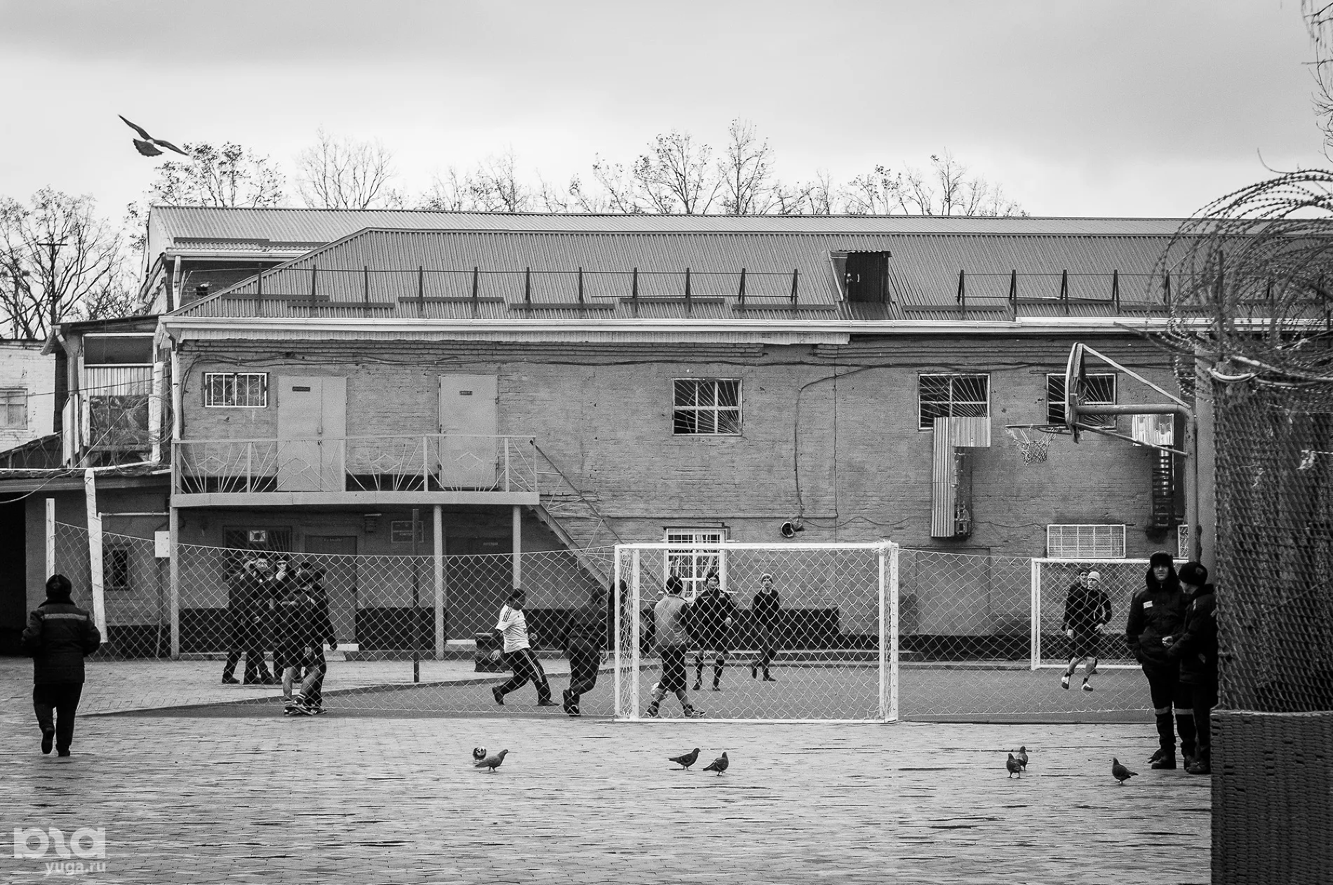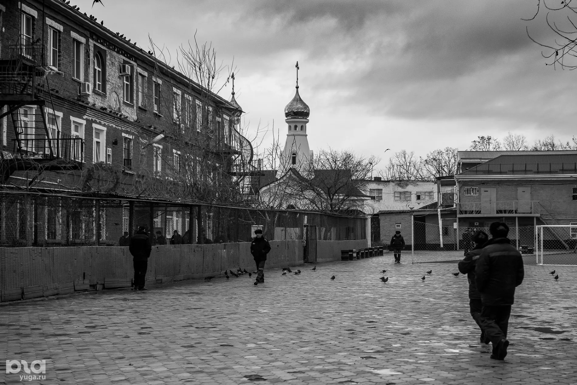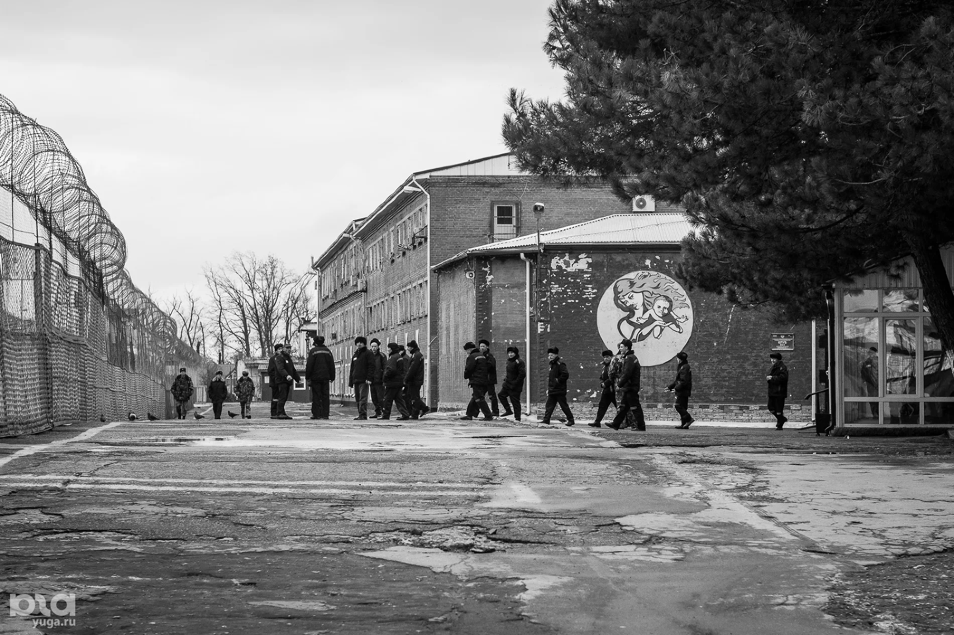 За КПП начинается территория, на которую уже нельзя просто так попасть, но где еще нет заключенных. Здесь занимаются своими делами сотрудники колонии и приходят на свидания посетители. Стоит смотровая башня, высокий забор с колючей проволокой и через несколько метров закрытой территории еще один такой же забор. Дальше — сама колония. Мы проходим через еще один досмотр, сдаем удостоверения и телефоны, проходим через несколько дверей с решетками и оказываемся на плацу.