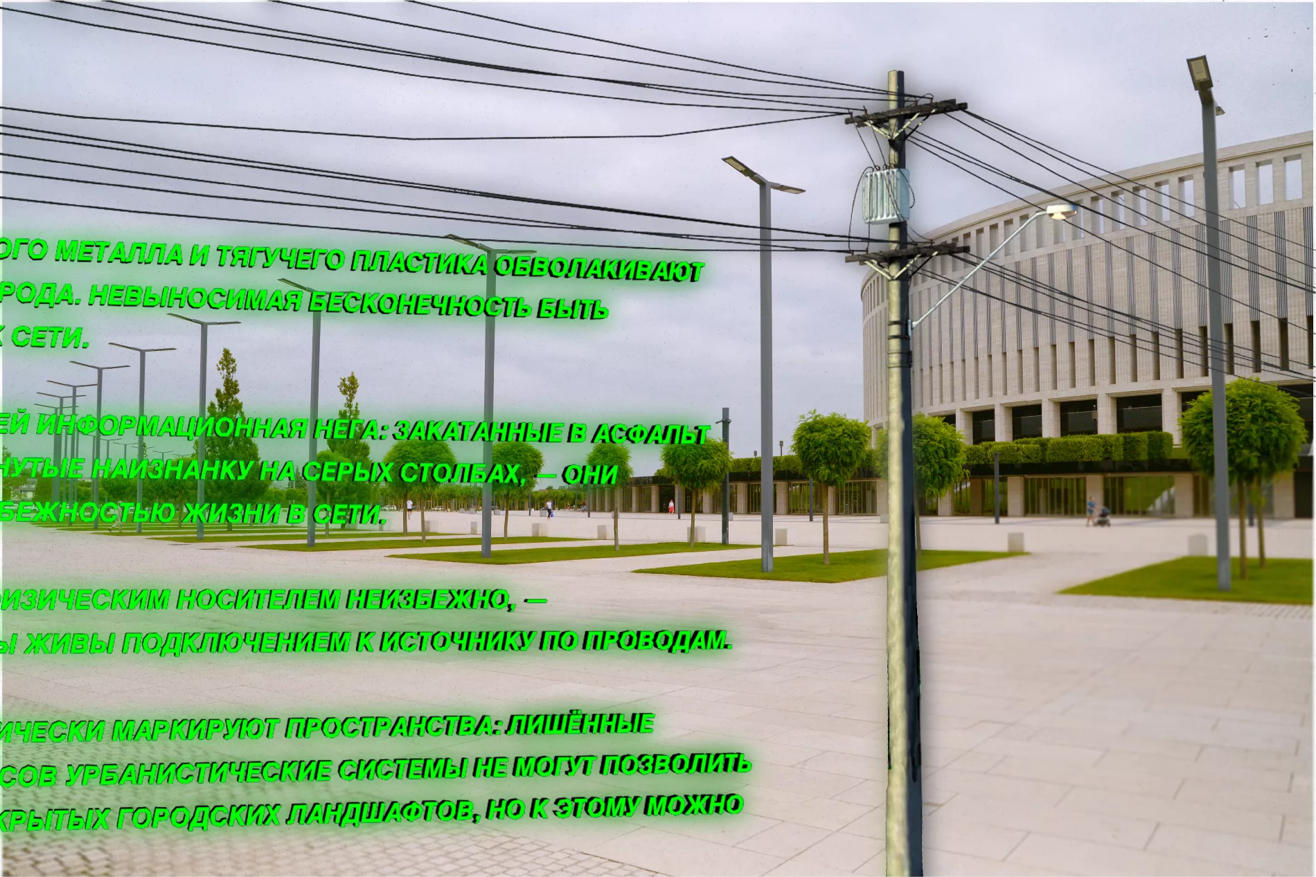 Идея нашего объекта в том, что вместо того, чтобы пытаться скрыть системы коммуникаций, мы наоборот предлагаем людям поставить ещё больше, вырастить ещё больше столбов, вообще всё заполонить этими столбами, и тем самым победить некую баннерную слепоту. Когда мы живем в городе, мы уже не замечаем эти базовые коммуникации. Богатый город может себе позволить многие провода прятать под асфальт. А, например, в Азии провода на одном бедном столбе висят тоннами. Это интересный момент, который мало кто замечает — что наличие или отсутствие проводов это экономический показатель какого-либо района, местности или целой страны. Для нас с Сашей было важно это проработать. Мы решили бороться с этим «клин клином»: вместо того, чтобы убирать провода, мы наставили их ещё больше.