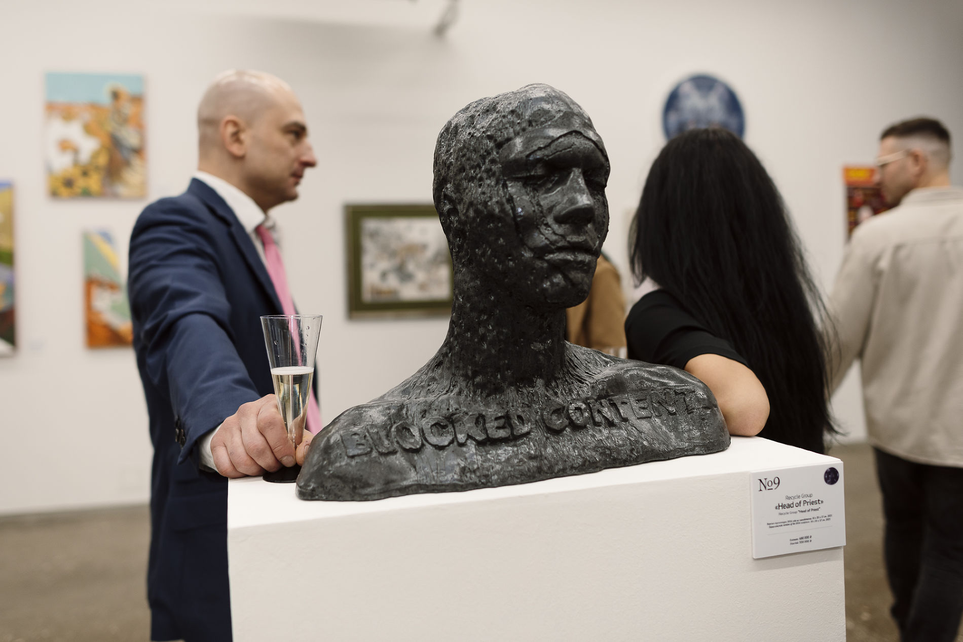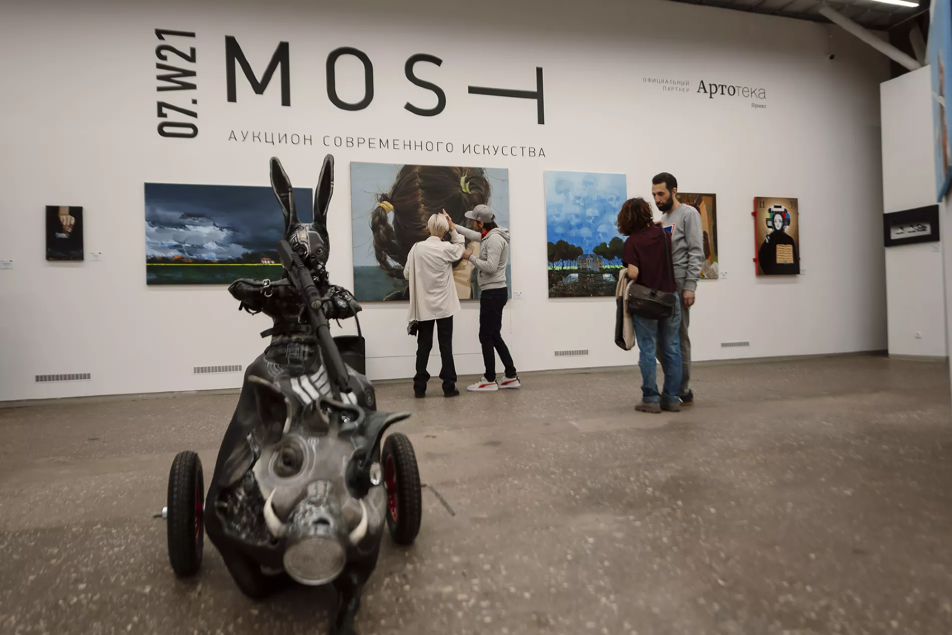 Что здесь продают? Картины, написанные в разных техниках, и арт-объекты (например, металлический «Заяц» Маши Богораз, бюст Recycle, голографический волк Максима Шкрета).