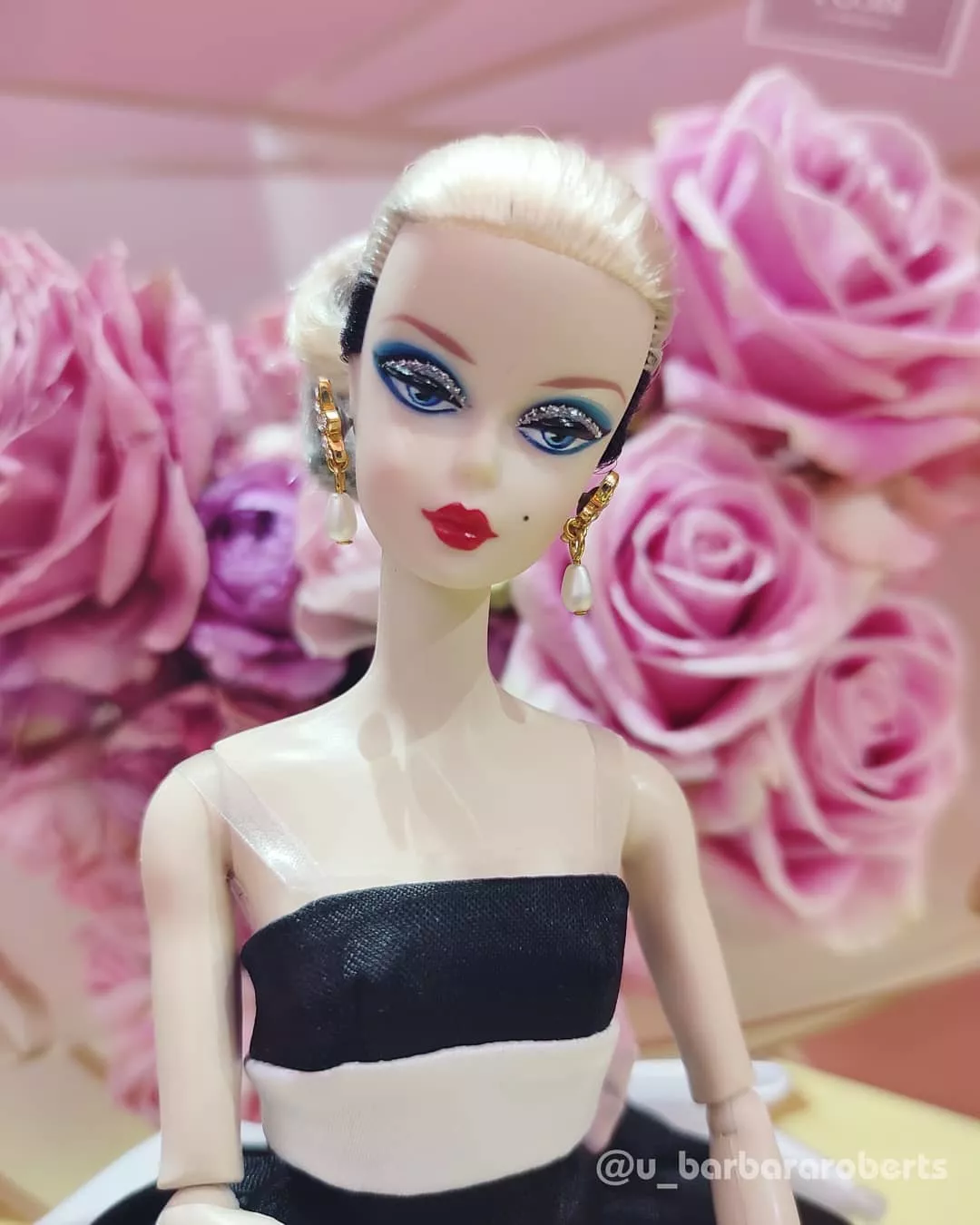 Barbie Black and White Forever Silkstone в атласном платье до пола с двумя бантами на спине. Создана в честь 60-летия бренда в 2019 году.