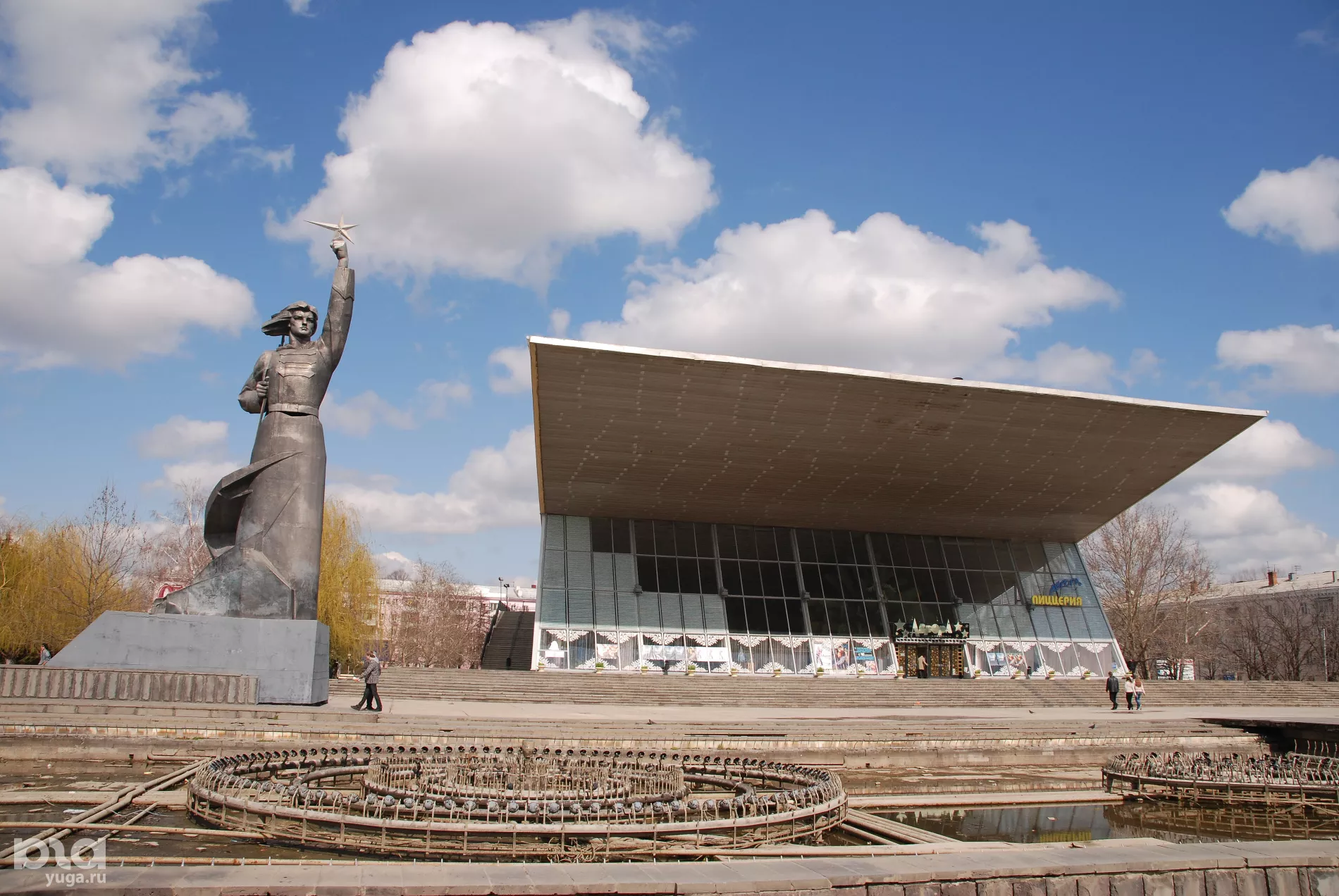В 1967–м на пересечении улиц Красной и Офицерской открыли необычное сооружение, которое удачно вписалось в облик города. В архитектурный ансамбль вошли сам кинотеатр, сквер с фонтанами и 16-метровая скульптура женщины. Её, кстати, создавали с реального человека — 20-летней Таисии Гордиенко, работнице шлифовального цеха одного из предприятий города.