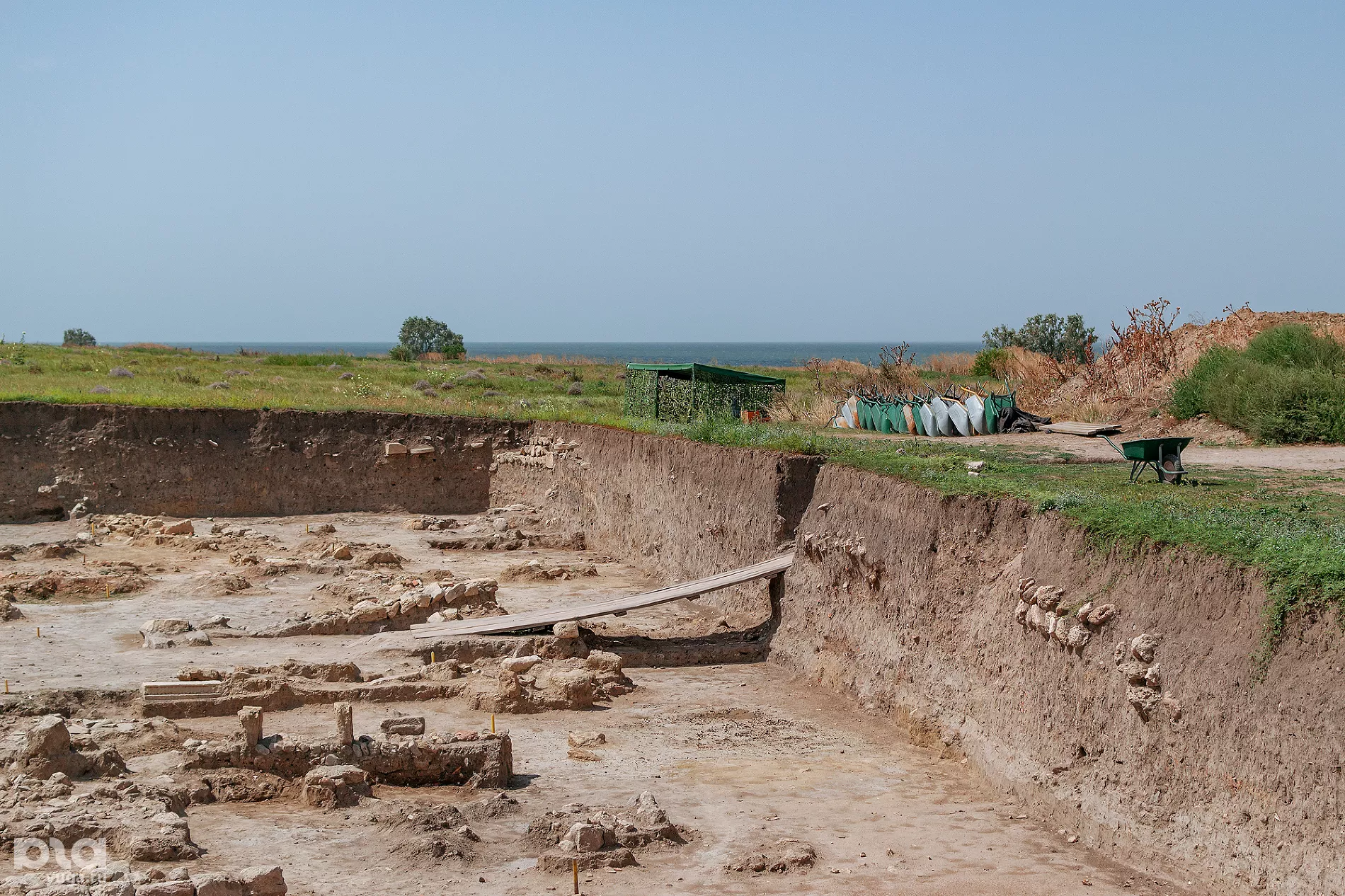 Но обычно главное — аккуратность и бережное отношение к источнику. Его важно не только найти, но и сохранить целым и наиболее информативным. Раскоп 50x40 метров разбит на квадраты 5x5 метров, обозначенные буквами. Этими квадратами археологи выкапывают пласты по 20 см в глубину и нумеруют их цифрами. Чем глубже, тем старше культурный слой. Так хазарские строения конца первого тысячелетия н. э. ближе всего к поверхности — под цифрами 5-7 (на глубине 1-1,5 метра), тогда как греческие или византийские постройки середины тысячелетия встречаются значительно глубже — начиная с уровней 13-15 (2,5-3 метра). В зависимости от сложности на один сегмент 5x5 метров и 20 см глубиной уходит от нескольких часов до двух-трех дней.