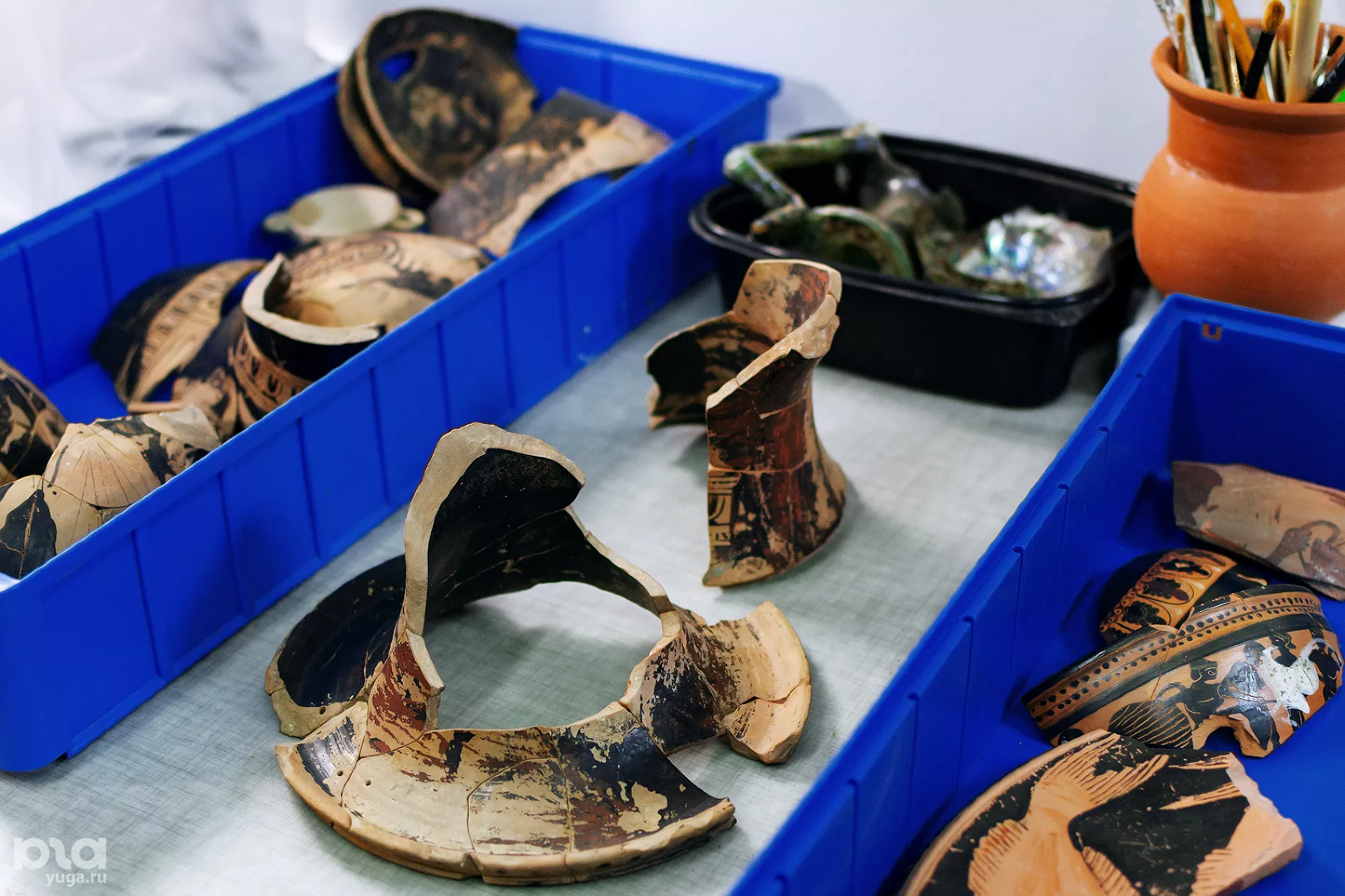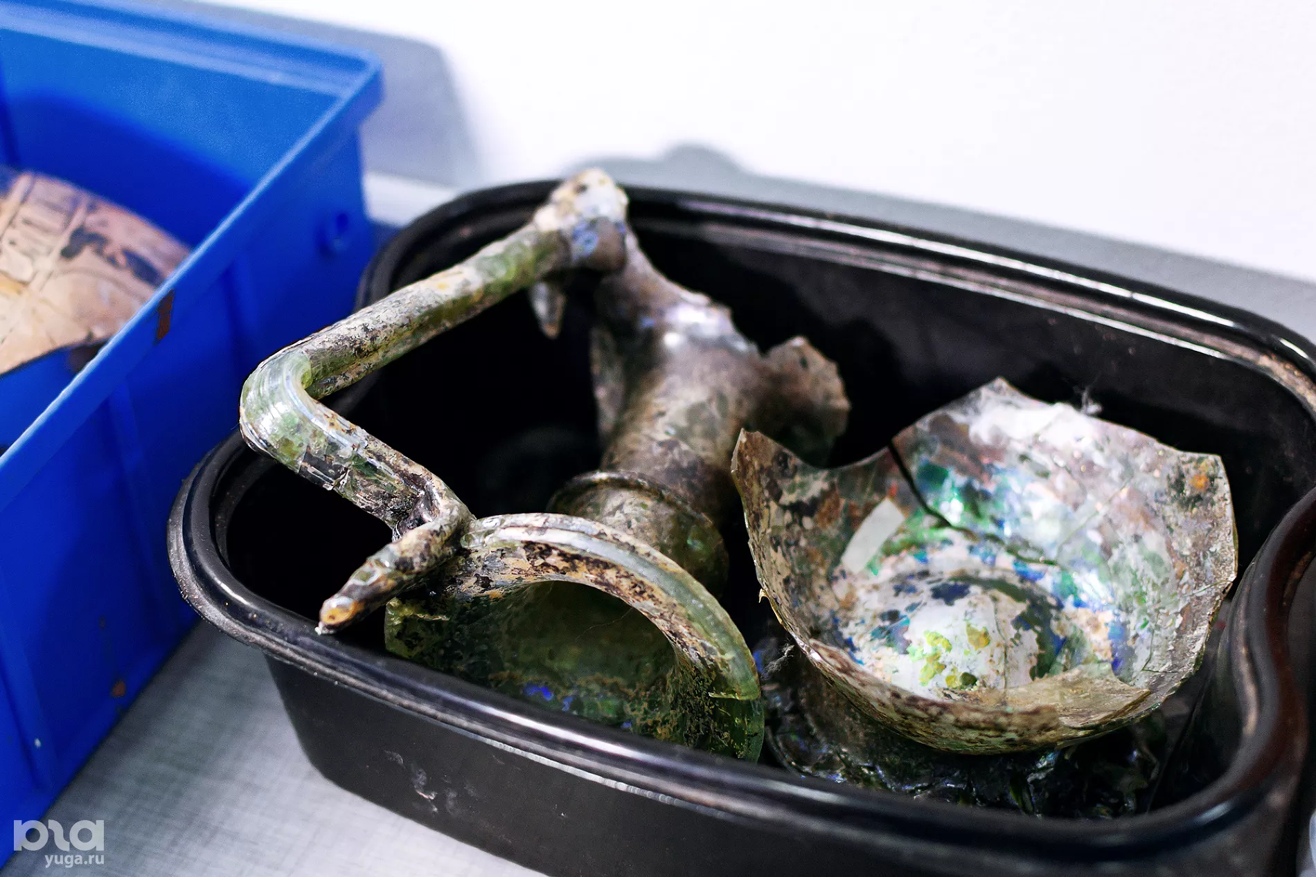 В лабораториях химики специализируются по материалу очищаемых объектов — больше всего металлических и каменных. Особое место занимает очистка деревянных предметов, найденных в морской воде: хранительница фондов Мария Чашук показывает контейнер с кусками корабельной древесины — ее положили в пресную воду, чтобы убрать разрушающую ее соль. Часть раскопок ведут под водой, и это касается не только кораблей. За две тысячи лет уровень моря поднялся и постепенно затопил около 200 метров суши, где раньше была прибрежная и портовая часть Фанагории первых веков н. э.
