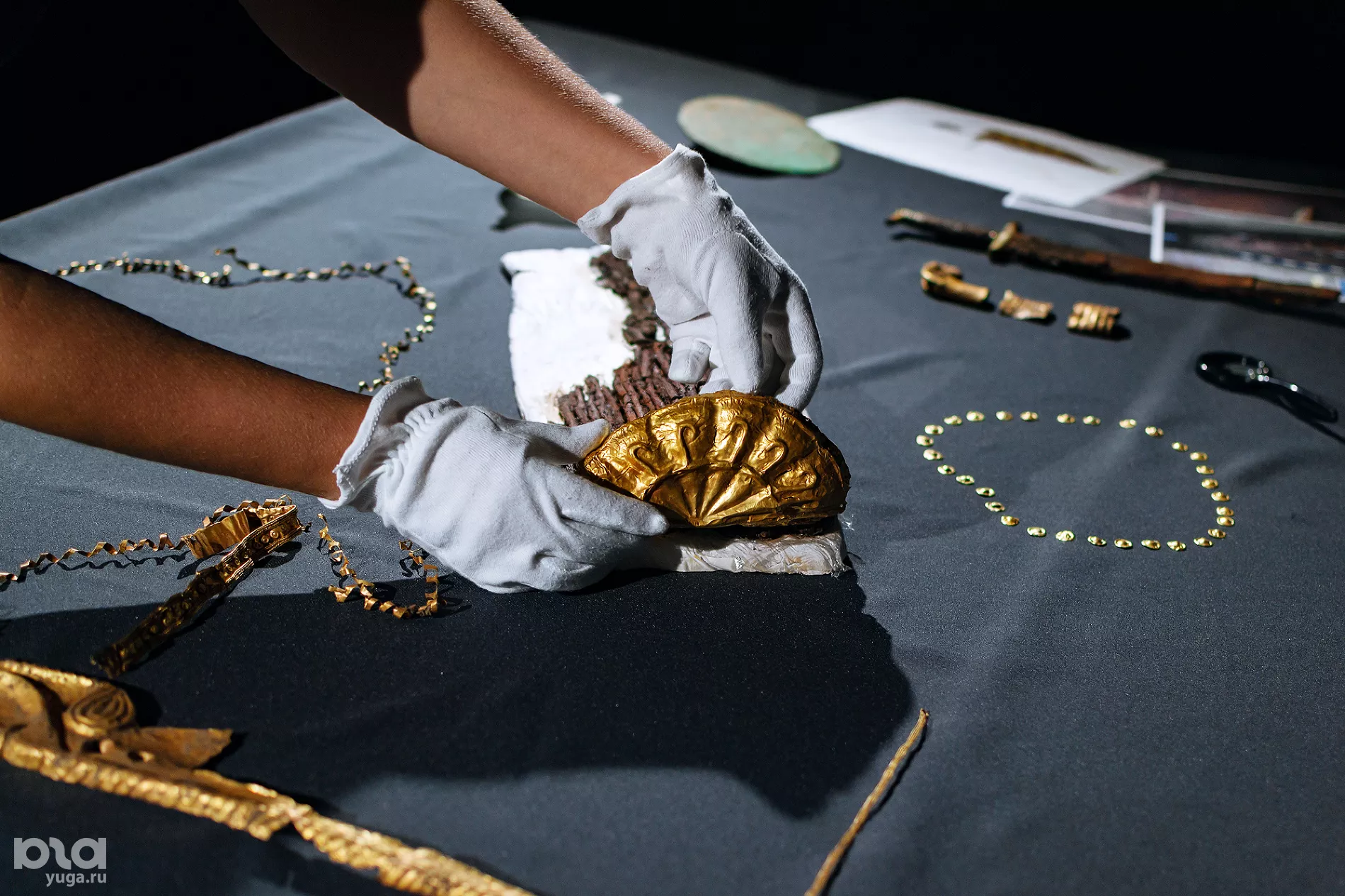 Находка 2019 года выложена, как говорит Чашук, в художественном беспорядке. Этими тонкими пластинами расшивали ворот одежды © Фото Юли Шафаростовой, Юга.ру