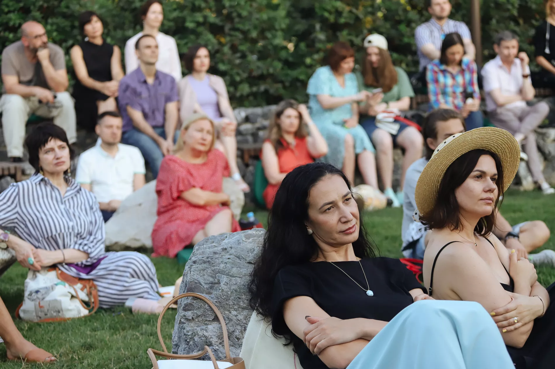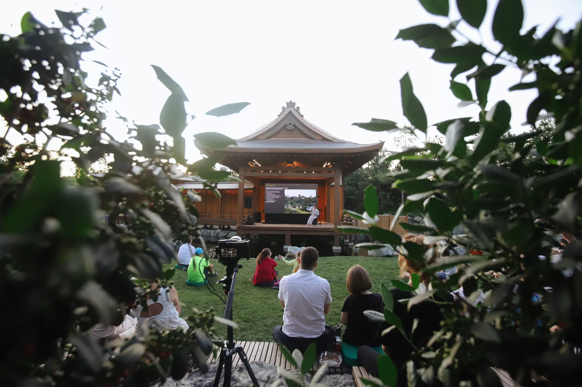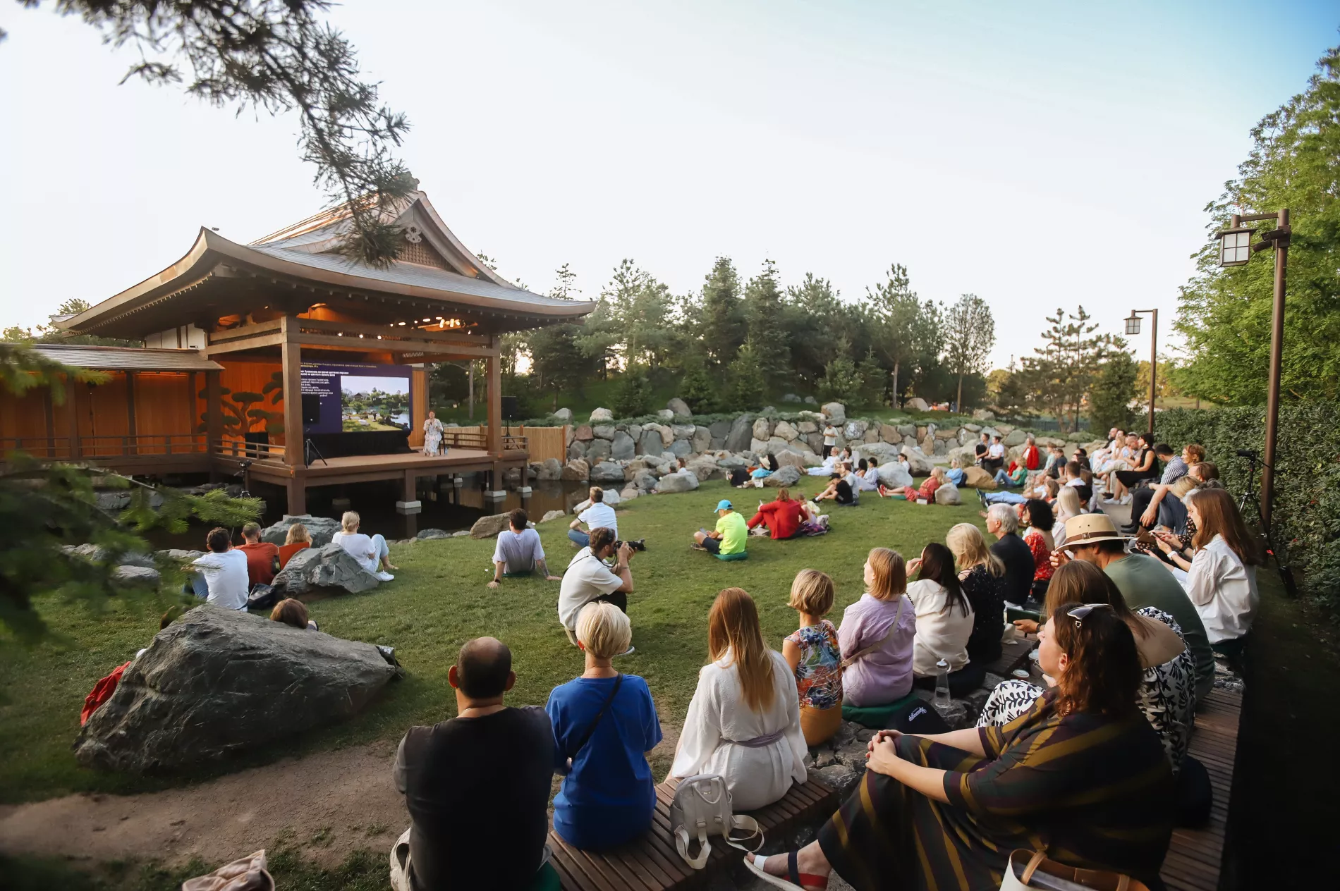 Площадка перед театром Но около 19:00 была полна людей. Зрители размещались на ступеньках, траве и камнях. Кто-то шутил: «Пришли слушать про японские сады, а надо бы в своих садах убраться».