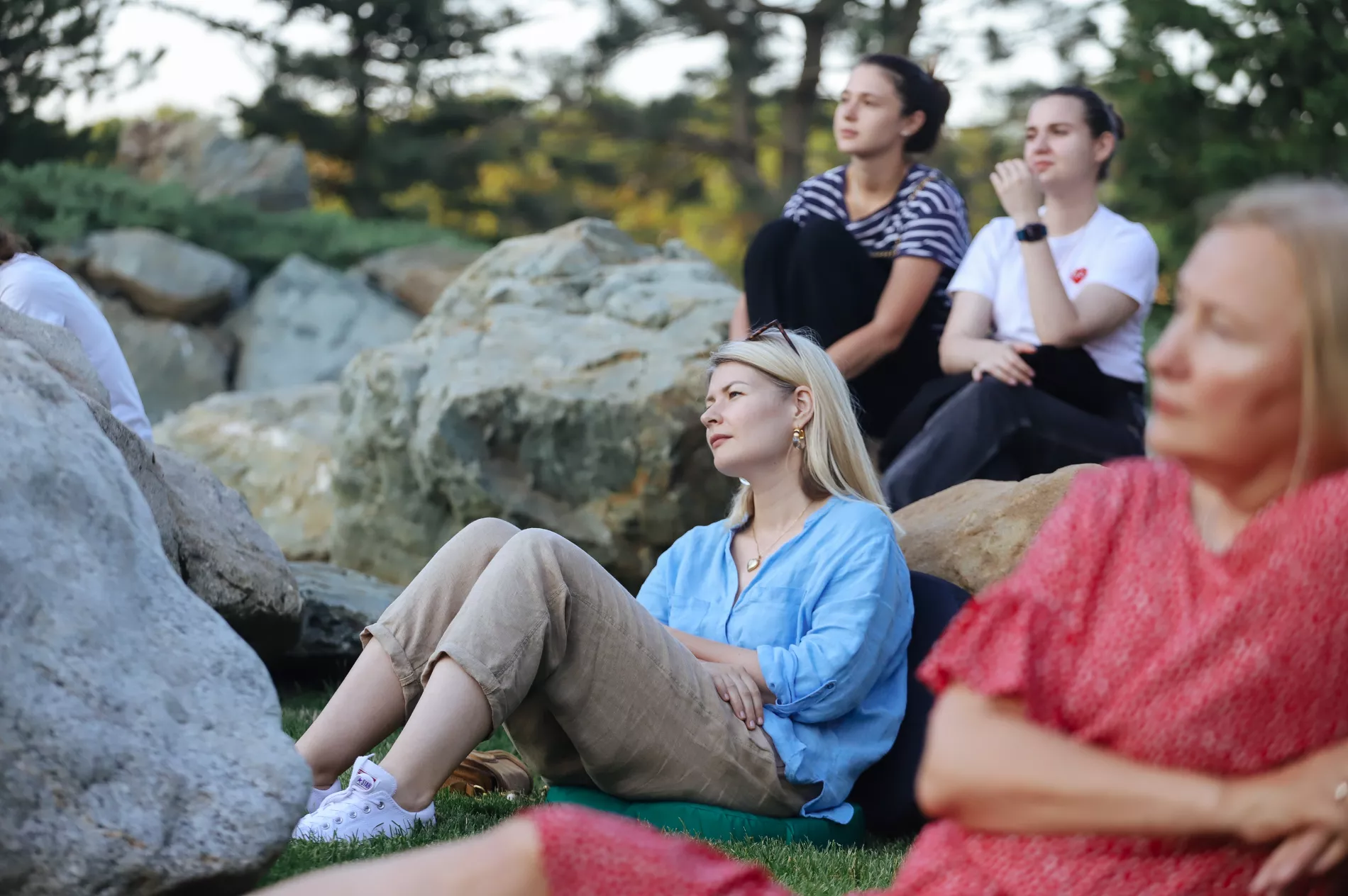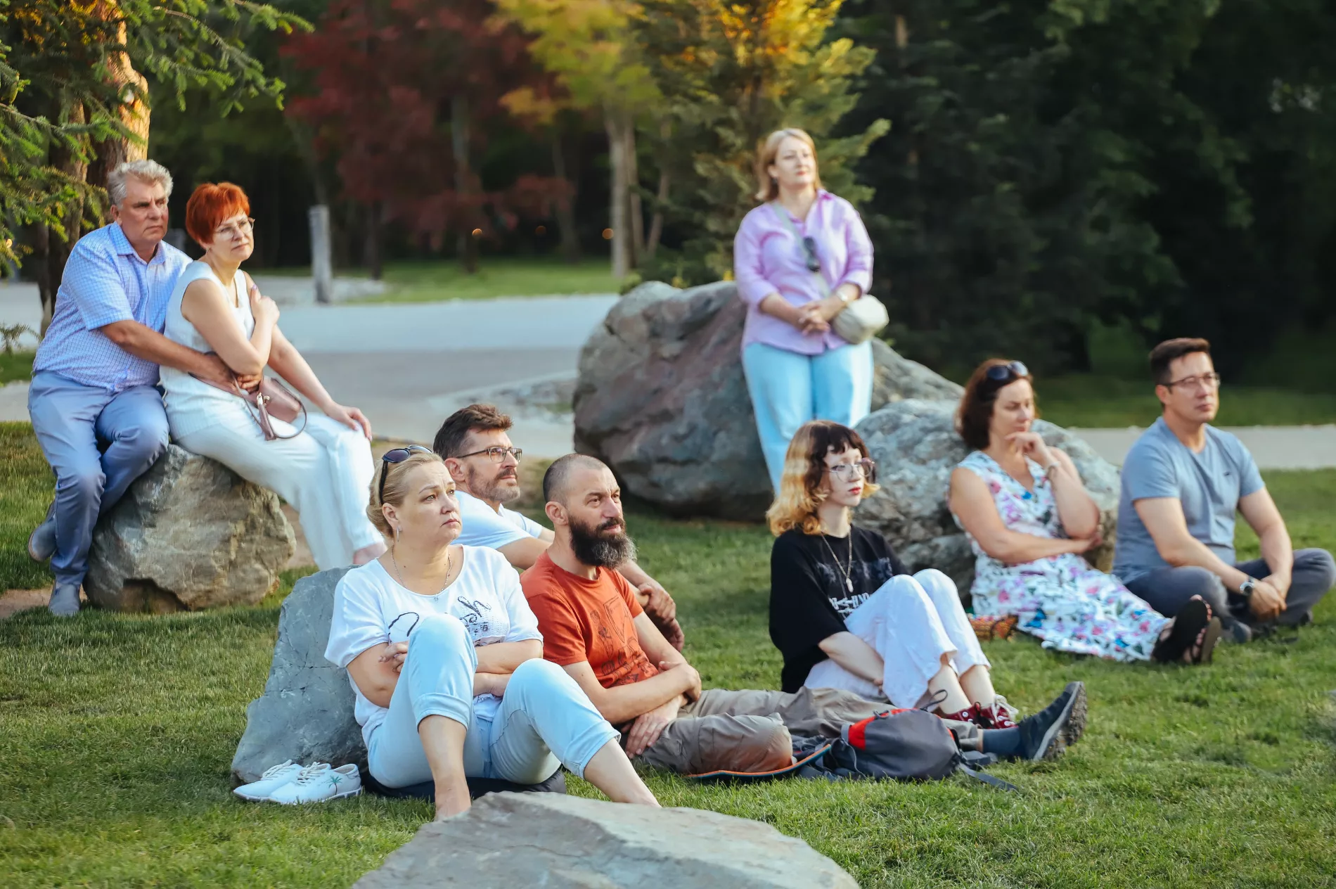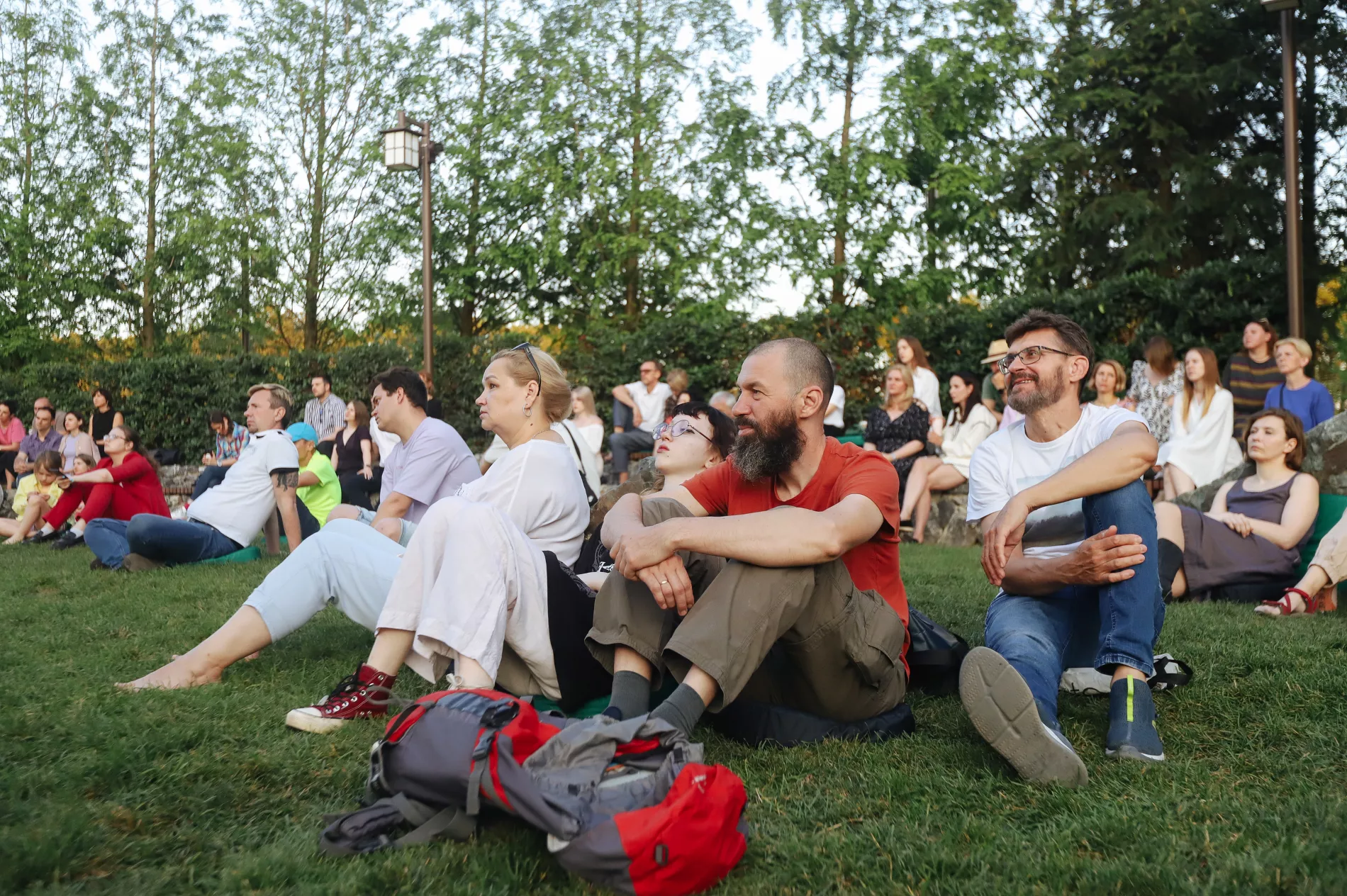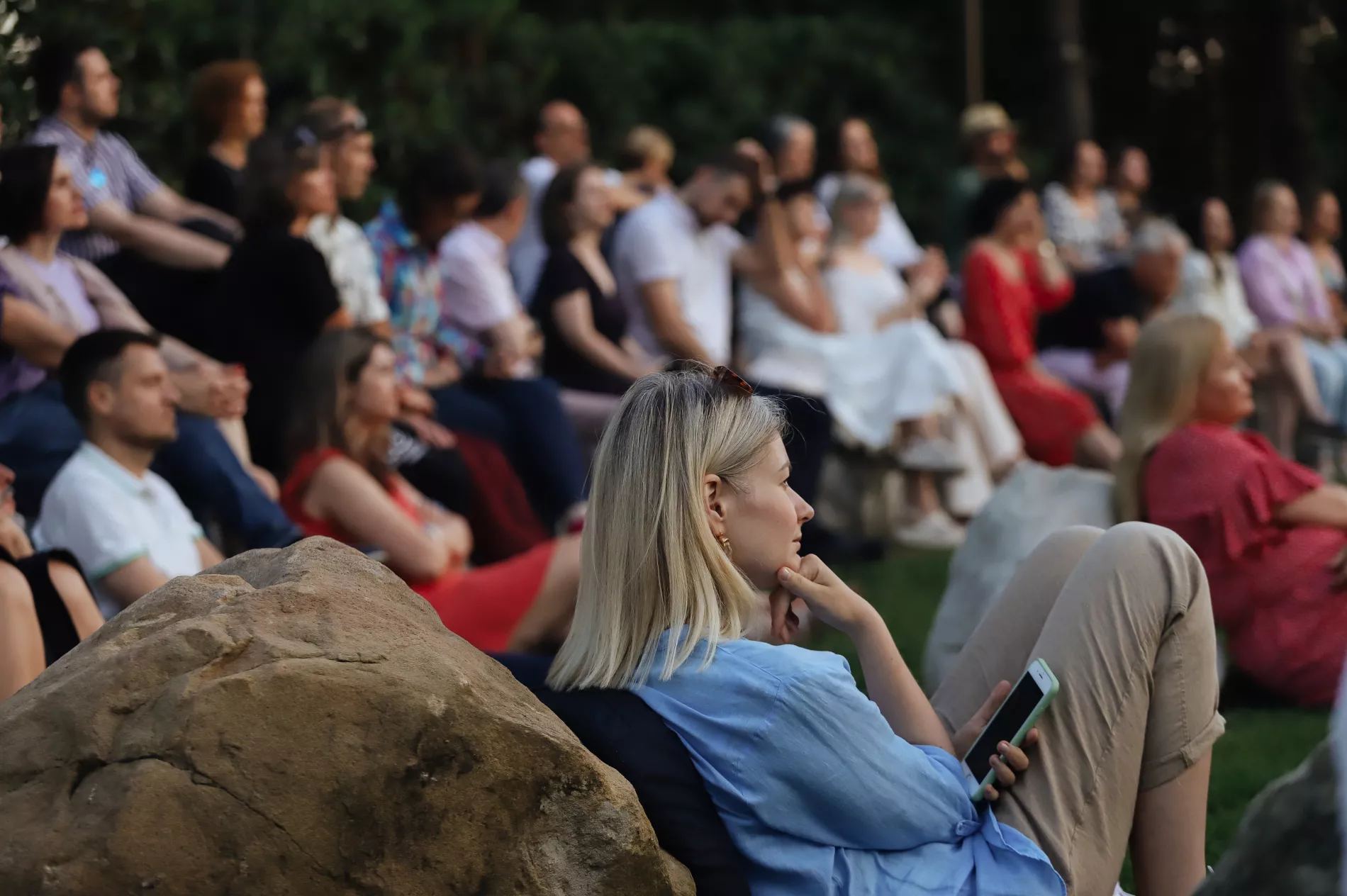 Площадка перед театром Но около 19:00 была полна людей. Зрители размещались на ступеньках, траве и камнях. Кто-то шутил: «Пришли слушать про японские сады, а надо бы в своих садах убраться».