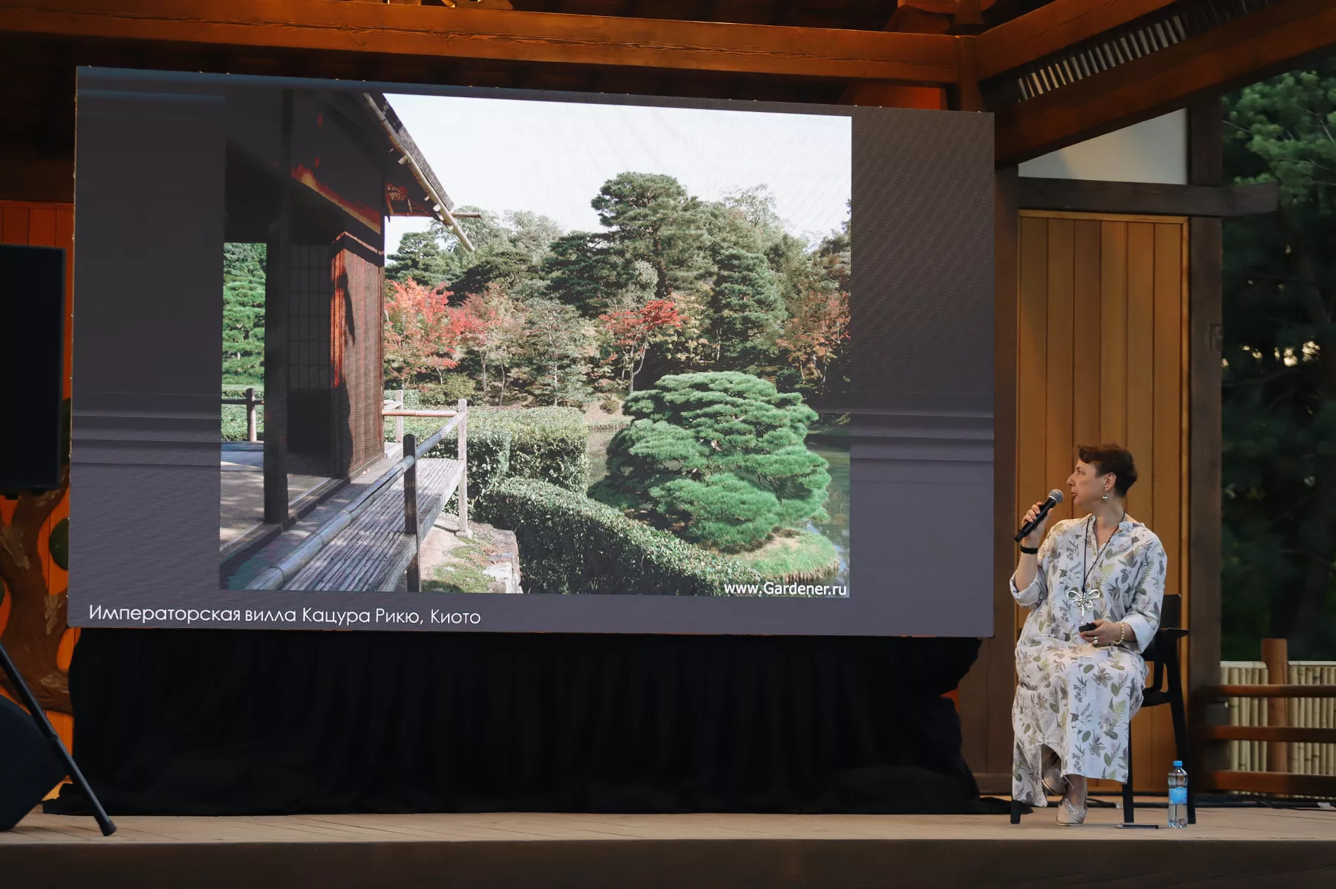 Японист подробно рассказала о зарождении и становлении садового искусства, его связи с религией, философией и историей. Свое выступление Анна Егорова дополняла иллюстрациями и фотографиями знаменитых садов Японии и Китая. Во второй части лекции Егорова объяснила, как древнее садовое искусство находит выражение в современных формах и становится достоянием общественности, в том числе, в парке «Краснодар».