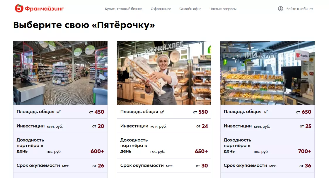 Сайт для партнеров содержит всю информацию, необходимую, чтобы узнать: как открыть «Пятёрочку» в своем городе, какое помещение для этого подойдет, возможно ли использовать арендную площадь, каковы минимальные вложения и срок выхода на окупаемость.