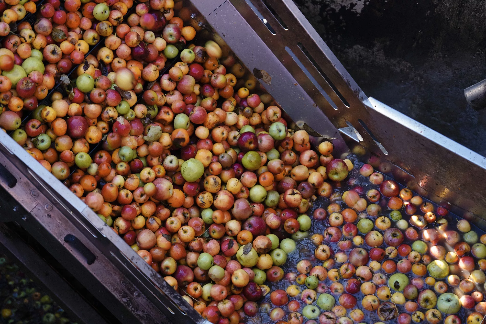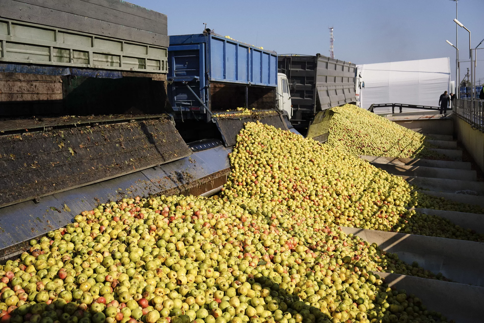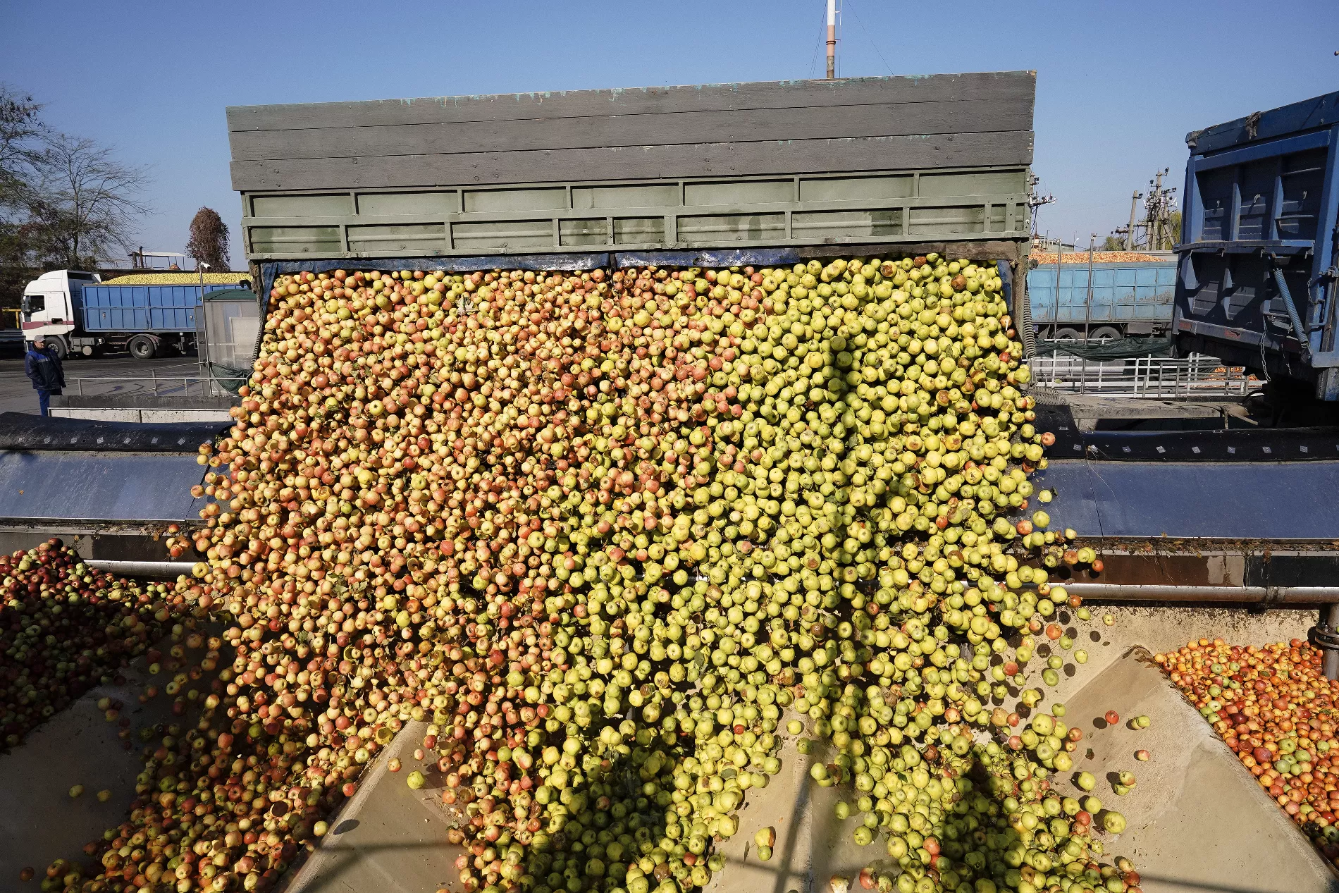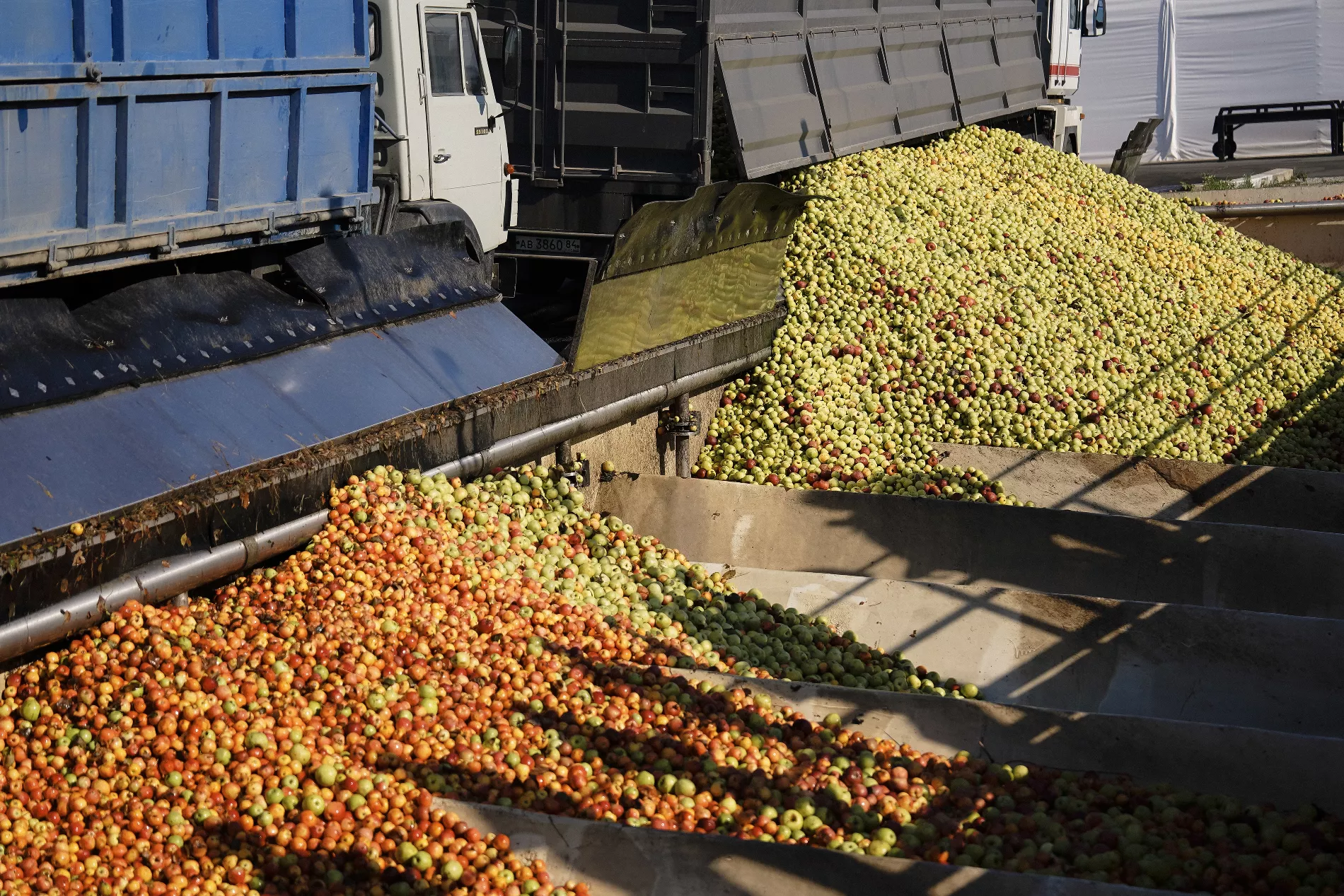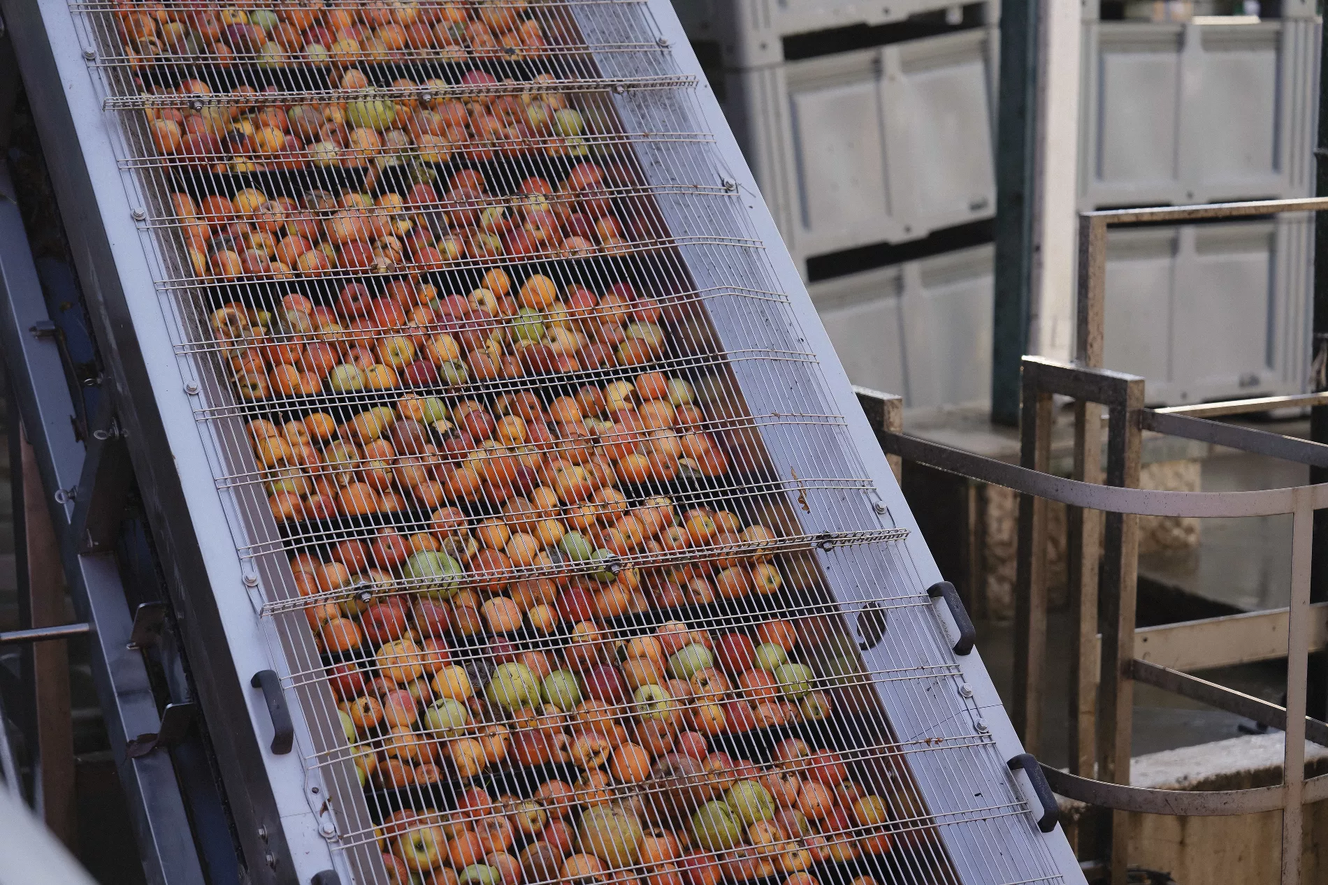 С фермерских хозяйств фуры доставляют яблоки к силосу — хранилищу с большими железными желобами. Благодаря зубцам и ячейкам красные и зеленые яблоки можно подать в разных пропорциях, чтобы сбалансировать вкус.