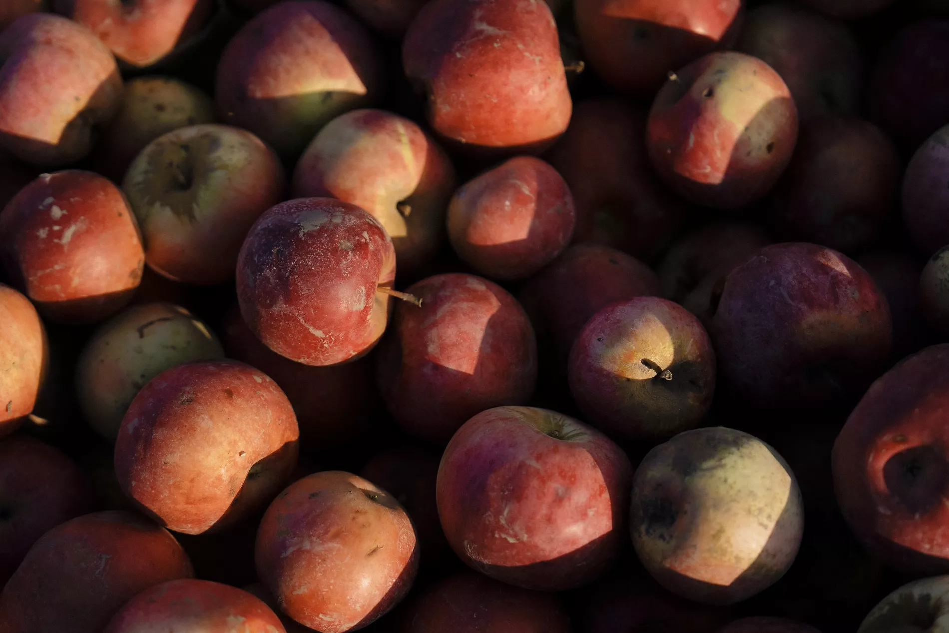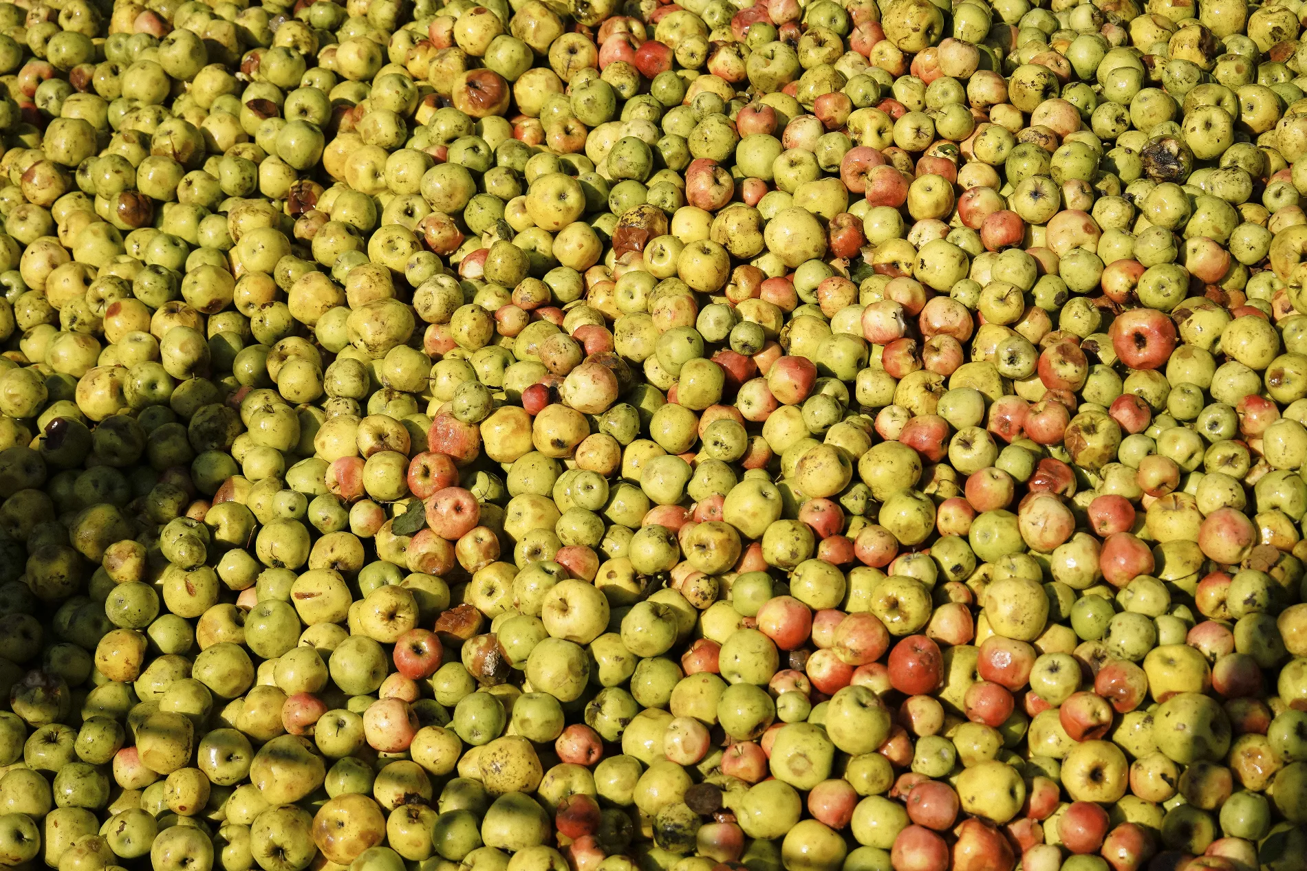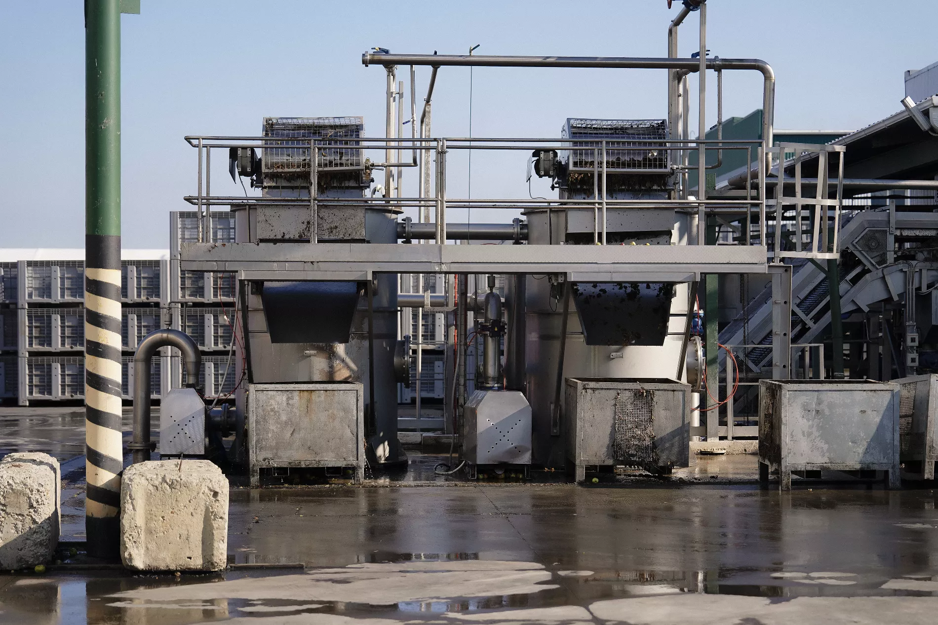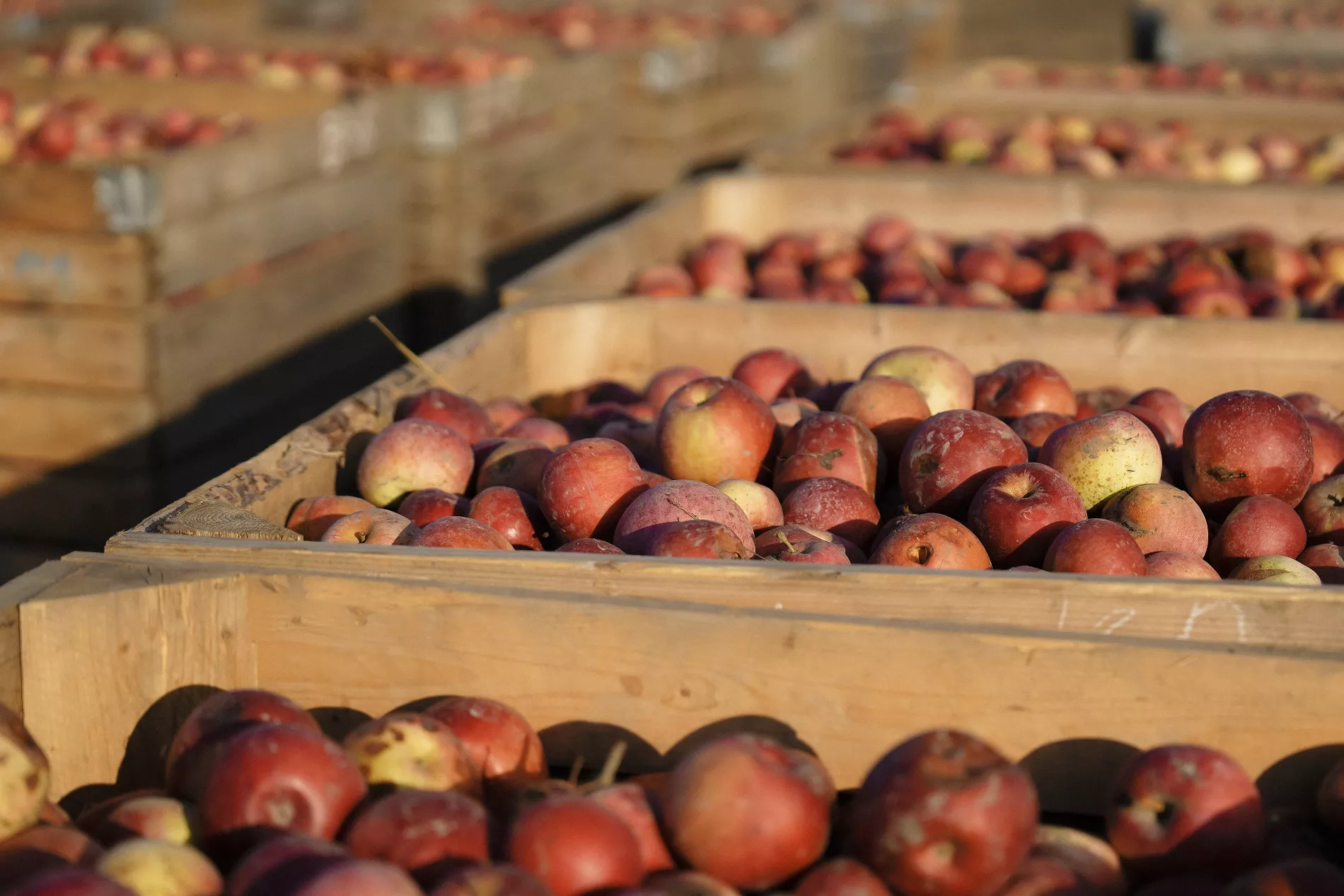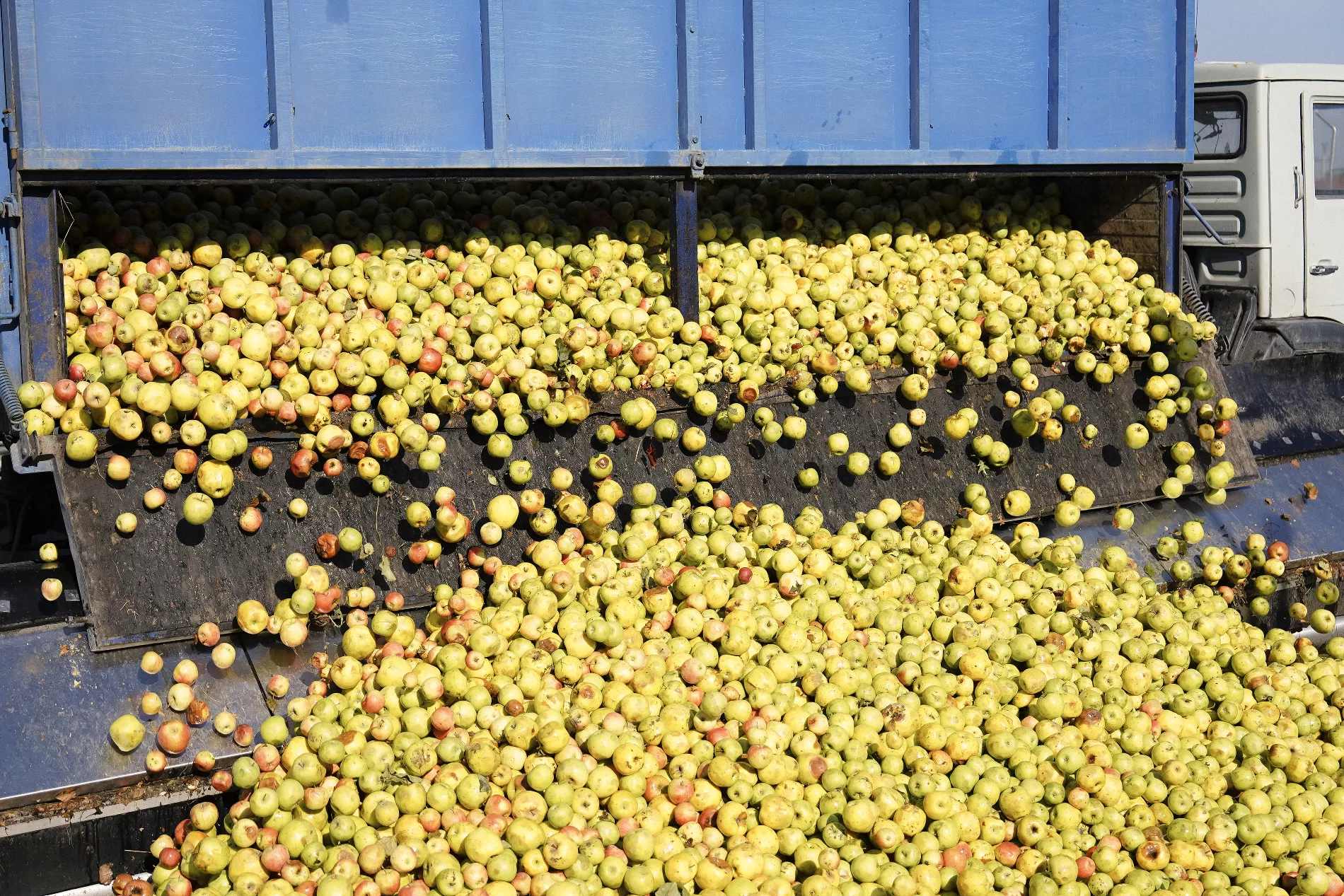 С фермерских хозяйств фуры доставляют яблоки к силосу — хранилищу с большими железными желобами. Благодаря зубцам и ячейкам красные и зеленые яблоки можно подать в разных пропорциях, чтобы сбалансировать вкус.