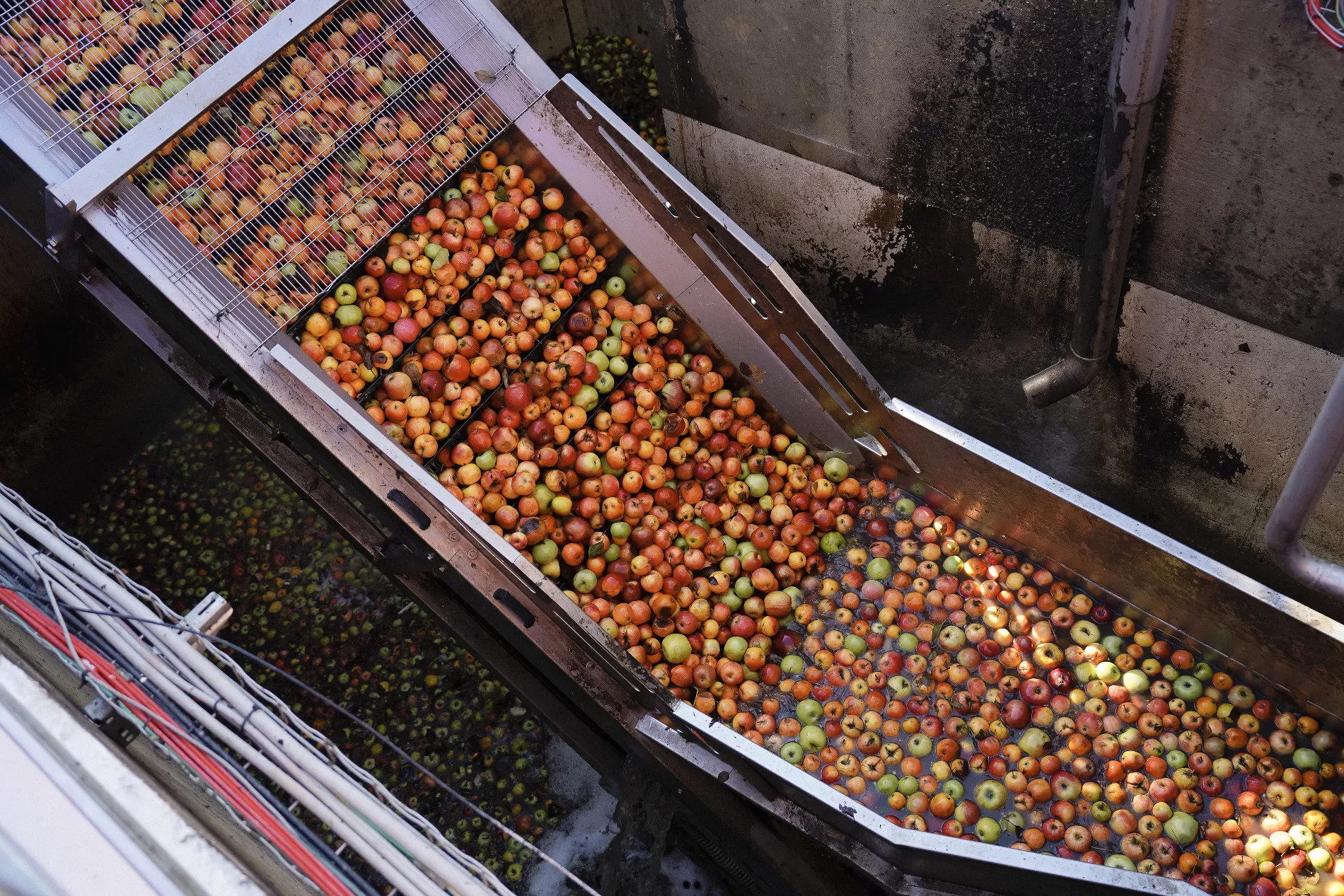 Отсюда по тоннелю с водой фрукты плывут к конвейеру, который поднимает их в цех. После полировки щеточной машиной и еще двух стадий ополаскивания сотрудники вручную отбраковывают некондиционные яблоки. Затем в закрытой системе машины удаляют кожуру, семечки, плодоножки и превращают фрукты в пюре.