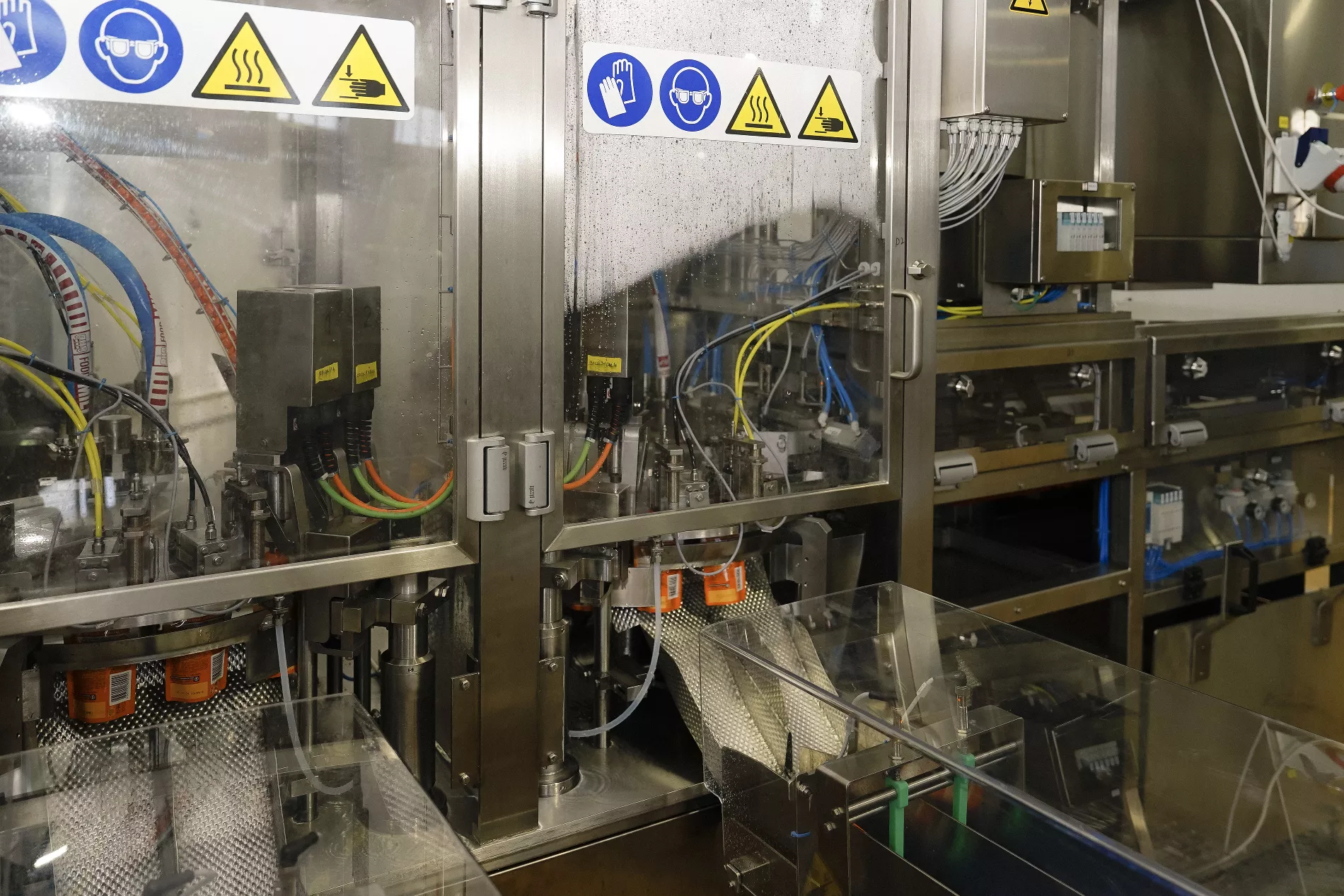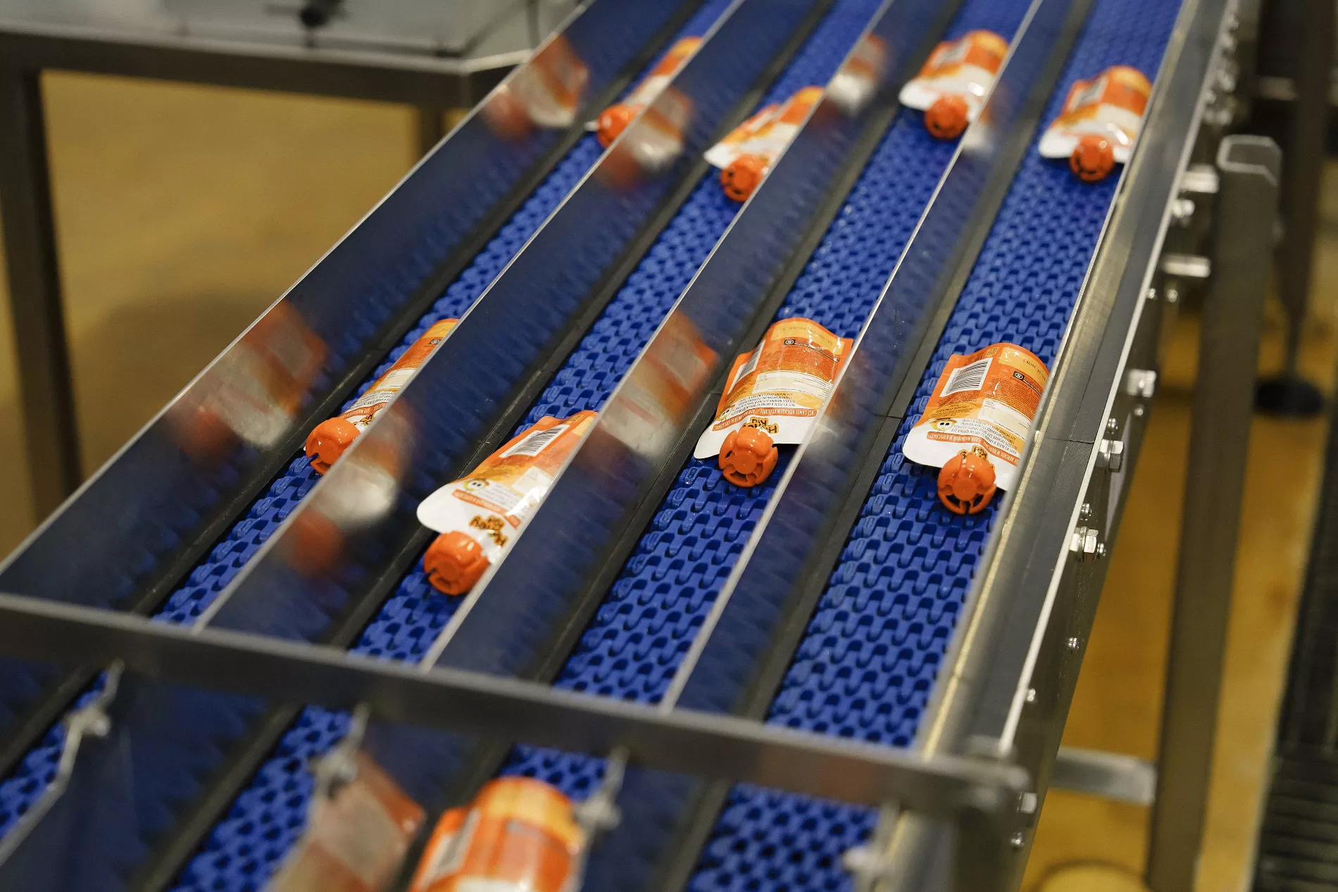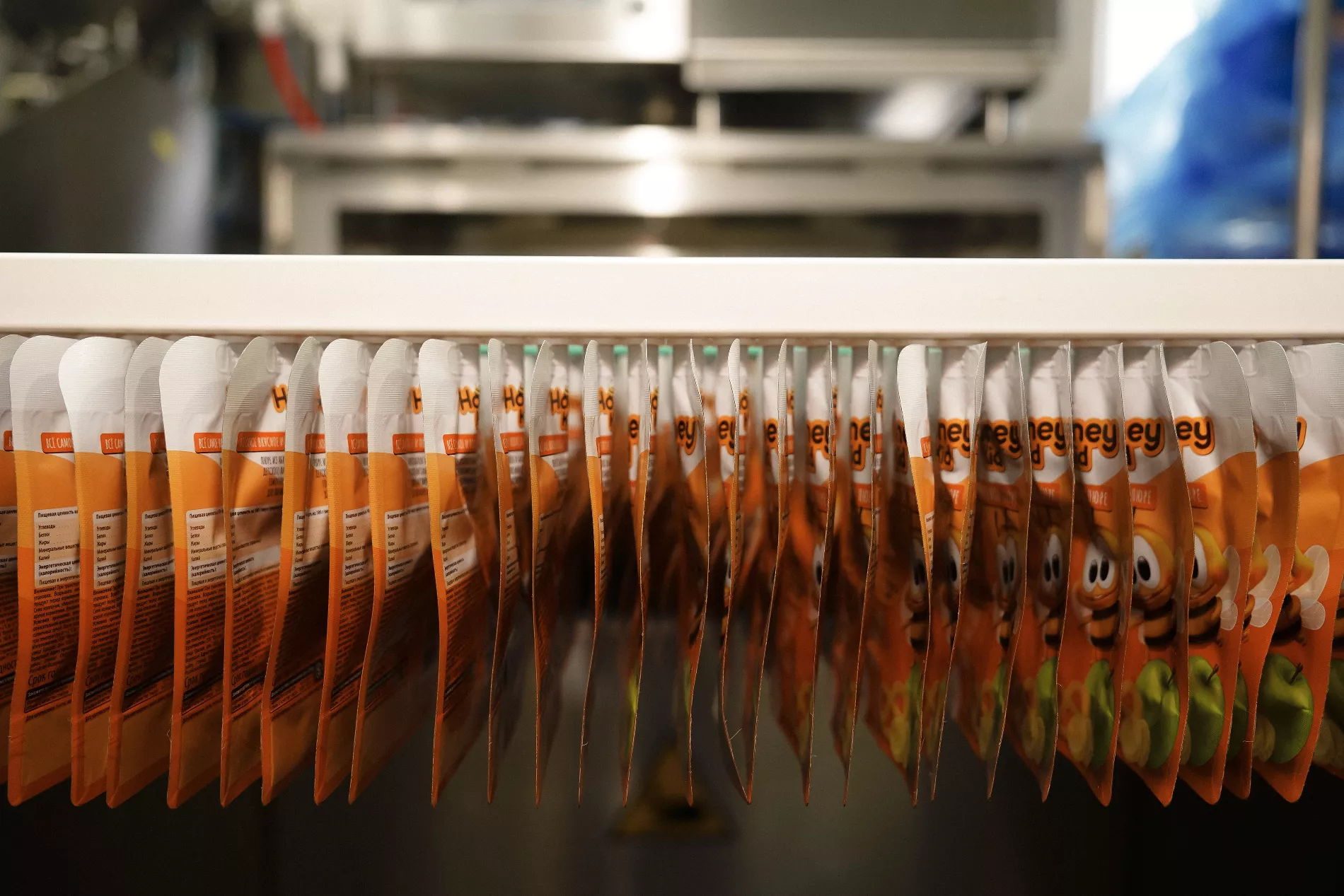 Специальные машины маркируют проверенные паучи, наполняют их пюре и закрывают крышками. Упакованное пюре стерилизуют еще 3,5 минуты. Встроенный в линию рентген-сканер проверяет каждый пауч на наличие посторонних частиц.