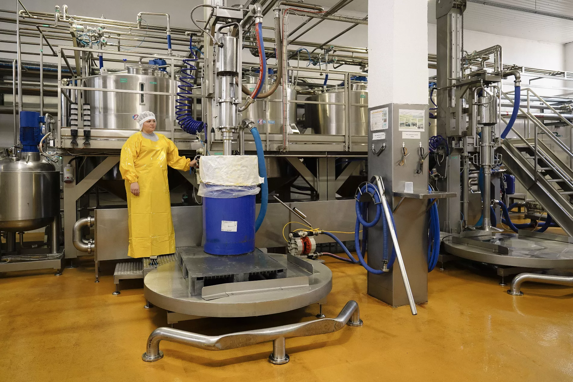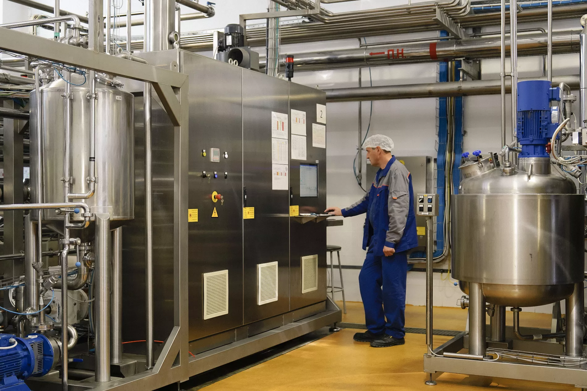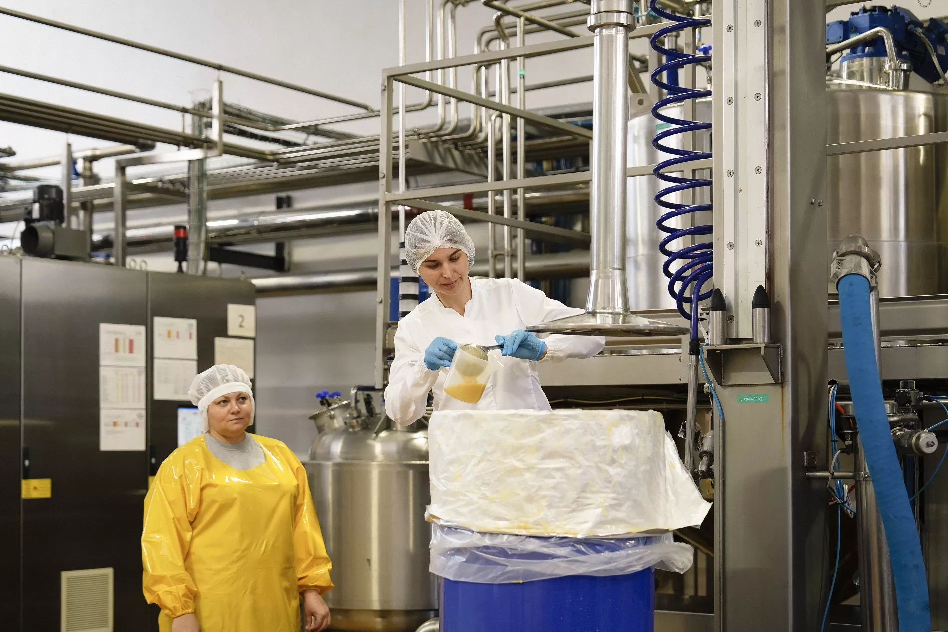 Насос закачивает сырье в купажную емкость с мешалками и весовыми датчиками. Если пюре многосоставное, например, яблоко-груша, компоненты смешивают по рецепту. До и после этих манипуляций собственная лаборатория завода проверяет продукцию на аллергены, пестициды и органолептические характеристики продукта: кислотность, цвет, вкус, консистенцию и другие.