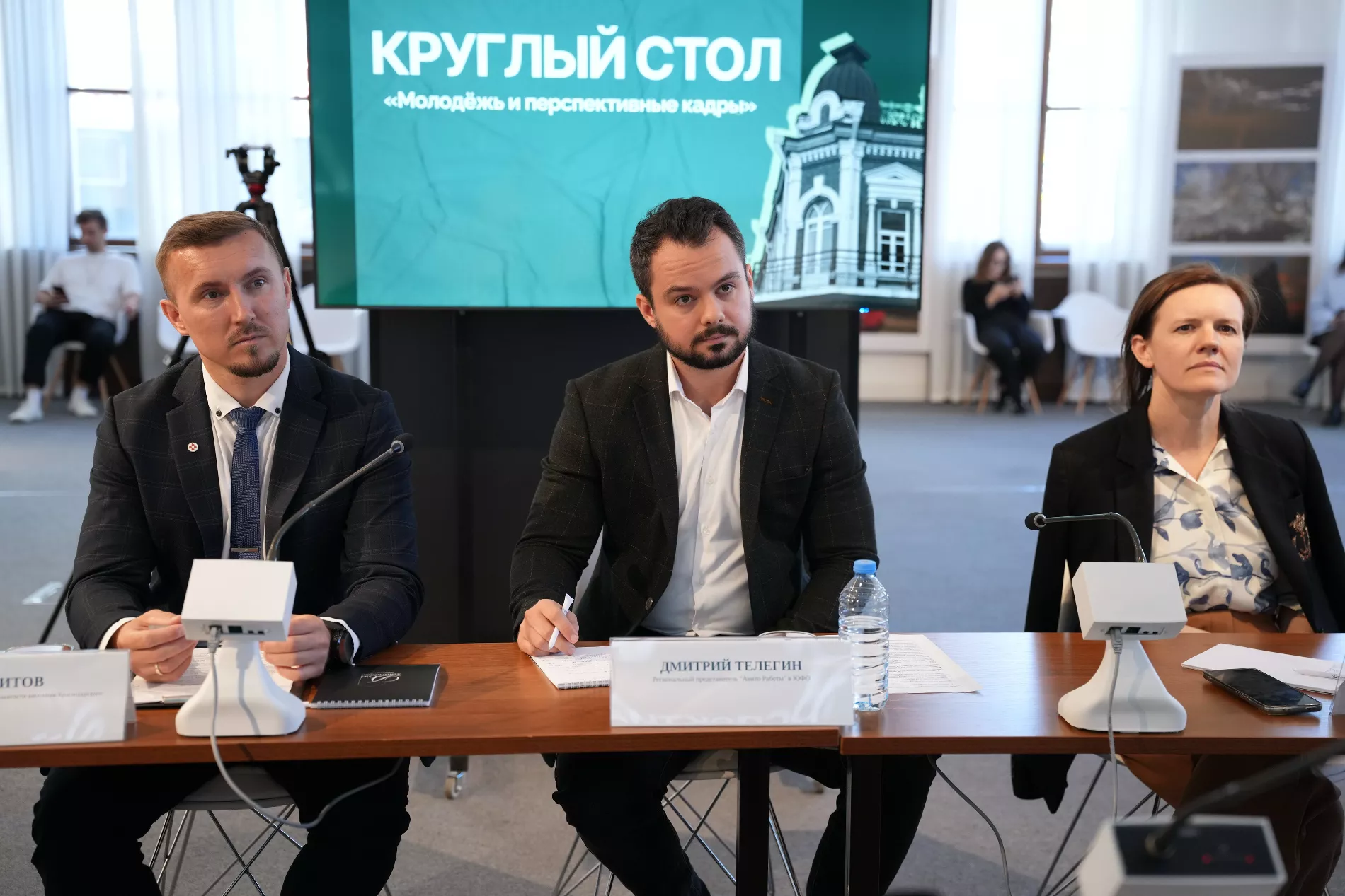 Беседу модерировала директор «Дома журналистики» Анна Косарева, а спикерами выступили заместитель руководителя Центра занятости населения Краснодарского края Иван Титов, руководитель департамента молодежной политики Краснодарского края Роман Дмитриев, проректор по учебной работе КубГТУ Евгений Дьяконов, директор Фонда развития инноваций Краснодарского края Ольга Лукашева и региональный представитель Авито Работы в ЮФО Дмитрий Телегин.