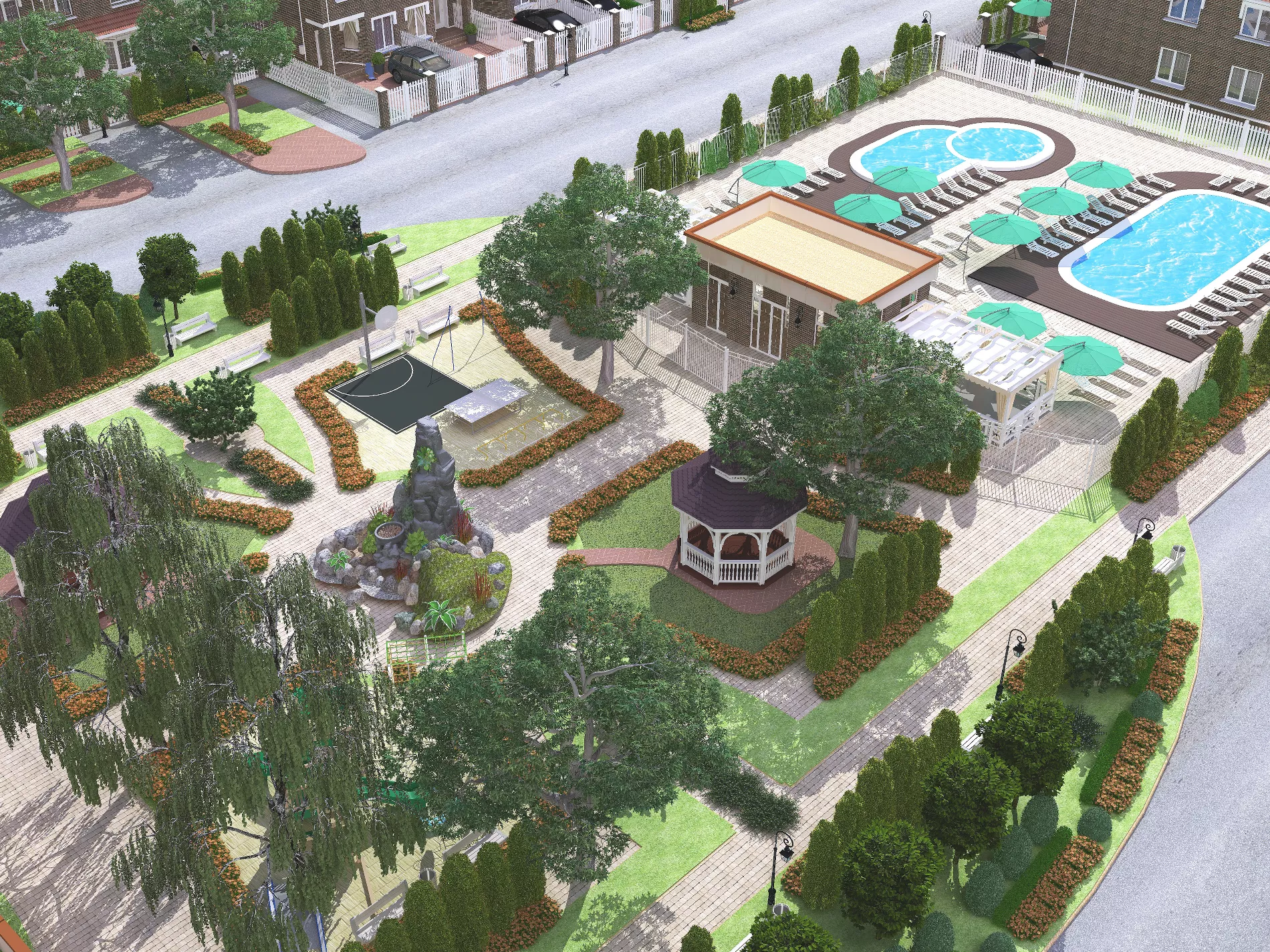 Инфраструктура: в центре КК «Австрия» расположится парковая зона с детскими и спортивными площадками, лавочками и беседками для отдыха. Там же будет обустроена аквазона с двумя бассейнами — для взрослых и детей, душевыми кабинками и санузлами. В проекте предусмотрено размещение шезлонгов и навесов.