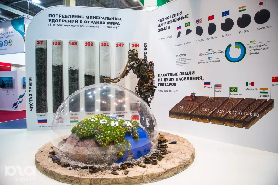 Здесь на стенде график, на котором показаны объемы вносимых удобрений в разных странах. Россия в начале этого графика с показателем в 37 кг действующего вещества (ДВ) на гектар, Китай в конце — с цифрой уже 380 кг. Они действительно применяют в среднем в 10 раз больше удобрений, чтобы обеспечить уровень производства, но это не единственный метод.