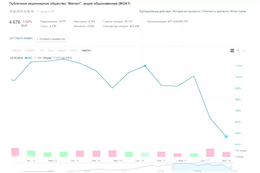 Котировки акций «Магнита» на фондовом рынке упали более чем в два раза с пиковых значений 2015 года. С сентября 2017 года ретейлер подешевел с 1 трлн рублей до 530 млрд — это его капитализация на Московской бирже на конец января 2018-го. Почему это произошло?