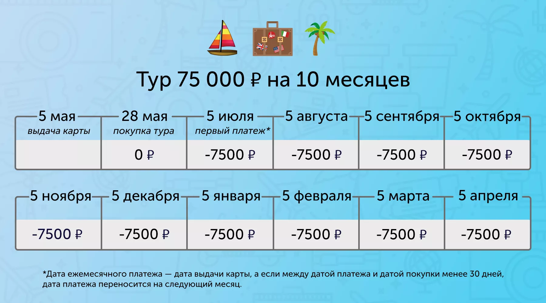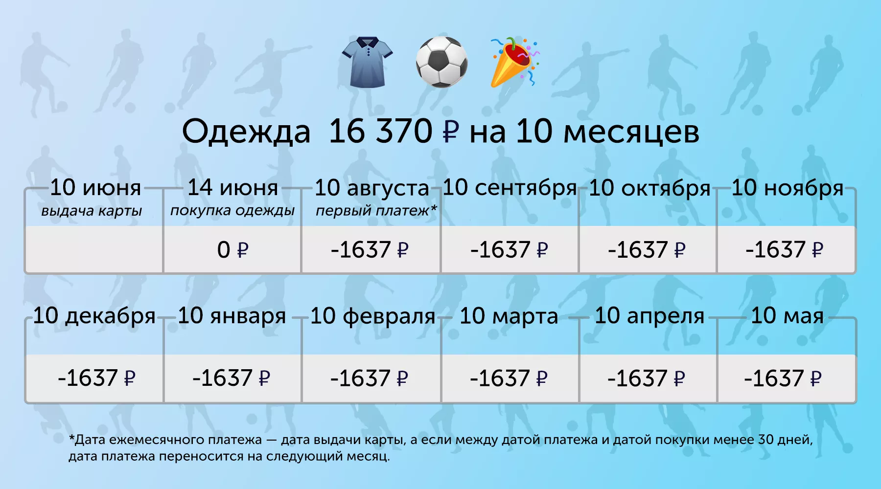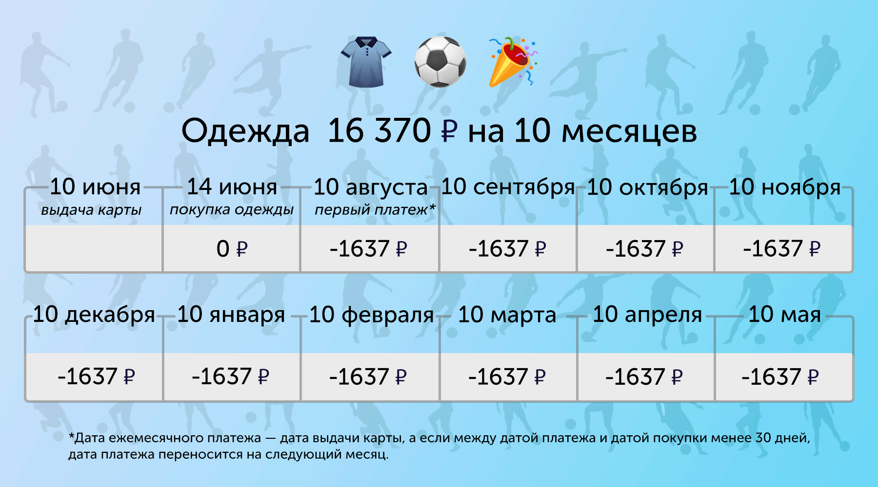 Если вернуть стоимость покупки в период рассрочки, за услугу не нужно платить. Но если пропустить ежемесячный платеж, придется заплатить комиссию за просрочку. Выпуск и обслуживание карты бесплатны. Дата ежемесячного платежа — дата выдачи карты, а если между датой платежа и датой покупки менее 30 дней, дата платежа переносится на следующий месяц.