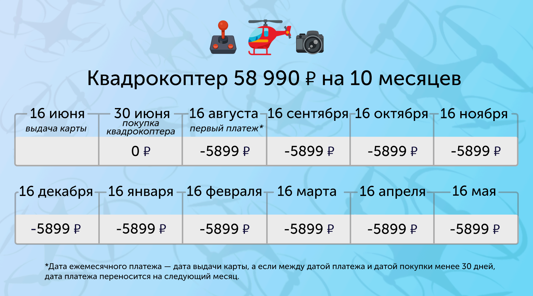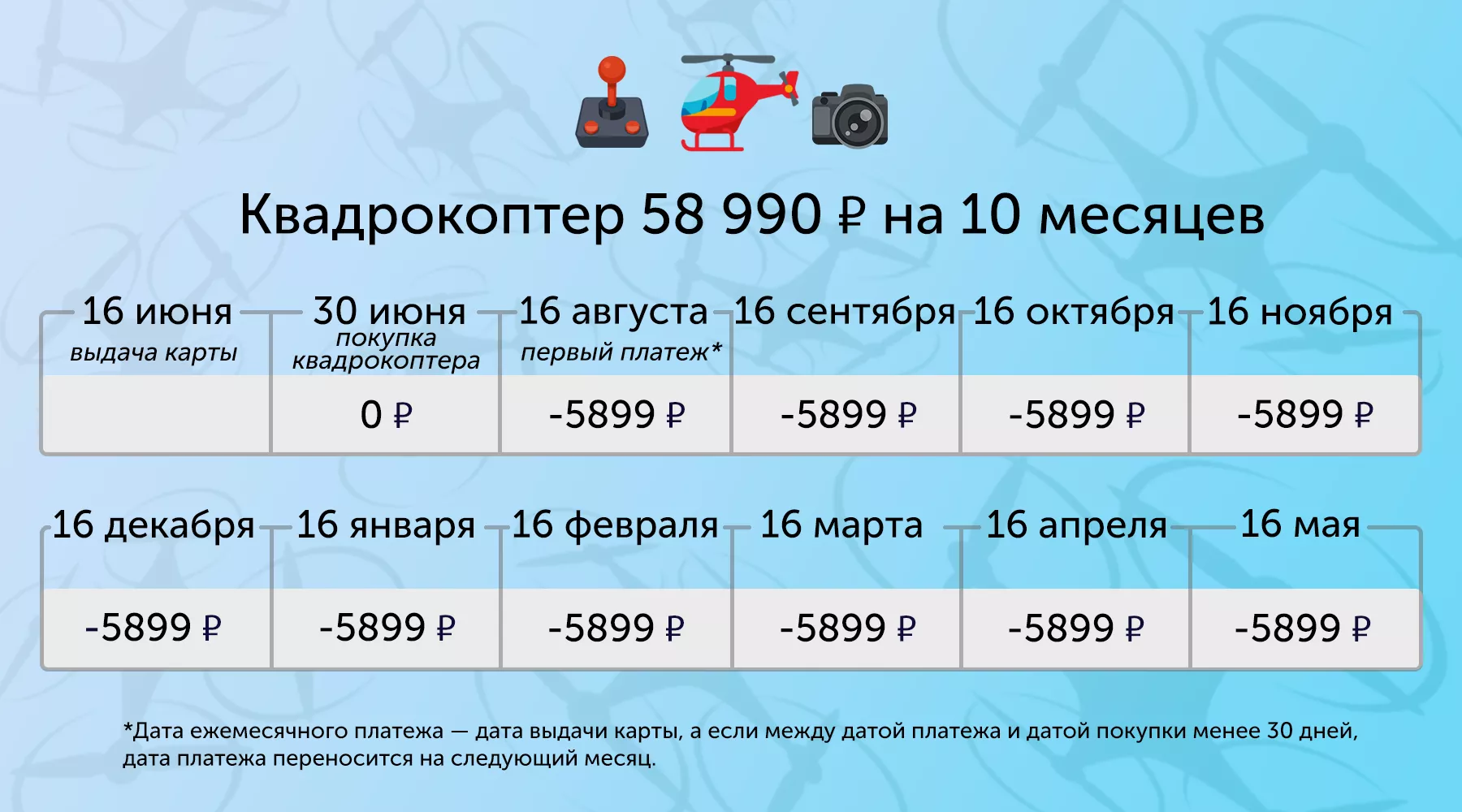 Вообще, съемка с квадрокоптеров сейчас так популярна, что окупить его вы сможете еще быстрее, чем погасите оплату по рассрочке, — достаточно найти клиентов и осуществить несколько коммерческих съемок. Главное — овладеть искусством монтажа.