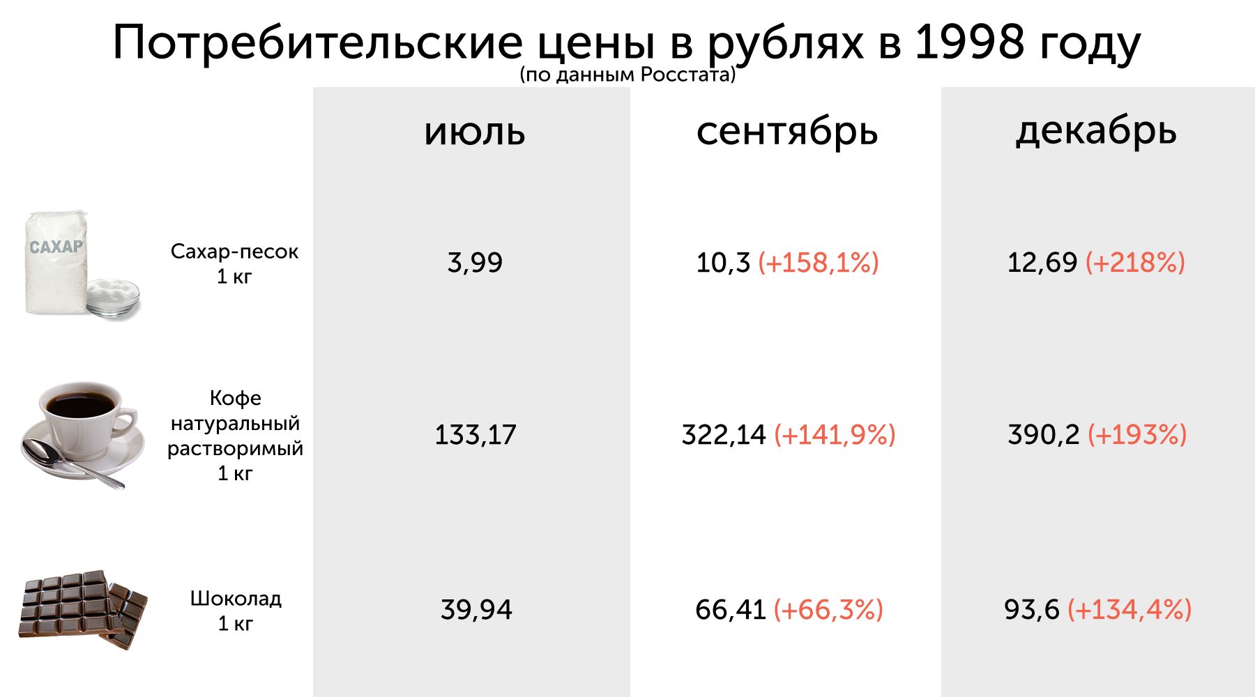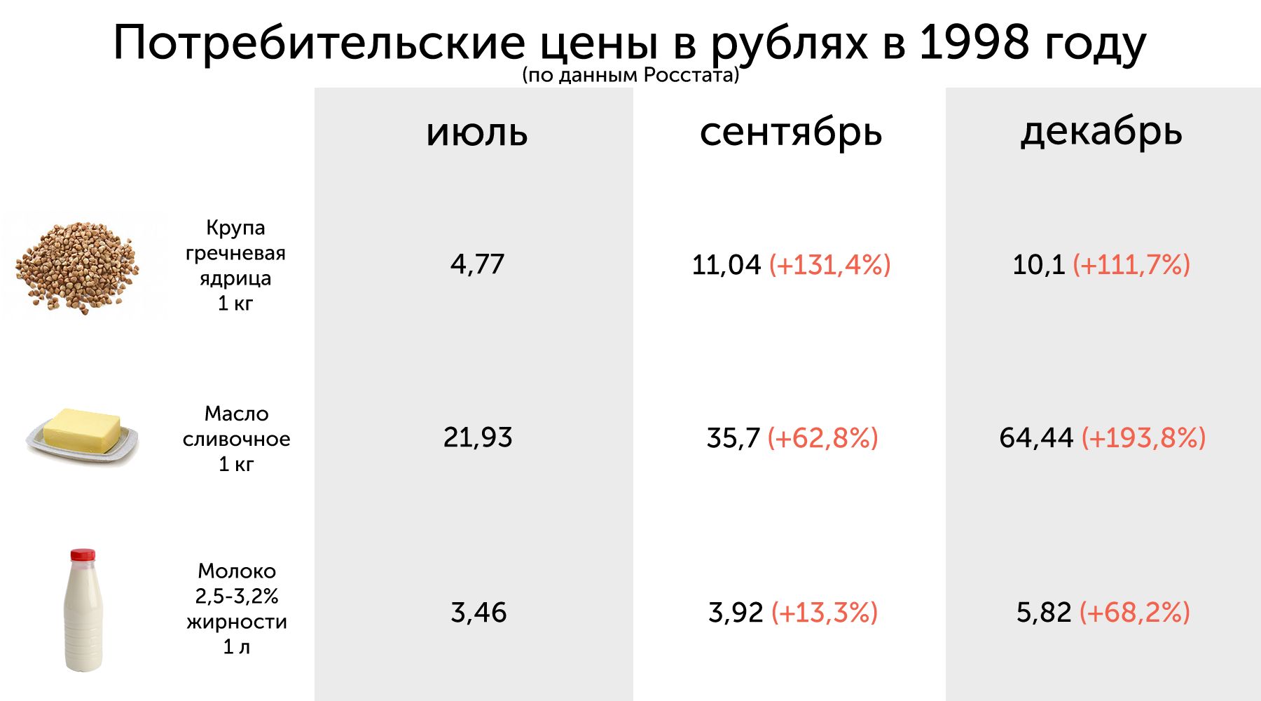 Согласно данным того же Росстата, средняя зарплата в России в 1998 году составляла 1051 рубль. В июле она составляла 1110 рублей, в сентябре — 1112 рублей, в декабре — 1482 рубля.