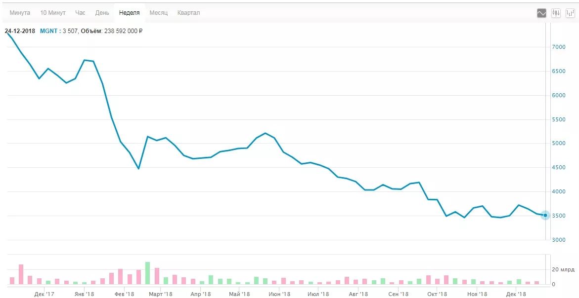 К настоящему моменту акции «Магнита» балансируют возле исторических минимумов. На фоне ослабления операционной среды — снижения реальных доходов населения, повышения налогов, пенсионной реформы, волатильности рубля — рыночные аналитики считают рынок продуктового ретейла спекулятивным для инвестиций.