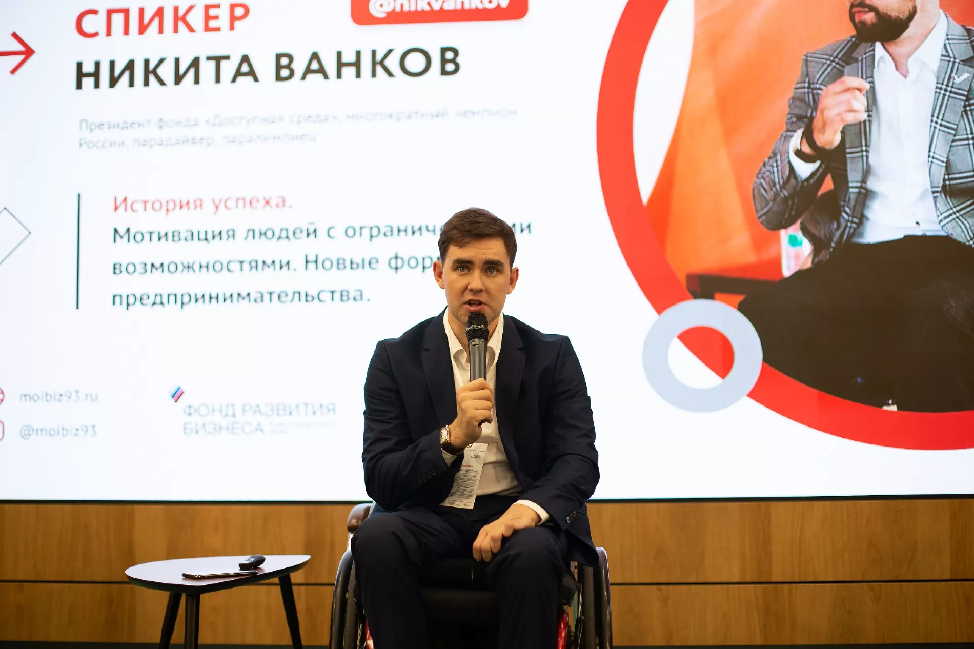 Также в числе спикеров конференции выступил Никита Ванков, российский парадайвер, руководитель фонда «Доступная среда». Более 13 лет назад Никита получил тройной перелом шеи и закрытую черепно-мозговую травму — длительное время не разговаривал и вообще не двигался. Однако нашел в себе силы подняться и пойти в спорт: «После второй клинической смерти мне прочитали историю Валентина Дикуля — циркового артиста, который во время выступления упал из-под купола, получил тяжелые травмы позвоночника и переломы, но смог снова встать на ноги. Я подумал: «Раз это смог сделать один человек, то почему этого не смогу сделать я». Двигаться вперед мне помог именно пример другого человека, который через все это прошел».