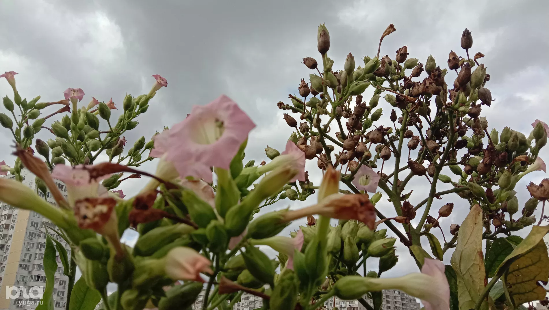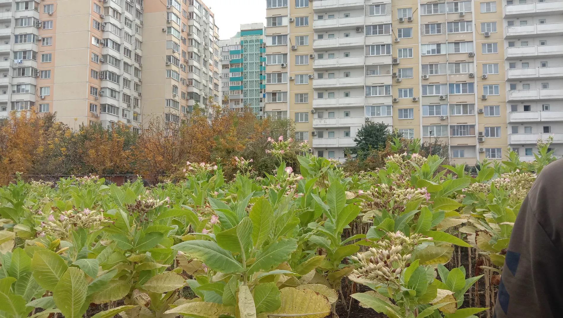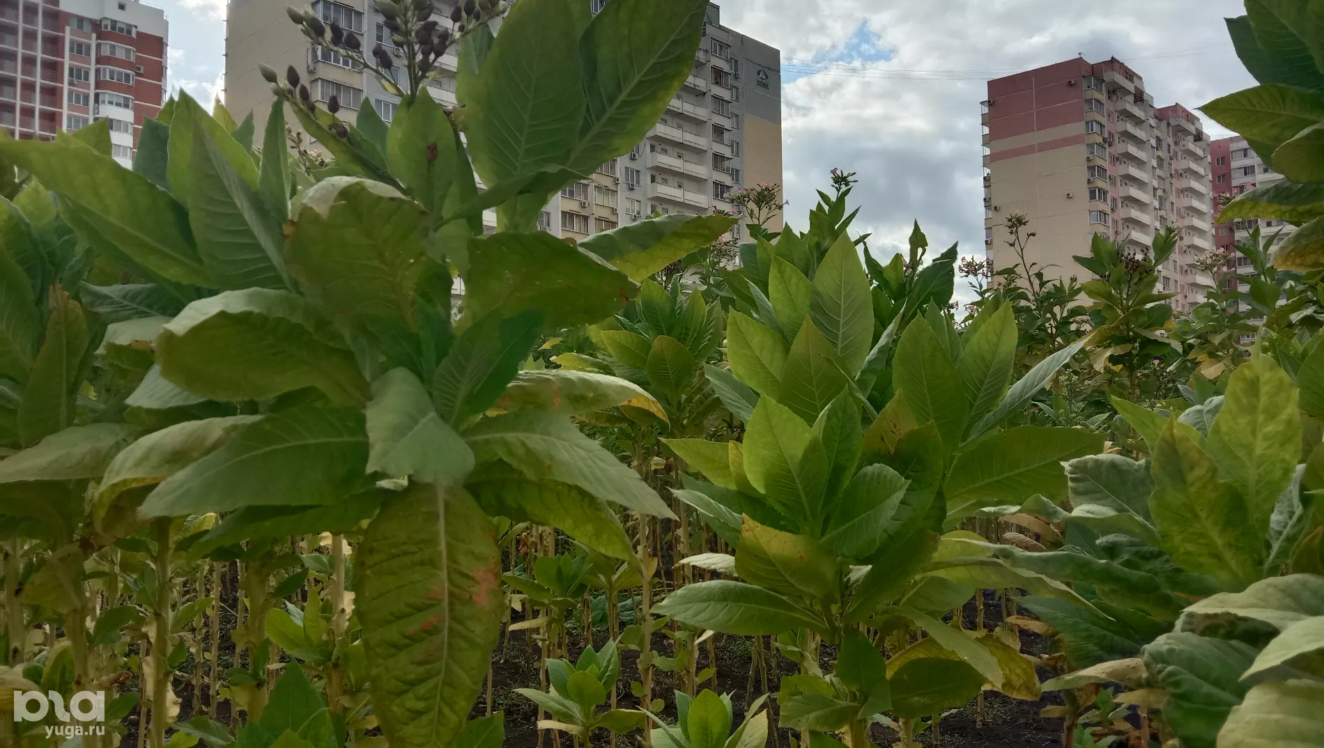 «Это был уже загород, территория на отшибе. Вот эта тропиночка, по которой автомобиль едет — это улица Московская», — замдиректора института табака Евгения Гнучих показывает снимок, сделанный в год основания первой лаборатории, в 1914-м. Теперь комплекс института находится между новостройками и советскими многоэтажками. Над полем буквально нависают окна домов. Автомобильную парковку от высоких стеблей табака отделяет низкий забор.