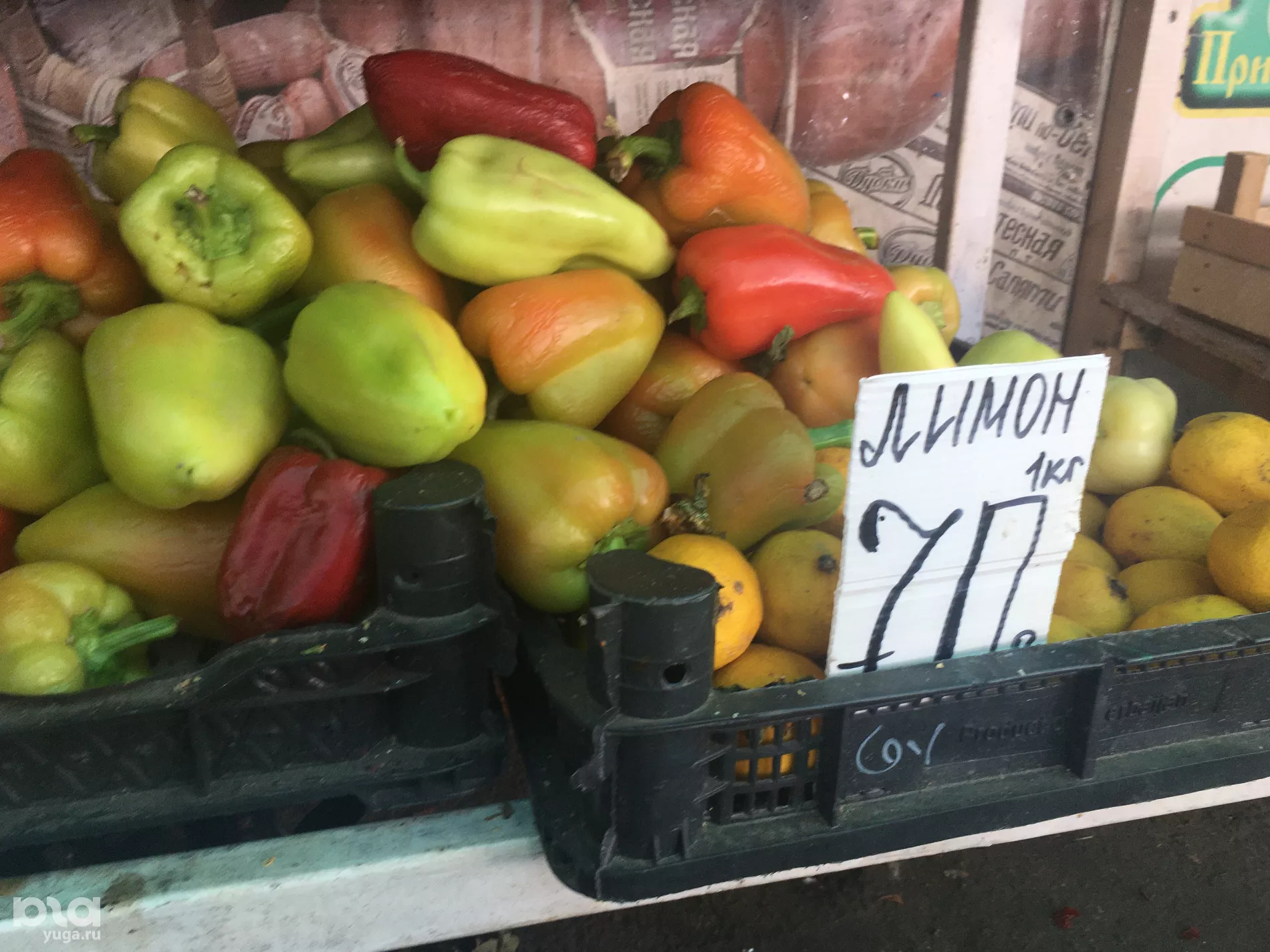 Также немало болгарских перцев, слив, дынь и томатов. В одном месте продавали лимоны по 70 рублей за кг.