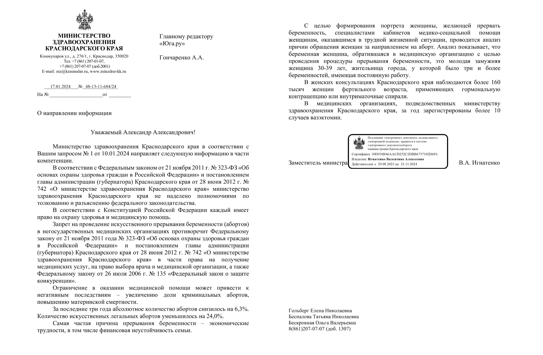 Прежде всего замминистра здравоохранения Кубани Валентина Игнатенко напомнила, что ведомство «не наделено полномочиями по толкованию и разъяснению федерального законодательства». При этом, сославшись на конституционное право на охрану здоровья и медицинскую помощь, Игнатенко заявила: