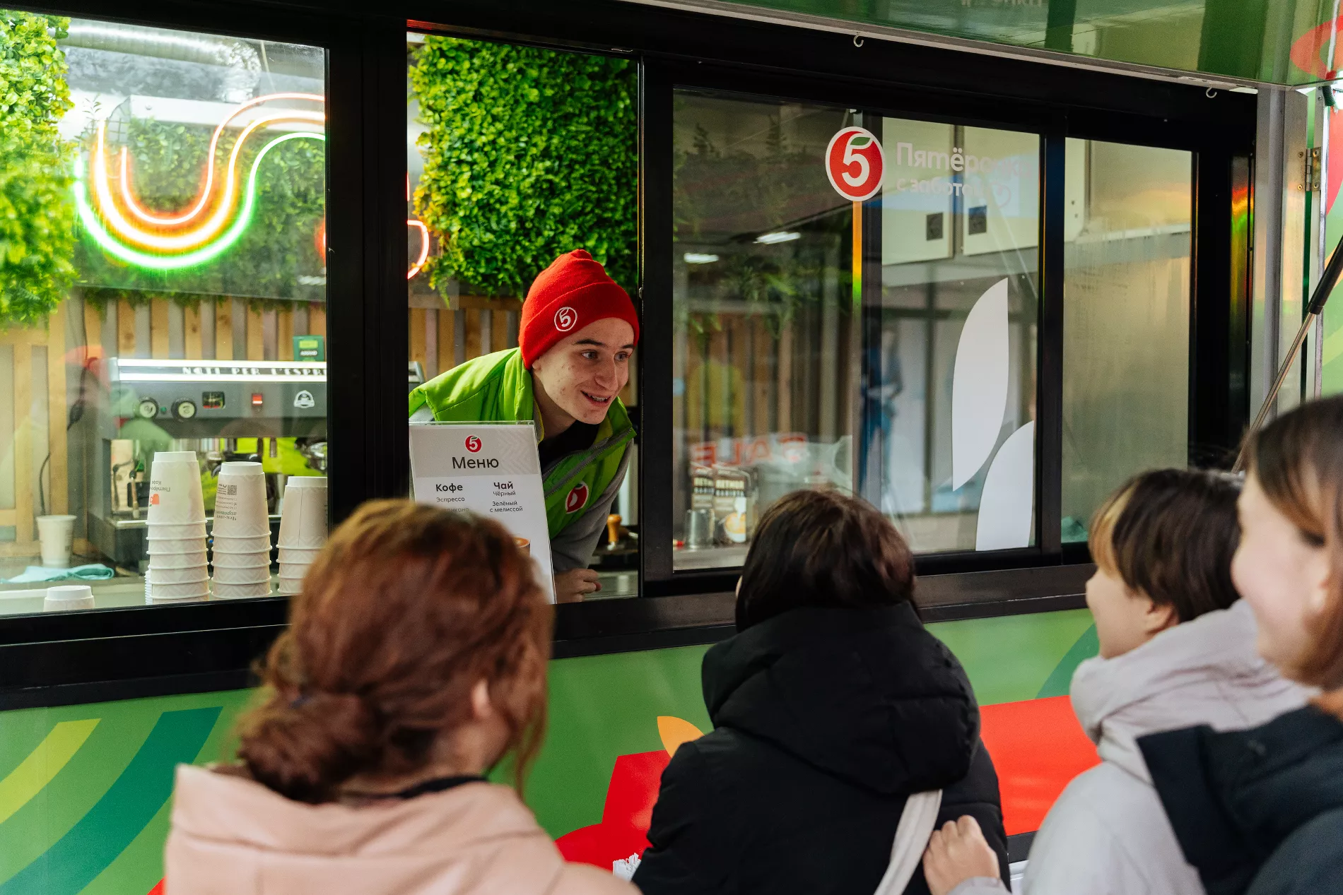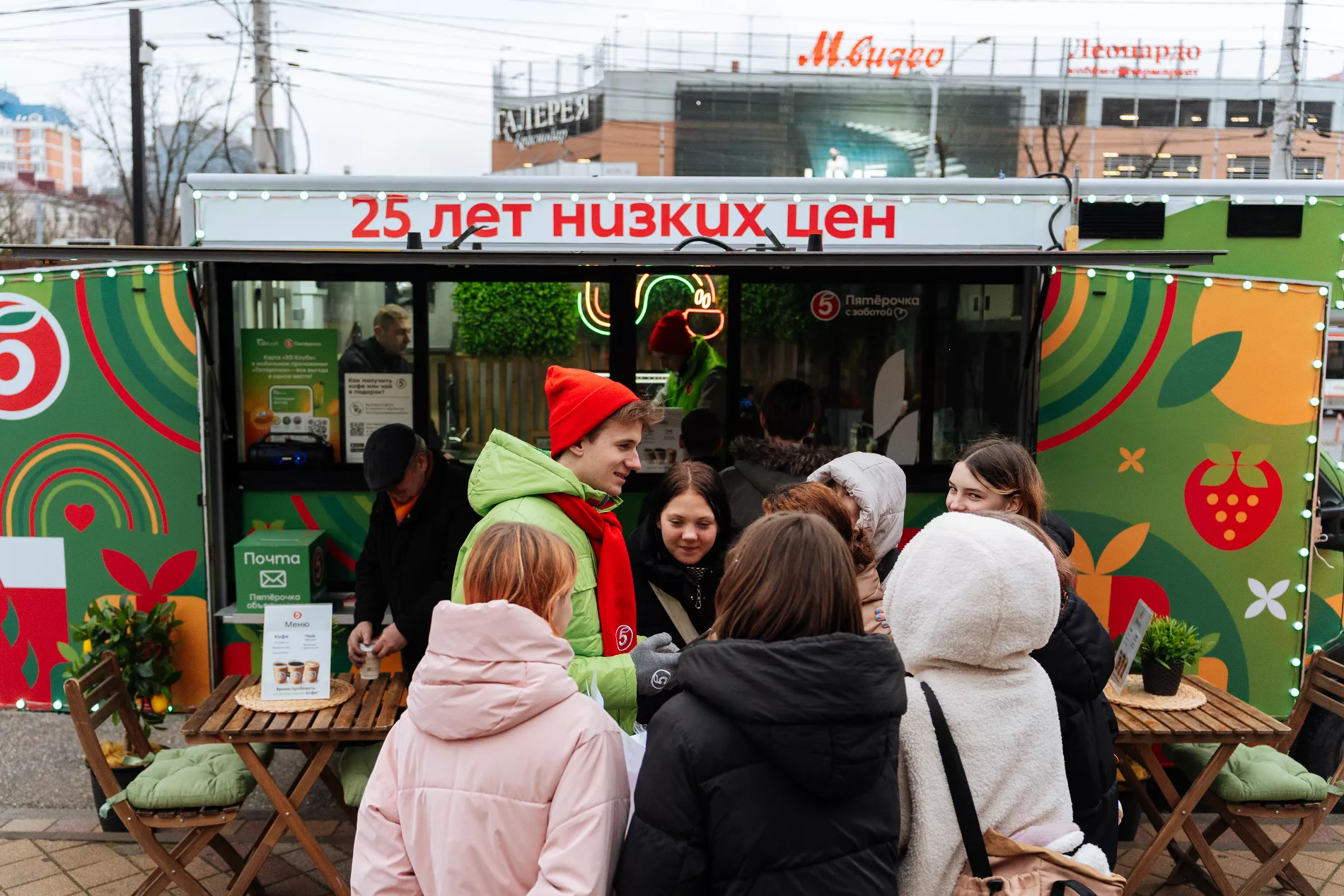 Всех подходивших к фудтраку угощали напитками — горячими или прохладительными на выбор, а также приглашали участвовать в активностях, за которые вручали памятные сувениры. Так, при желании получить сувенир нужно было разместить в своих социальных сетях пост с хештегом #ПятёрочкаВдохновляет или активировать карту лояльности в новом мобильном приложении торговой сети. Многие с удовольствием фотографировались, вели прямые эфиры для друзей, постили фото и видео и просто веселились. А еще — подписывали открытки для своих близких, которые можно было бесплатно отправить в любой уголок страны с помощью почтового ящика, установленного возле фудтрака.