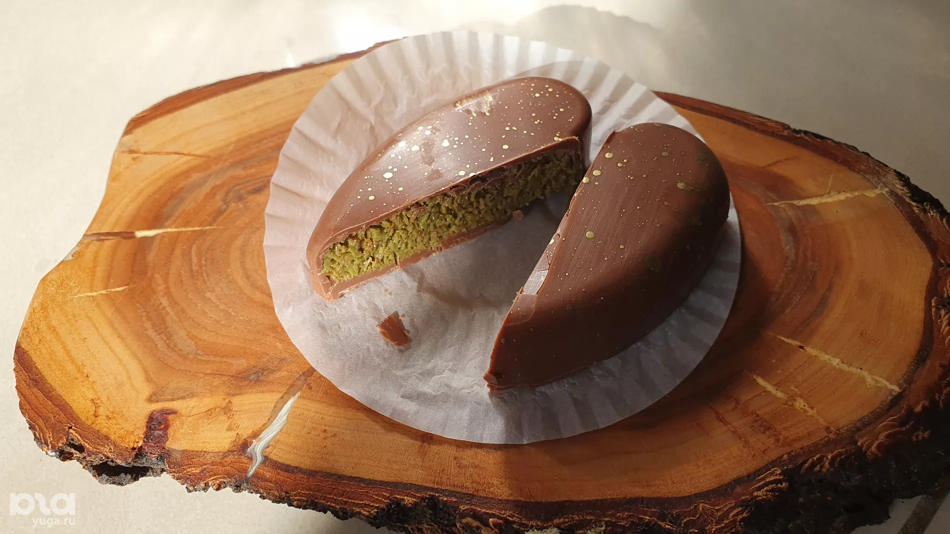 Местная сеть «Табрис» выпустила свои версии шоколада с трендовой начинкой: пирожное «макарон» — 109 рублей, десерты в стаканчиках по 509 рублей (140 г) и песочный чизкейк (550 г) — 1690 рублей.