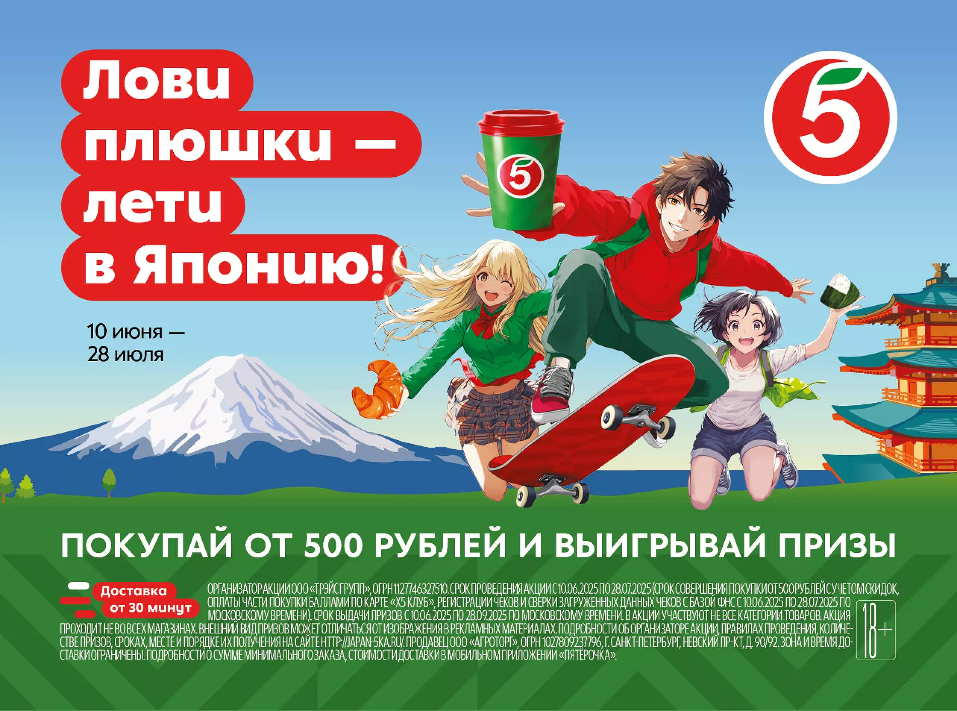 Торговая сеть «Пятёрочка» запускает яркую акцию «Лови плюшки — лети в Японию!», которая придется по вкусу поклонникам аниме, японской культуры и азиатской кухни. Главным призом станет путешествие в Японию — страну высоких технологий, вкусной еды и любимых героев поп-культуры.