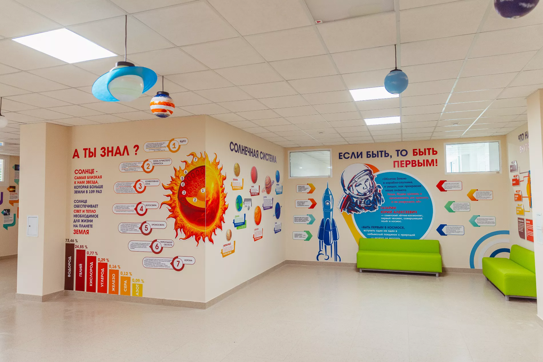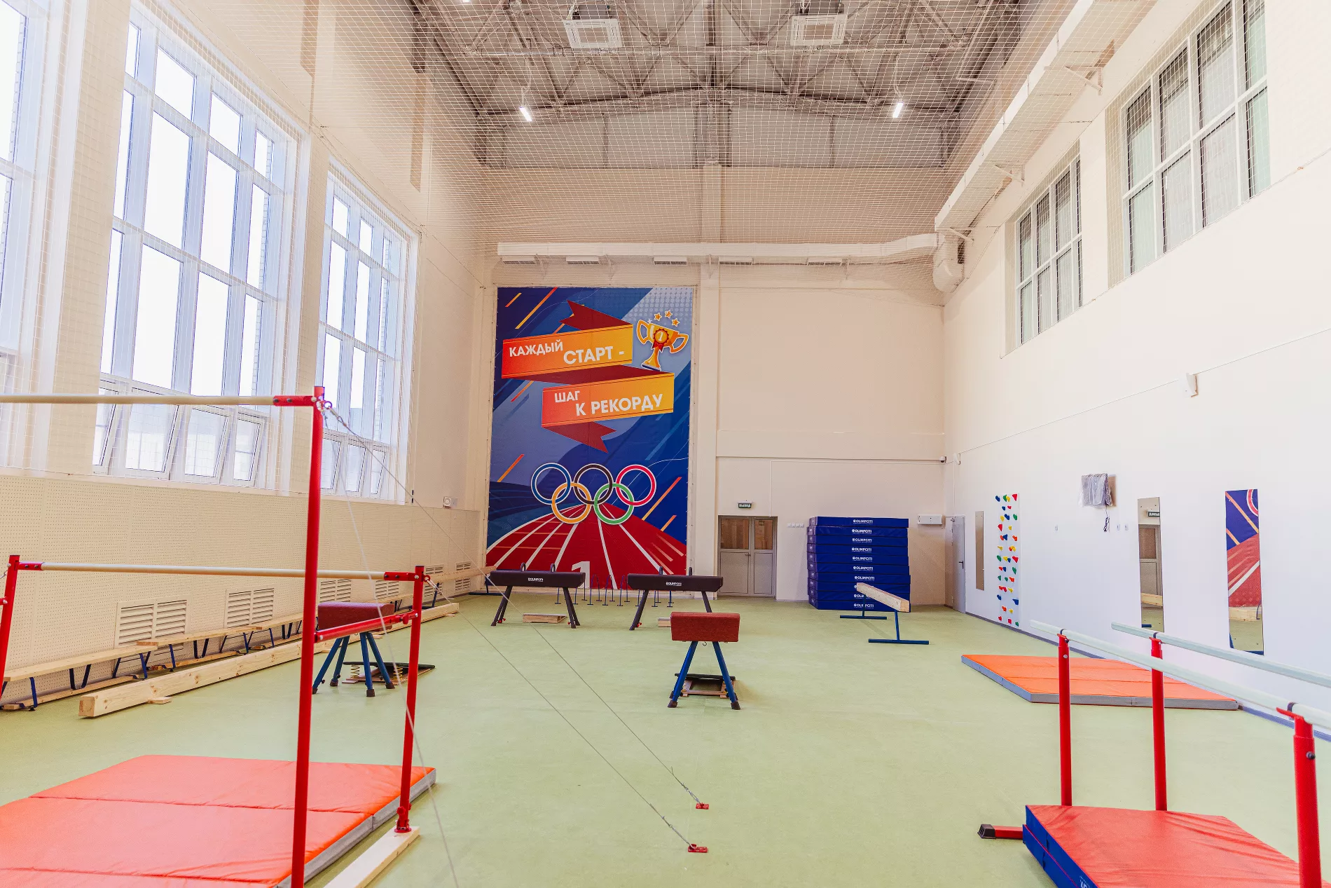 Особое внимание уделили спортивной инфраструктуре. Внутри — три универсальные площадки, залы для самбо, гимнастики и тренажерный зал. Снаружи — футбольное поле, беговые дорожки и зоны для легкой атлетики.