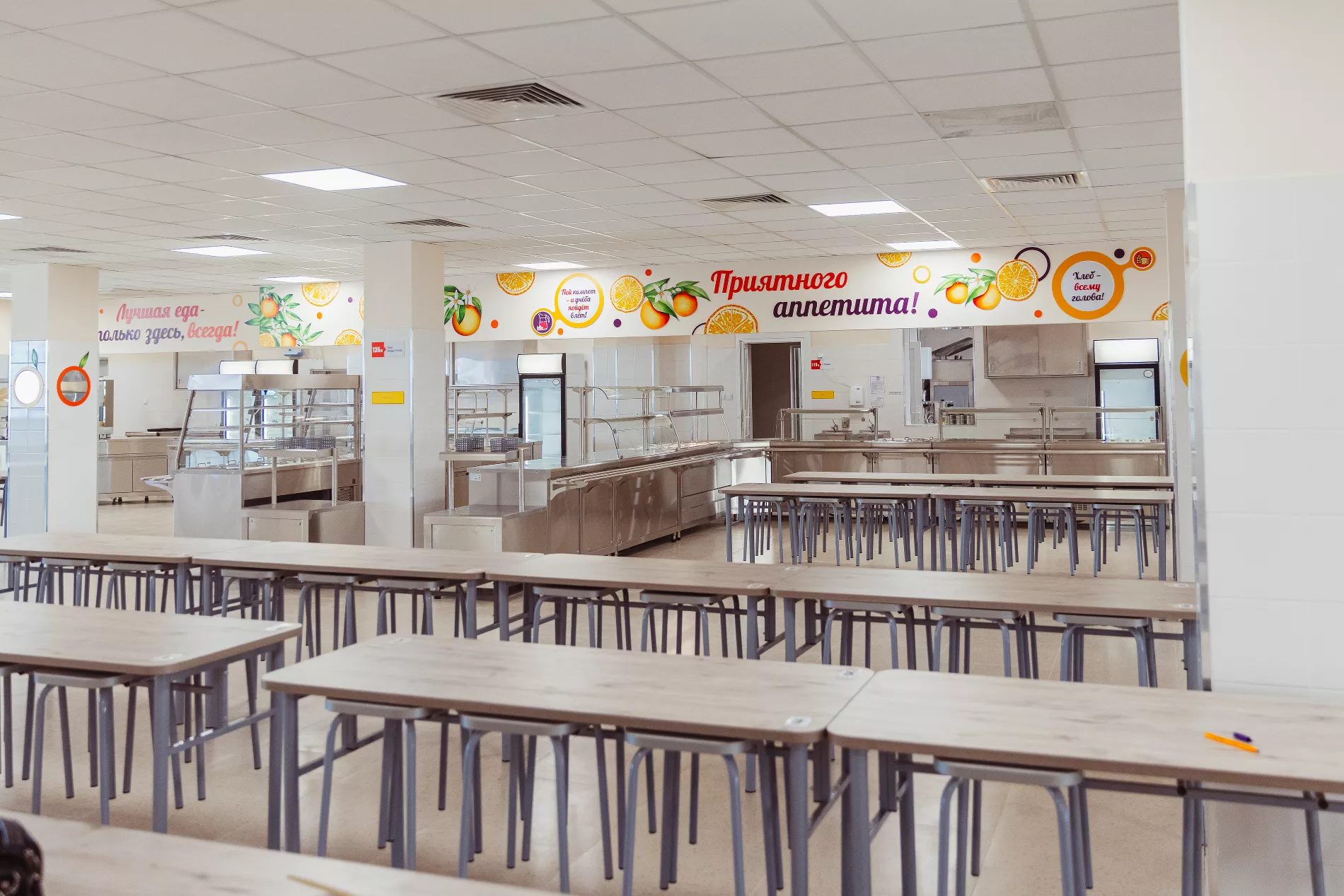 Две столовые — на 350 мест для младших классов и на 588 — для старших — полностью укомплектованы всем необходимым.