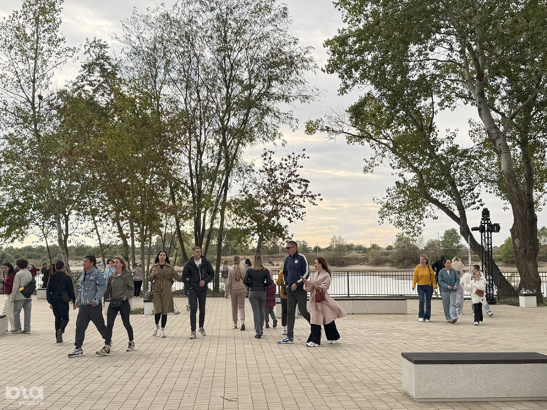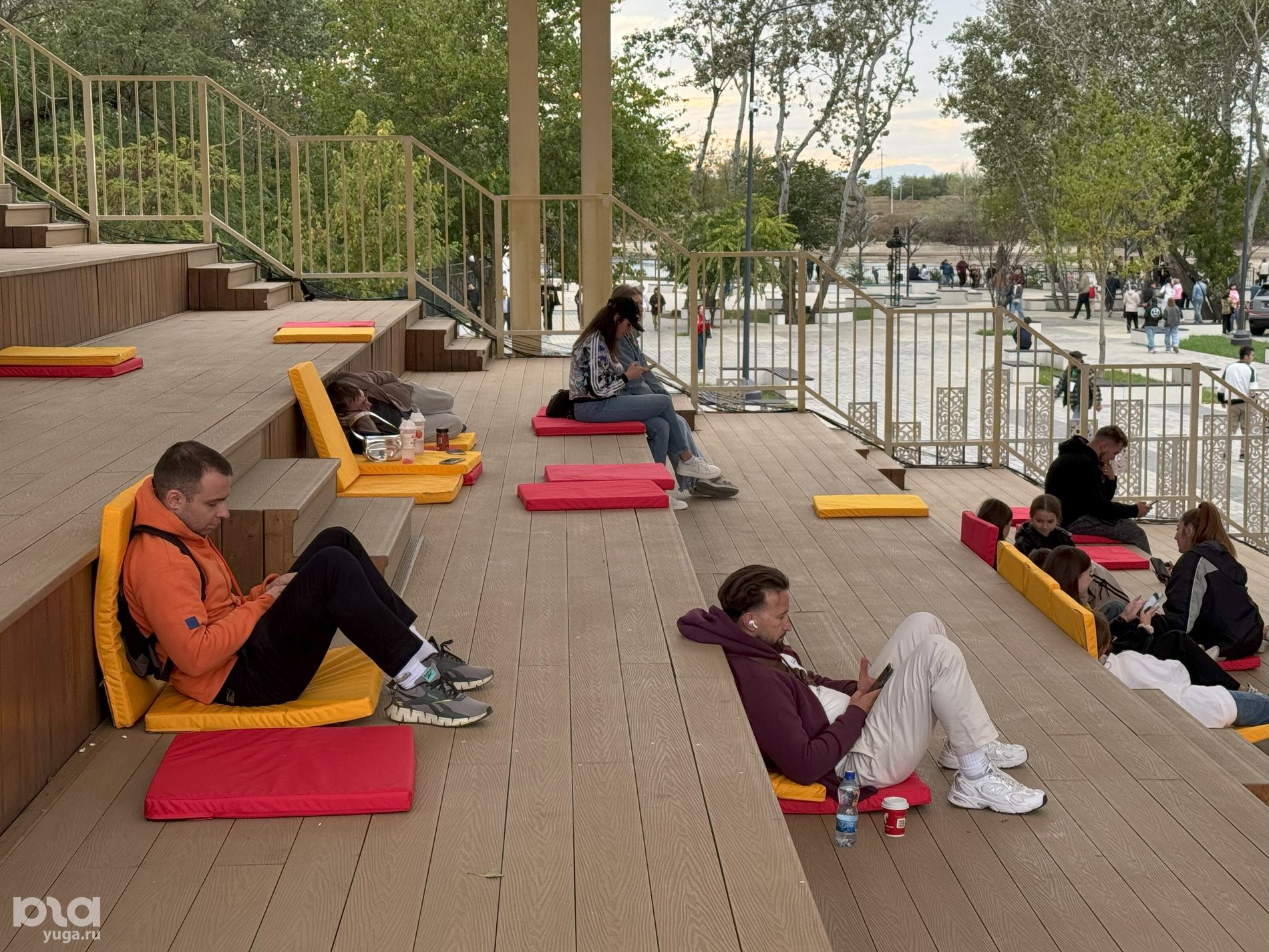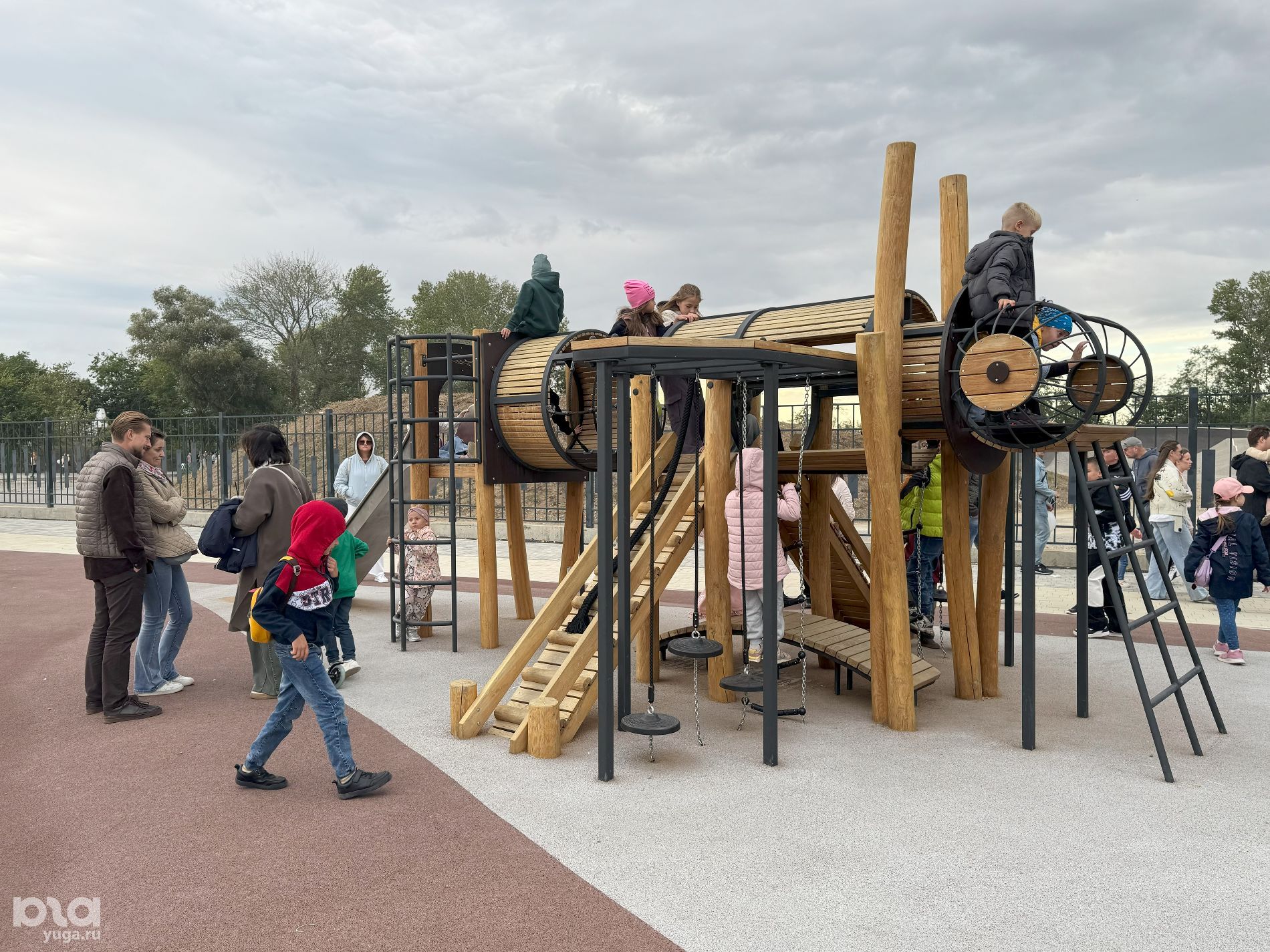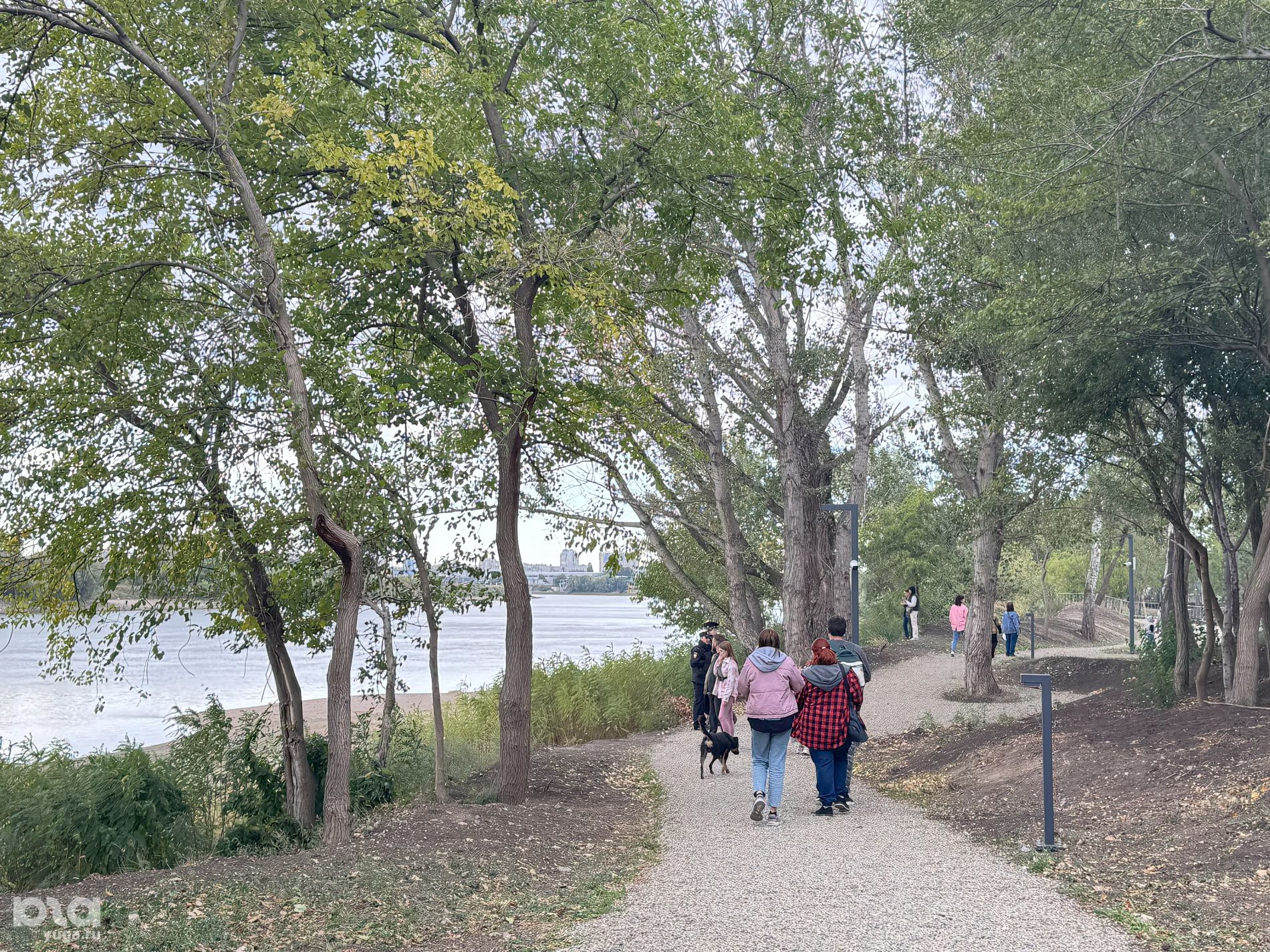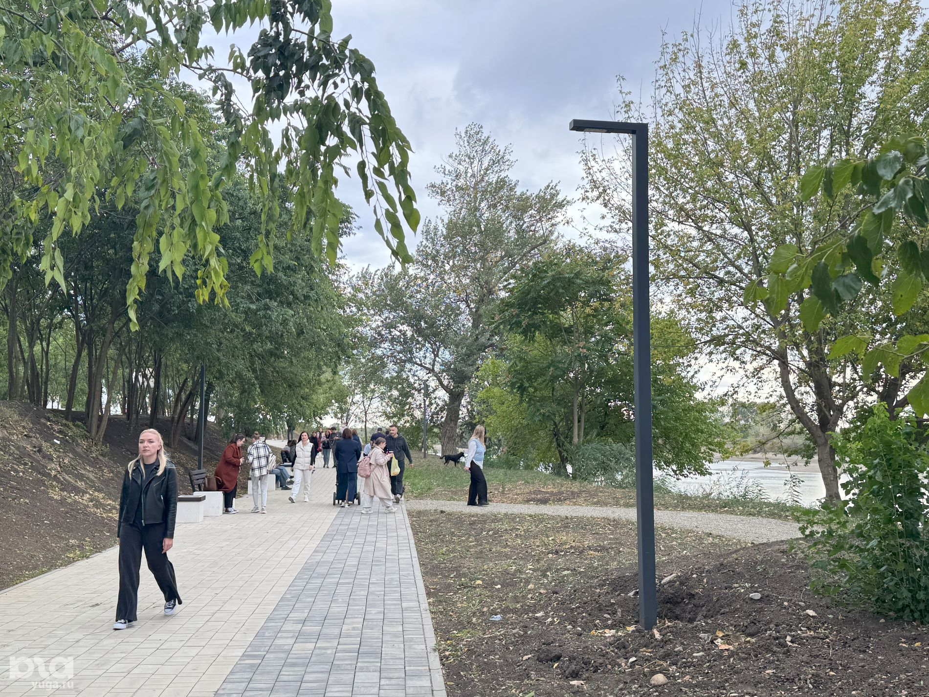 В конце площадки есть выход к реке Кубань, где оборудовали небольшой участок набережной: установили лавочки и освещение.