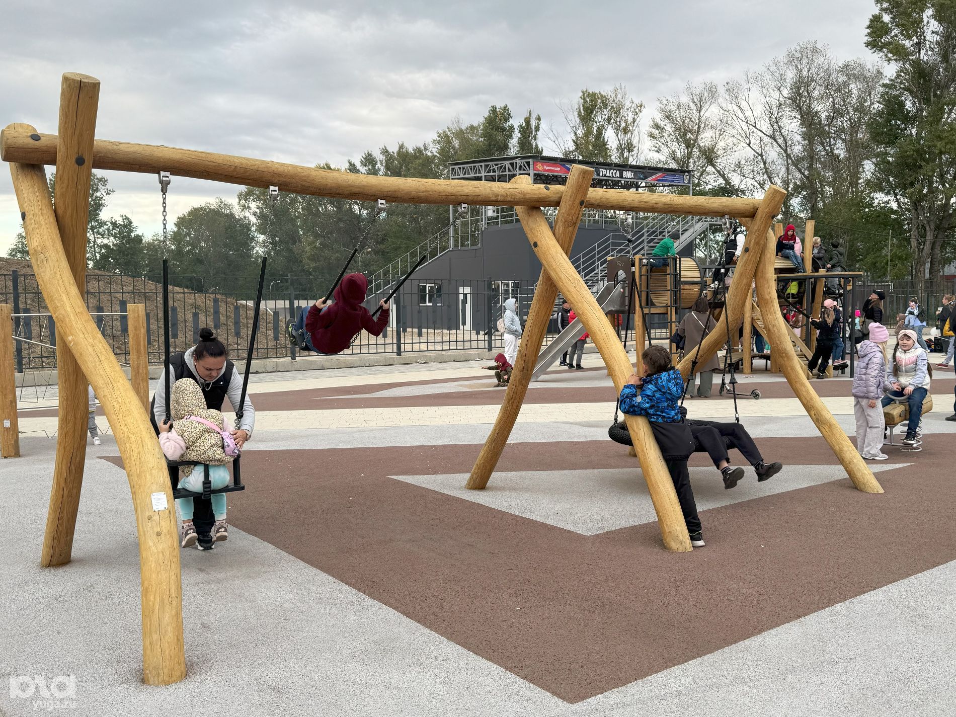 Большая концертная сцена, спортивные площадки, детский городок с качелями и горками из дерева, зоны отдыха с лавочками. Однако все эти объекты разбросаны по разным частям территории почти в 7 га, из-за чего без людей она будет выглядеть пустовато.